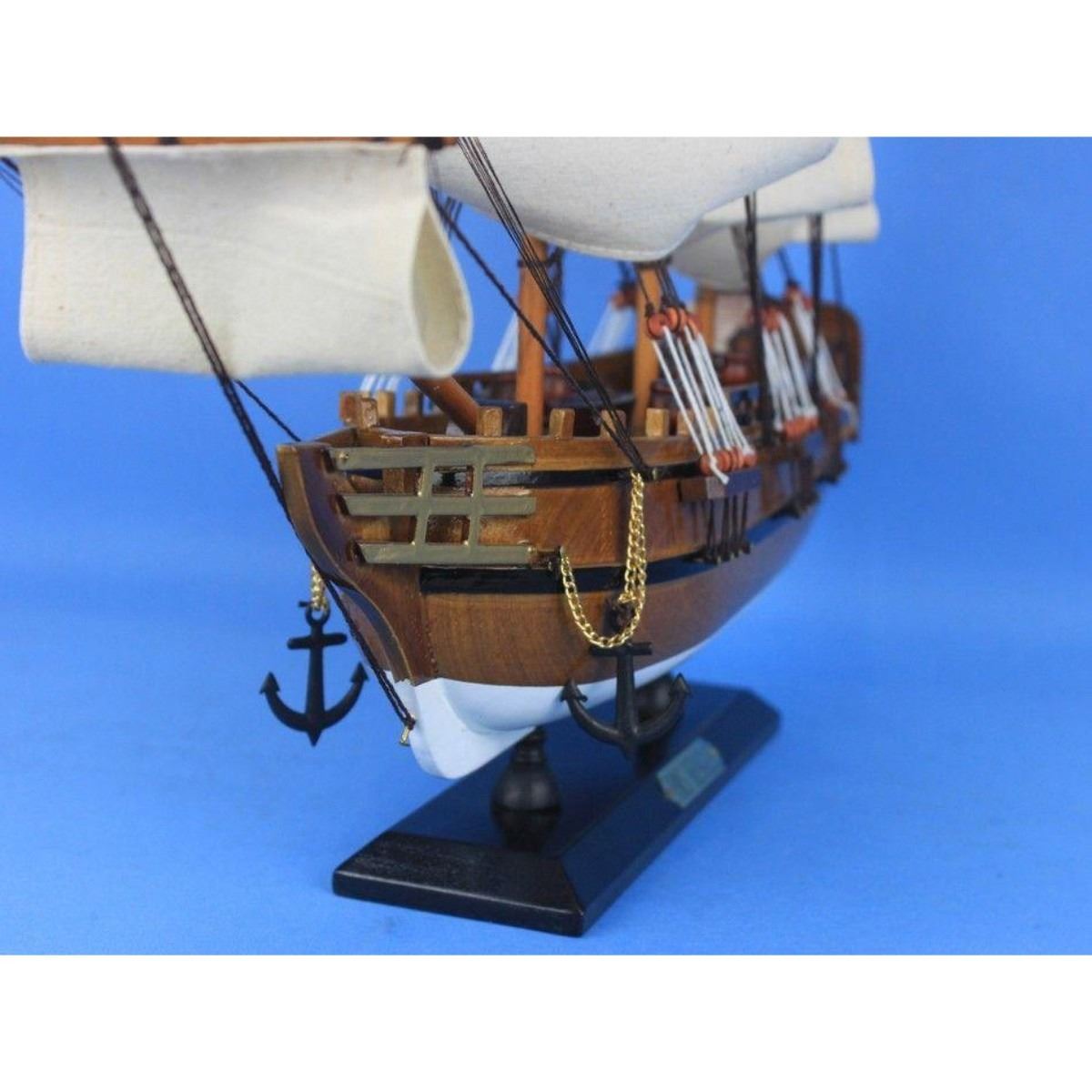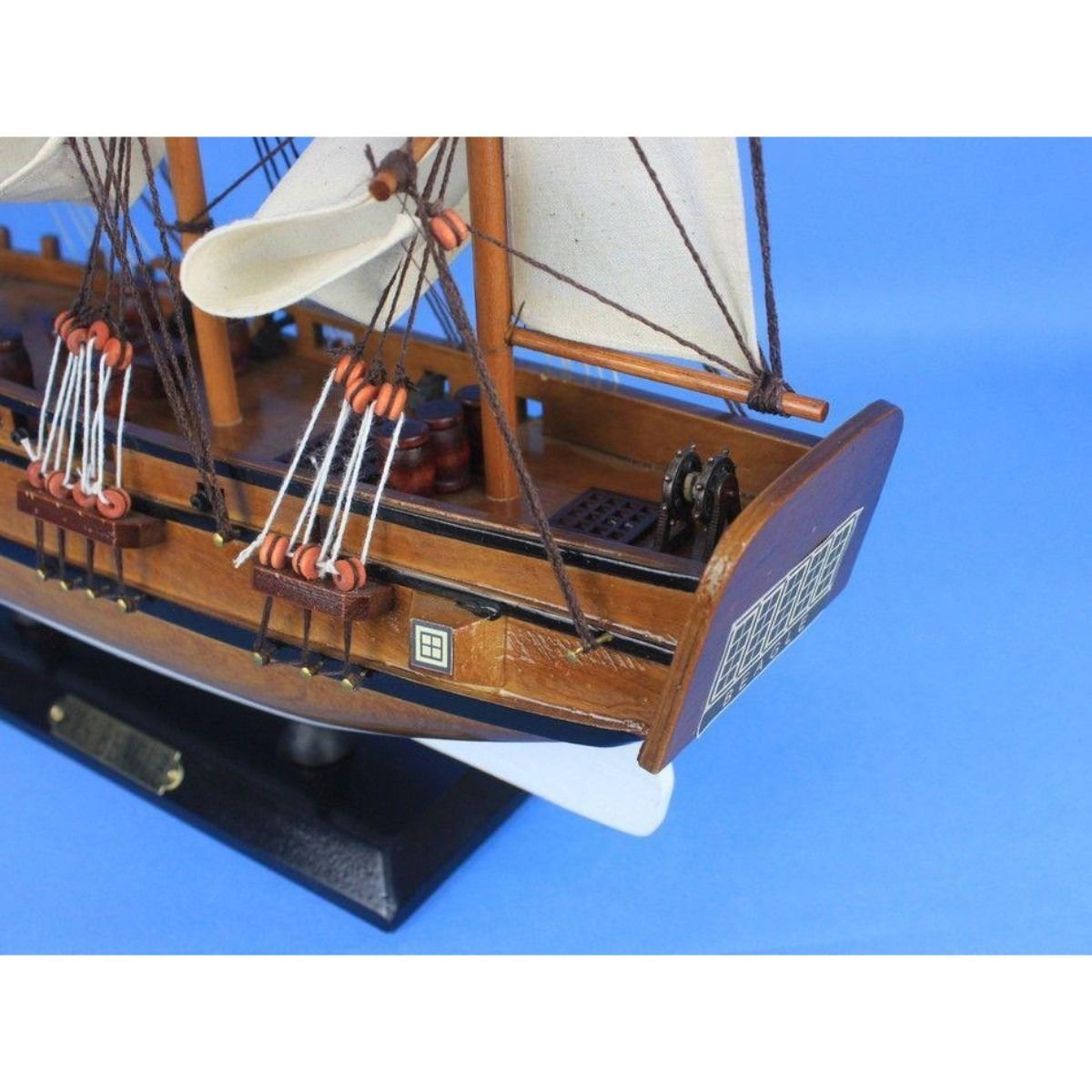 Wooden Charles Darwins HMS Beagle Tall Model Ship 20" SOLD FULLY ASSEMBLED Ready for Immediate Display - Not a Model Ship kit Inspired by the HMS Beagle, famed exploration ship that carried naturalist Charles Darwin to the Galapagos Islands, these adorable tall ships models rest easily upon any desk or shelf. Add a touch of nautical history to the decor of any room with this tall model ship. 20" Long x 4" Wide x 18" High Arrives fully assembled with all sails mounted Handcrafted wooden hull and masts Woods used in construction include cherry, birch, maple and rosewood 12 handsewn white cloth sails Metal nameplate on wooden base identifies the ship as the HMS Beagle