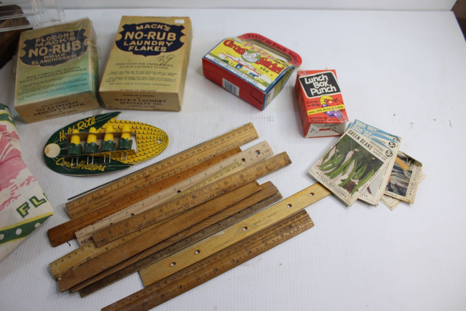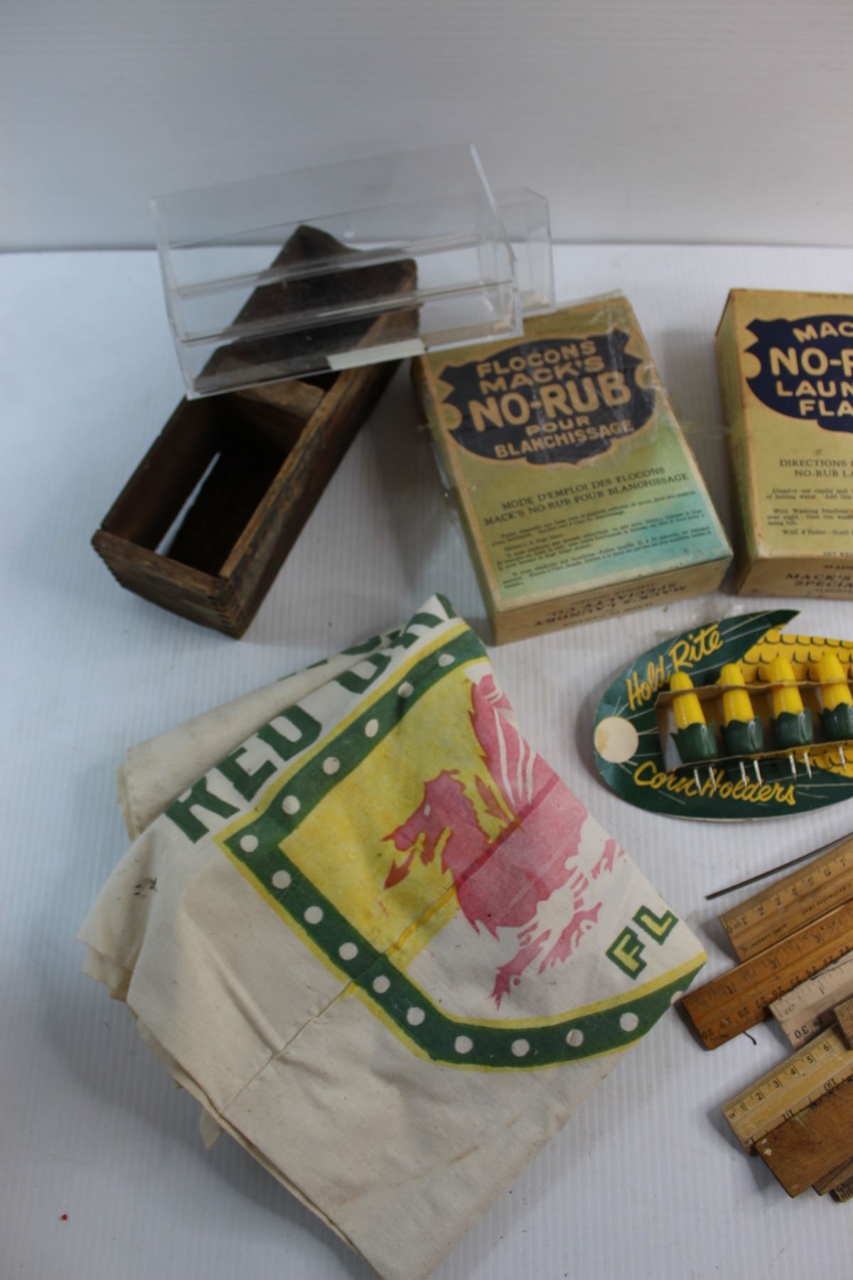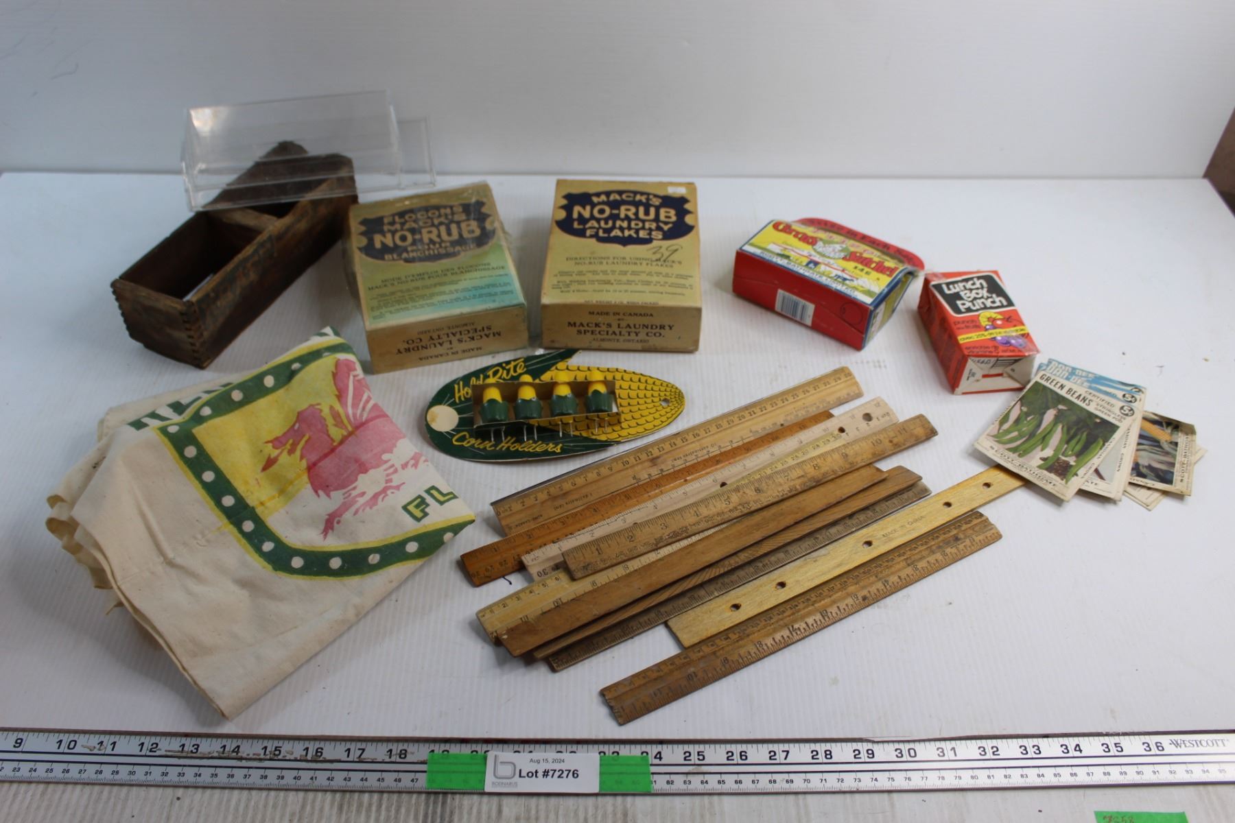 Wooden Cheese Box, Collectible Rulers, Corn Holders and Assorted Collectible Items