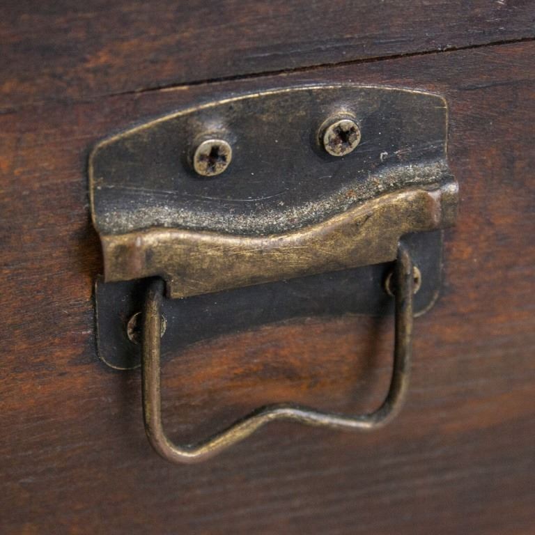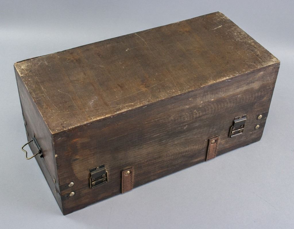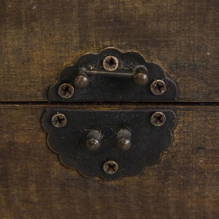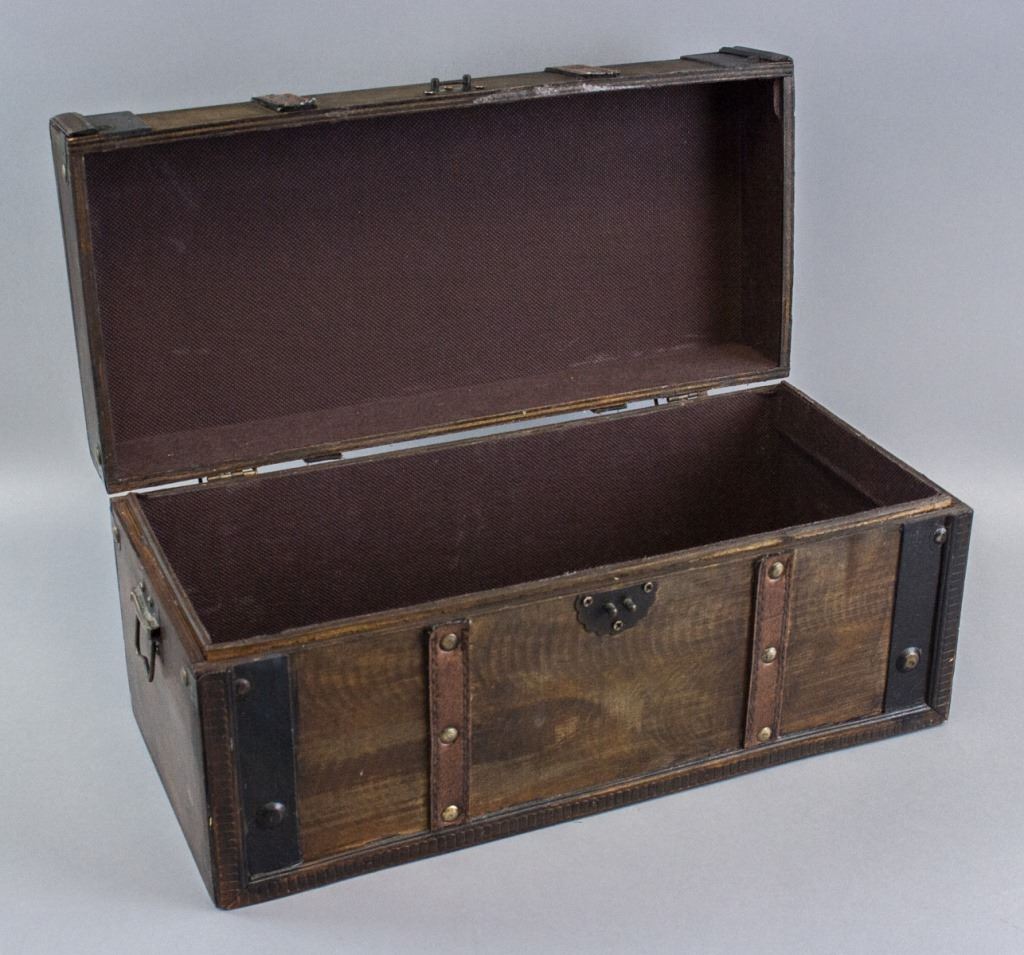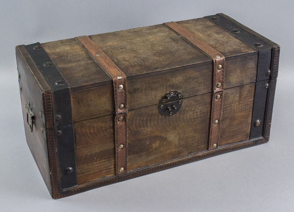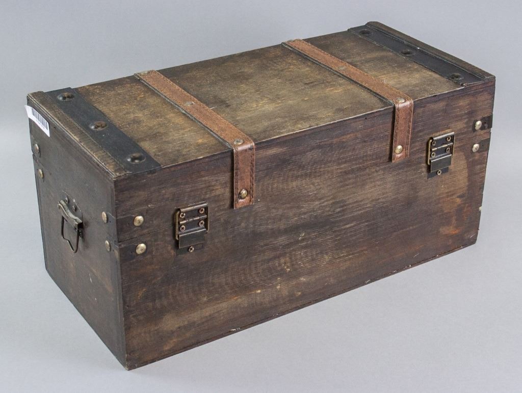 Wooden chest. Of dark brown tone, with brown leather straps. Lock broken. A handle on each side. 18 x 38 cm. 1,161 grams.