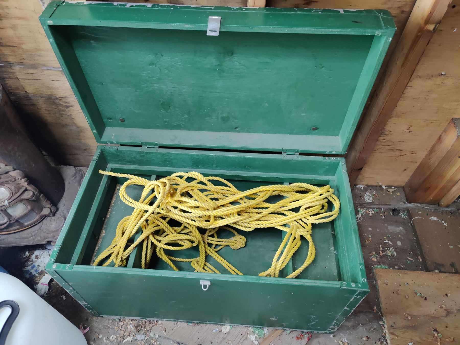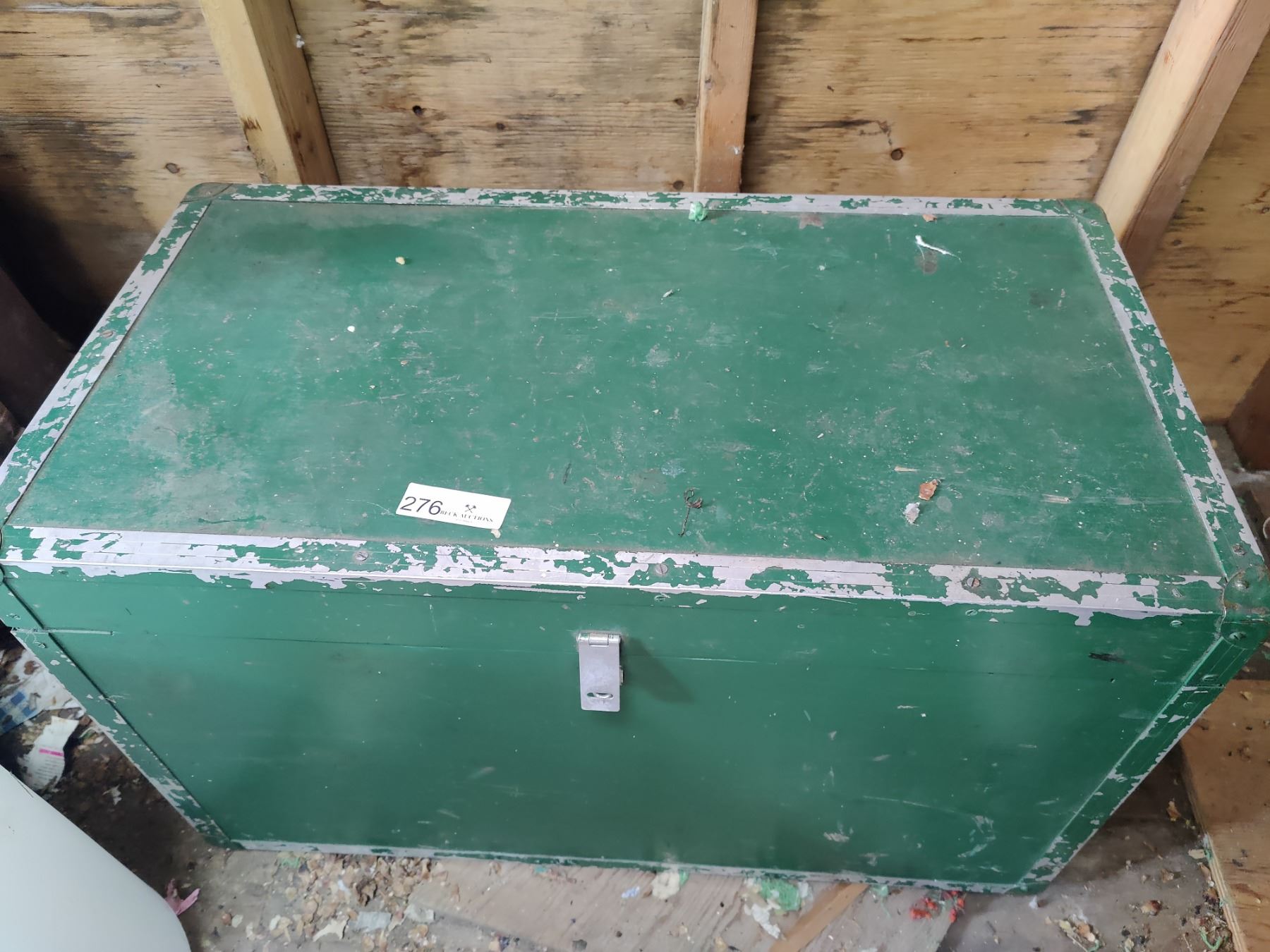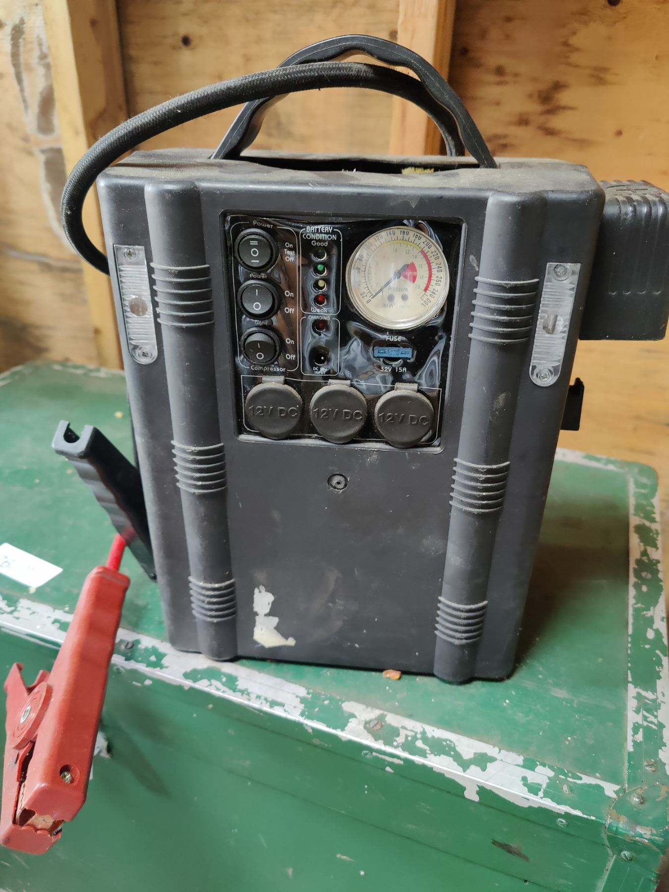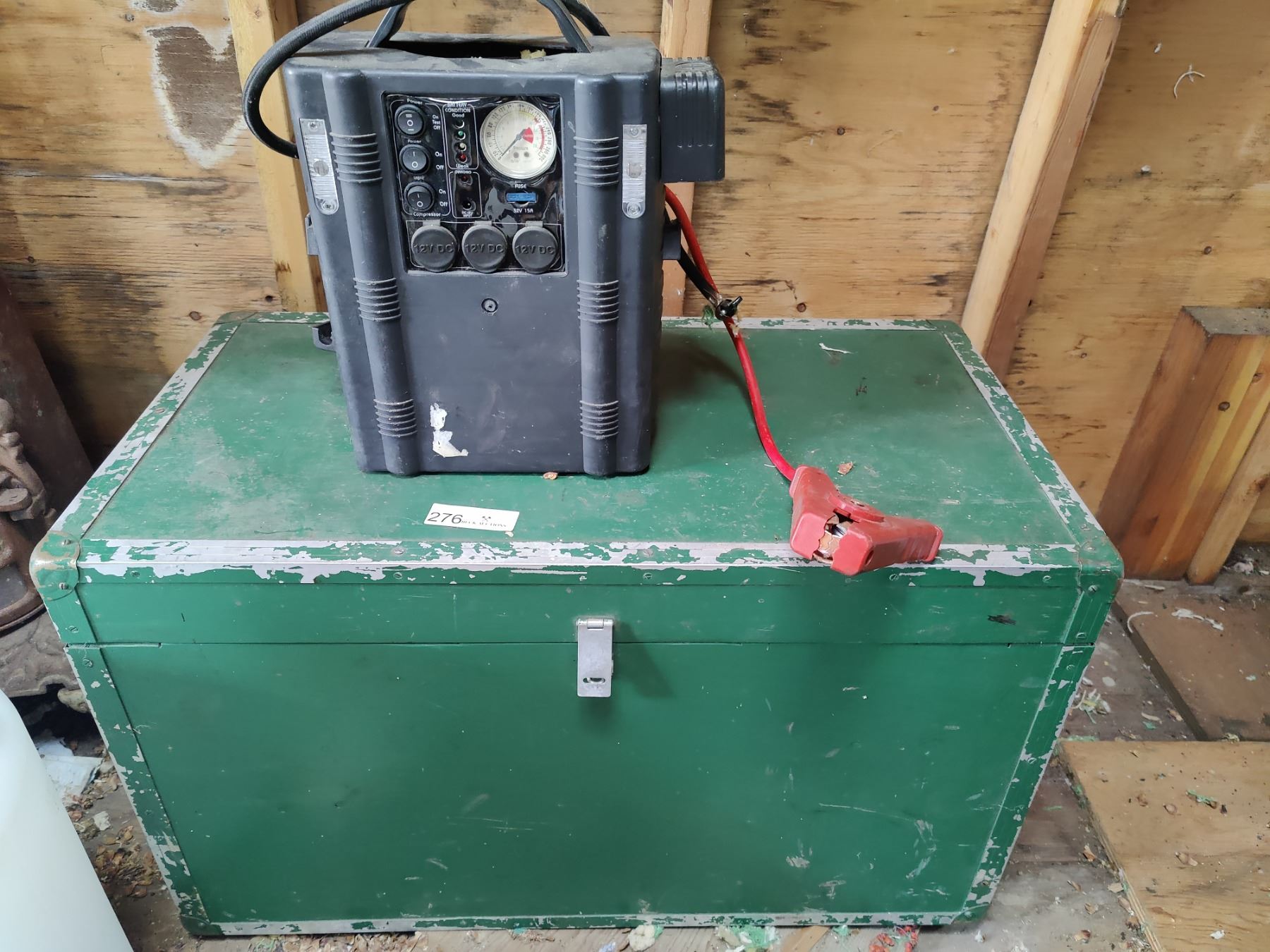 Green wooden storage chest with remote jumpstarter/power bank/air compressor.