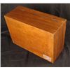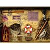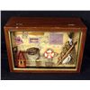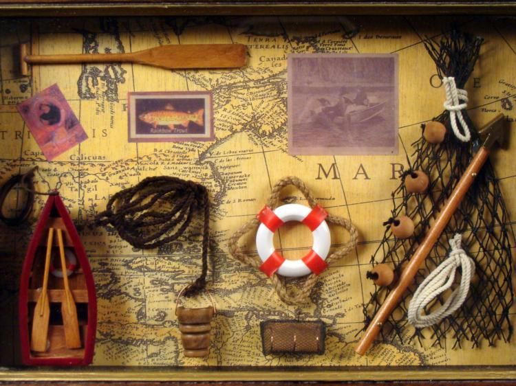 Who doesn't like to fish? Take your fancy boat onto the water, throw back a couple of drinks with some buddies, and sit and wait for that big catch... Well here is something that can hopefully help you out. Here we have a wooden chest with a very decorative display cover. The cover is made of glass but what it depicts is intriguing. There are several items in this display, so we'll name a few. There is a map of North America, picture of a Rainbow Trout, a lifesaver, a net, a spear, a row boat, a paddle, etc. The frame has been painted gold, there are two hinges in the back, and metal clasp in the front that is in a shape of a sea shell. It's dimensions are 9" x 13" x 5" and is in good condition with some chips and slight scratches to the wood. This chest is a great for storing your fishing equipment, so place your bids today before this item floats away... *