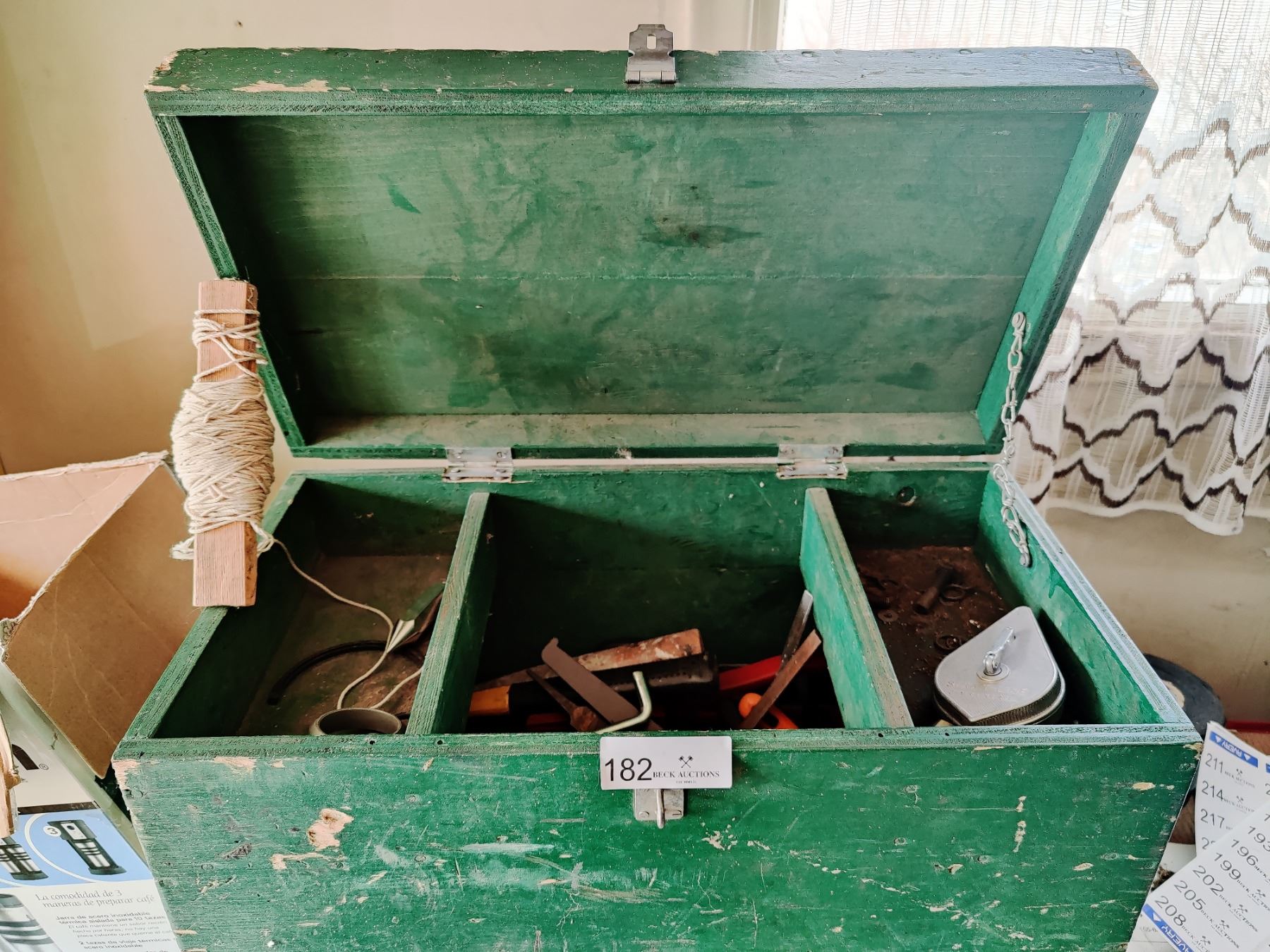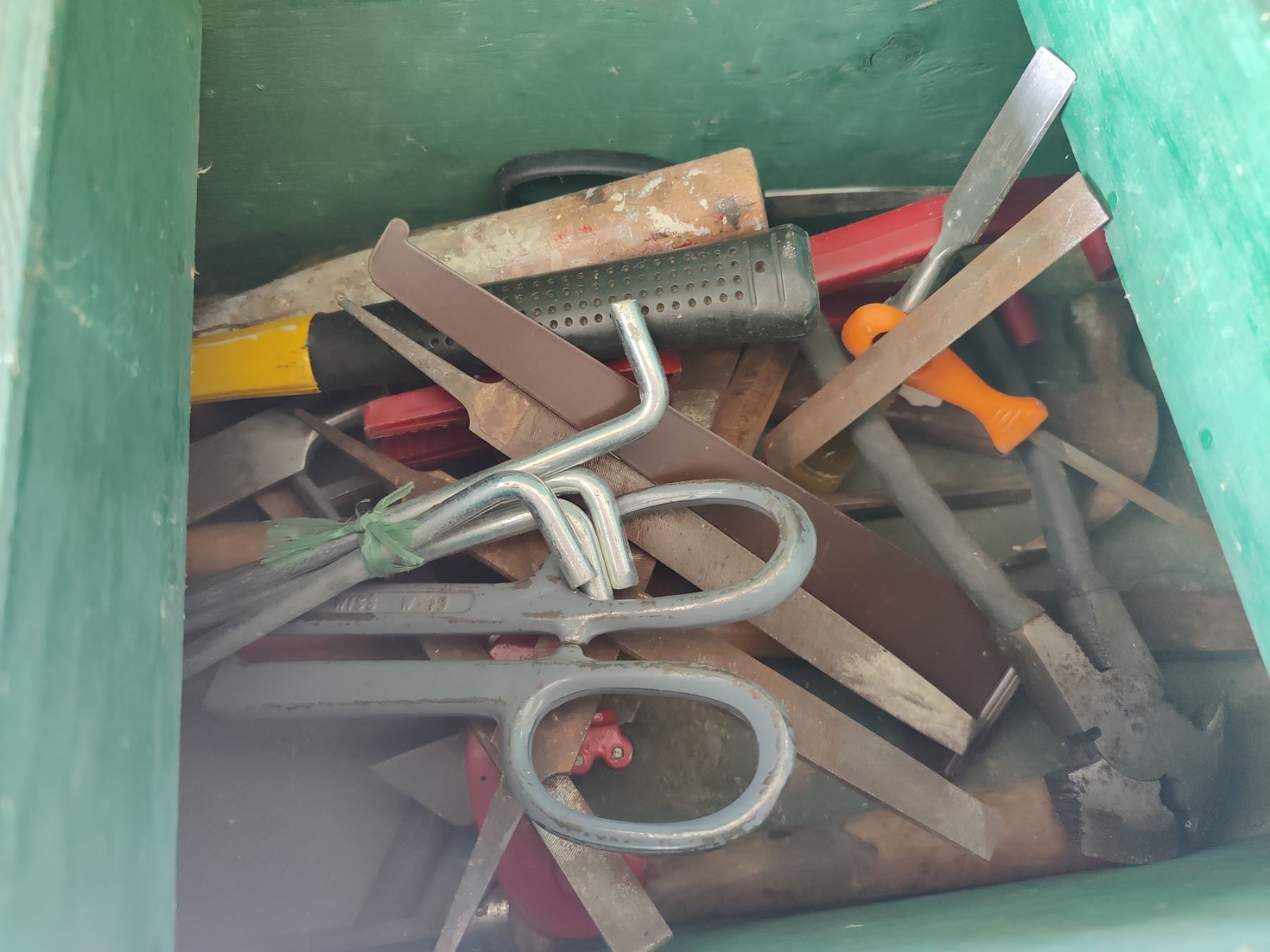 Green painted wooden chest with assorted hand tools including hammers, files, and more.
