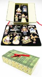 Wooden 12 piece ornament set with gift box. Each ornament measures a different size with the cane being the tallest at 7.25"H. They are all .5"D.