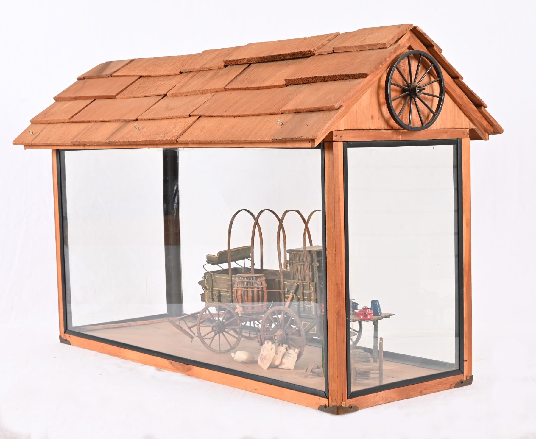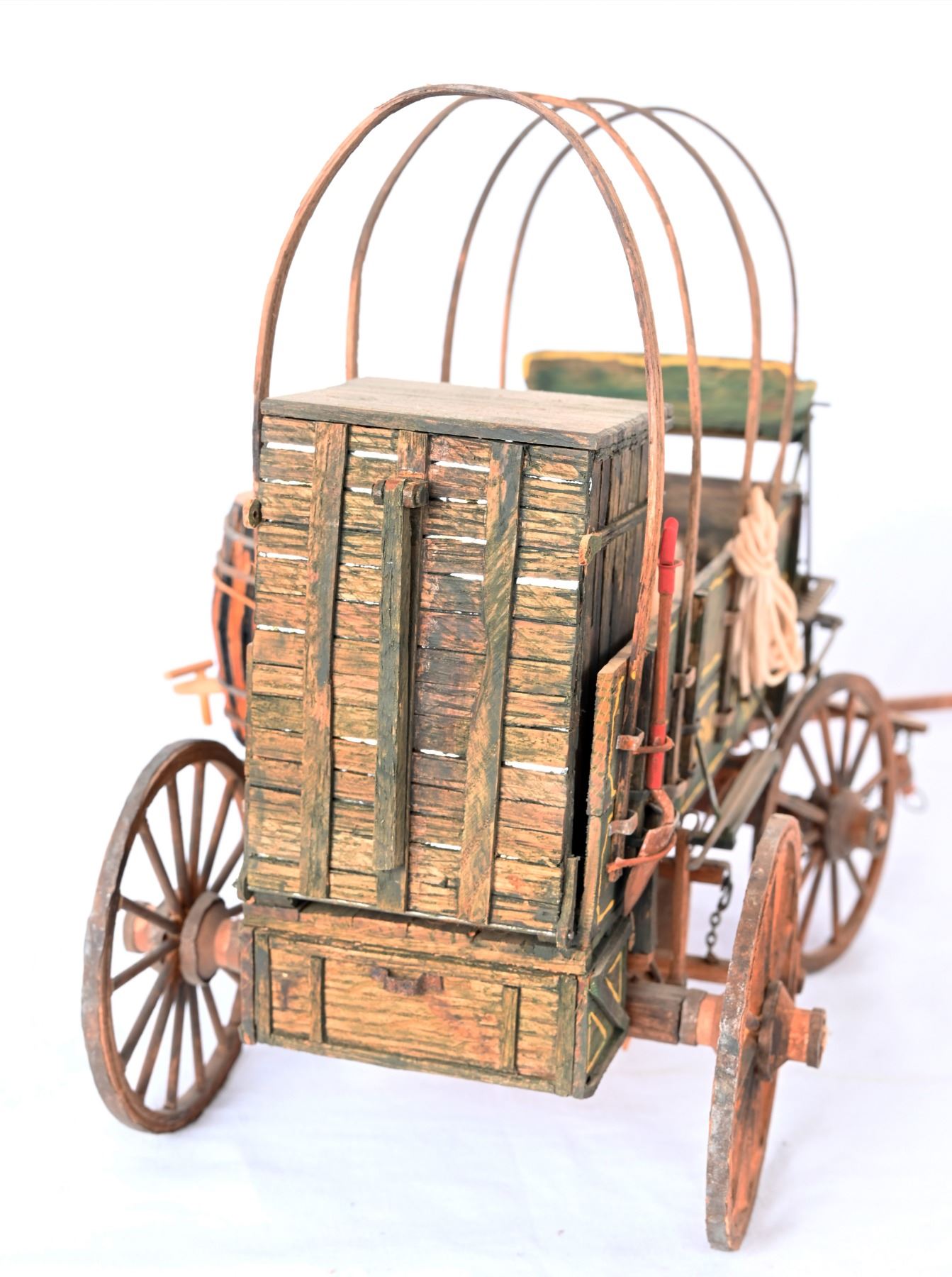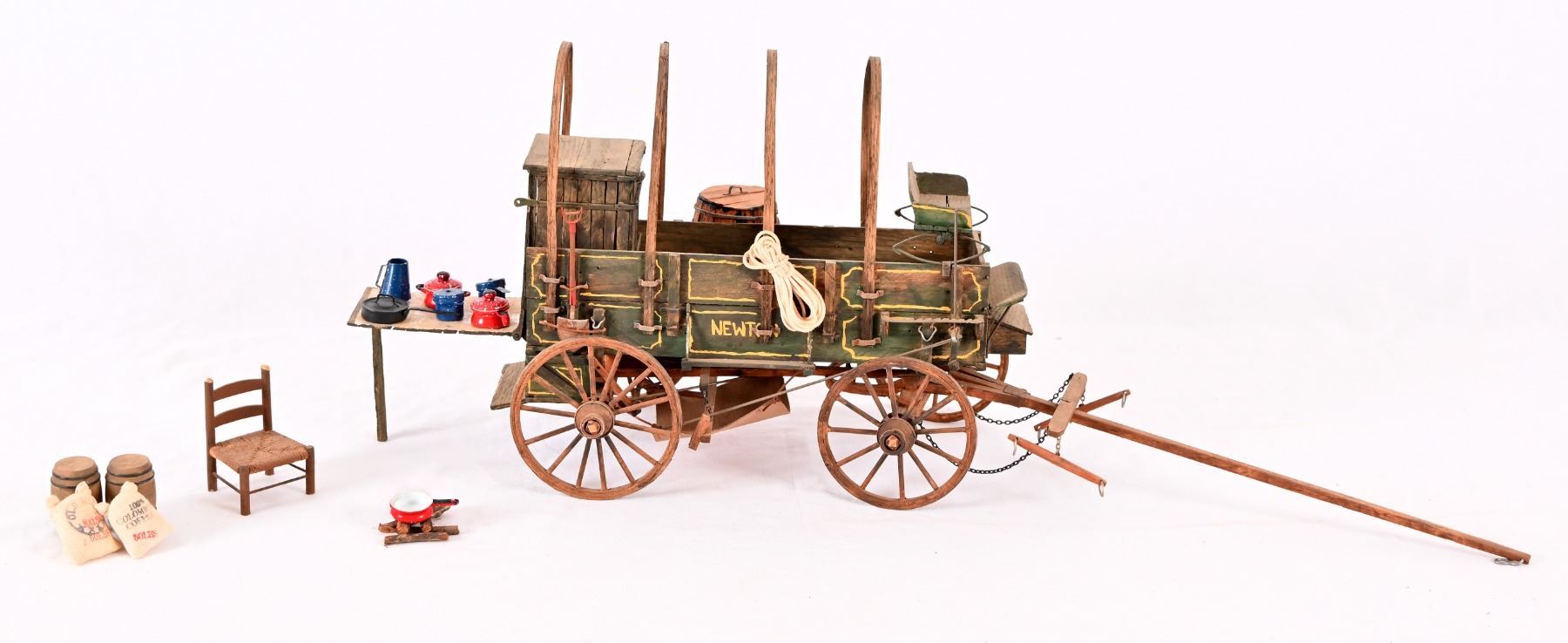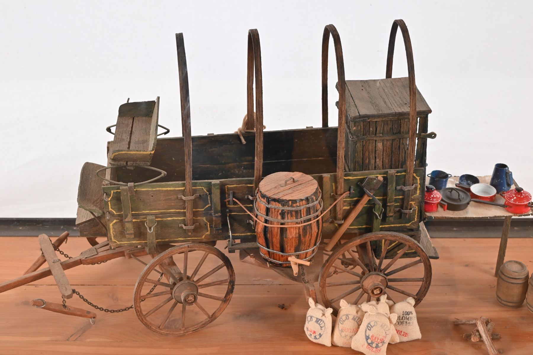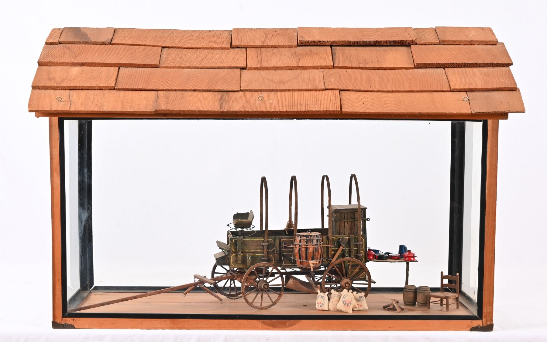 Very nicely done wooden model chuck wagon with accessories. Measures 8" wide x 10" tall x 25" in length, to the end of the tongue. Includes custom "Wagon House" display case