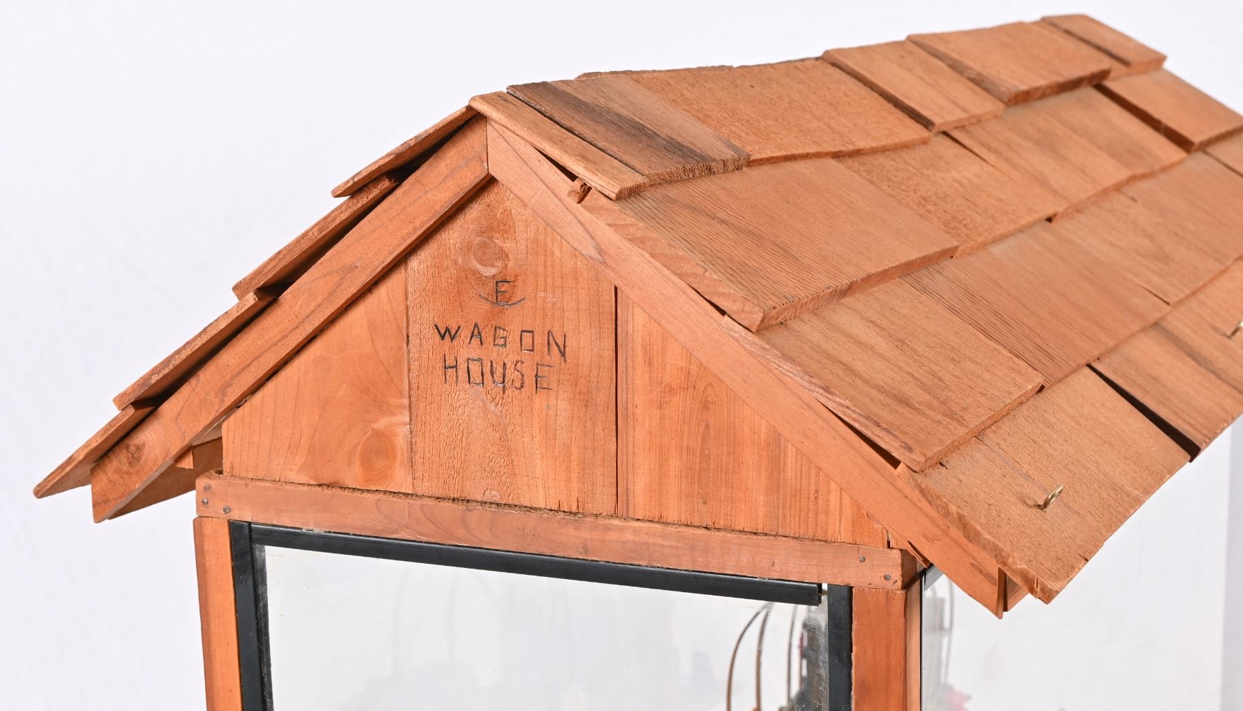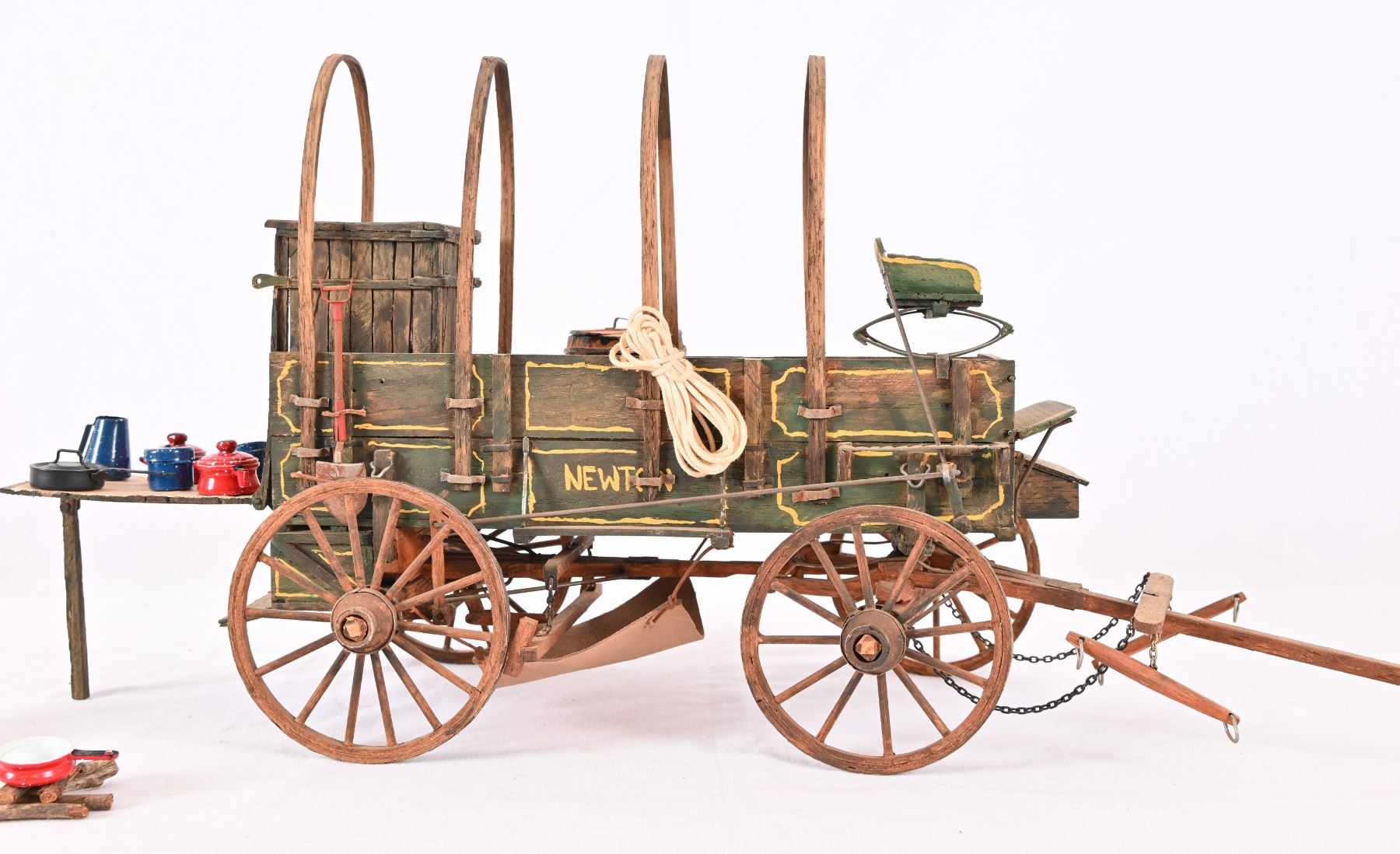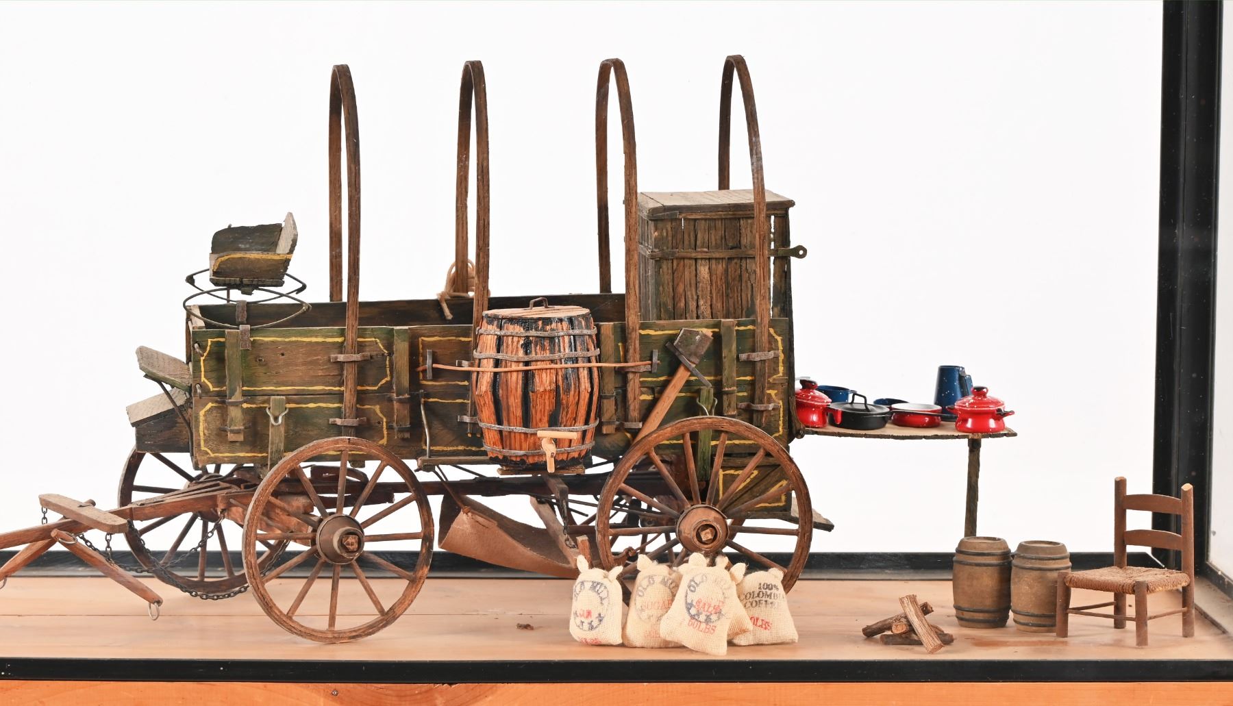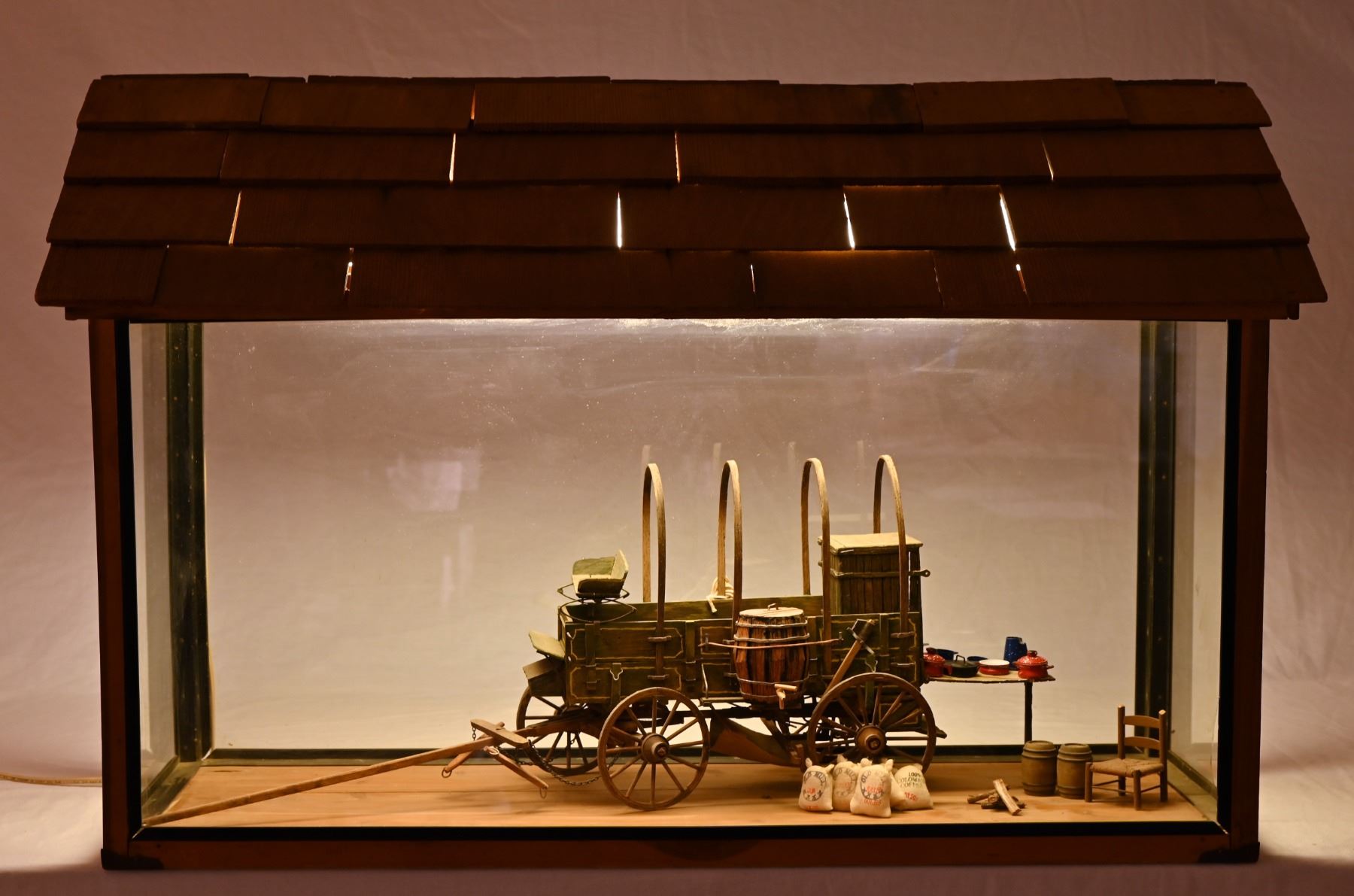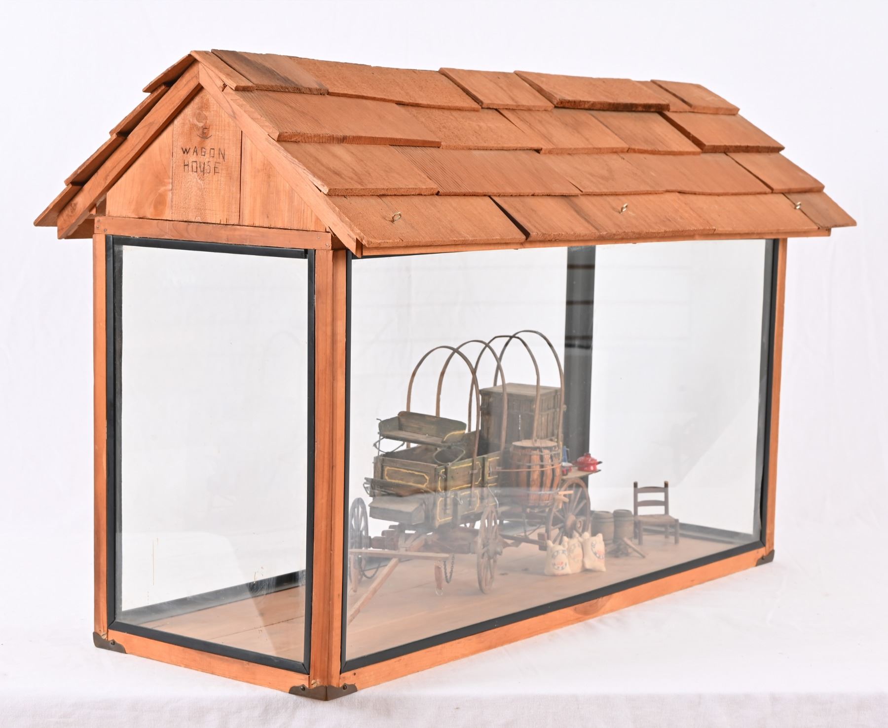 Very nicely done wooden model chuck wagon with accessories. Measures 8" wide x 10" tall x 25" in length, to the end of the tongue. Includes custom "Wagon House" display case