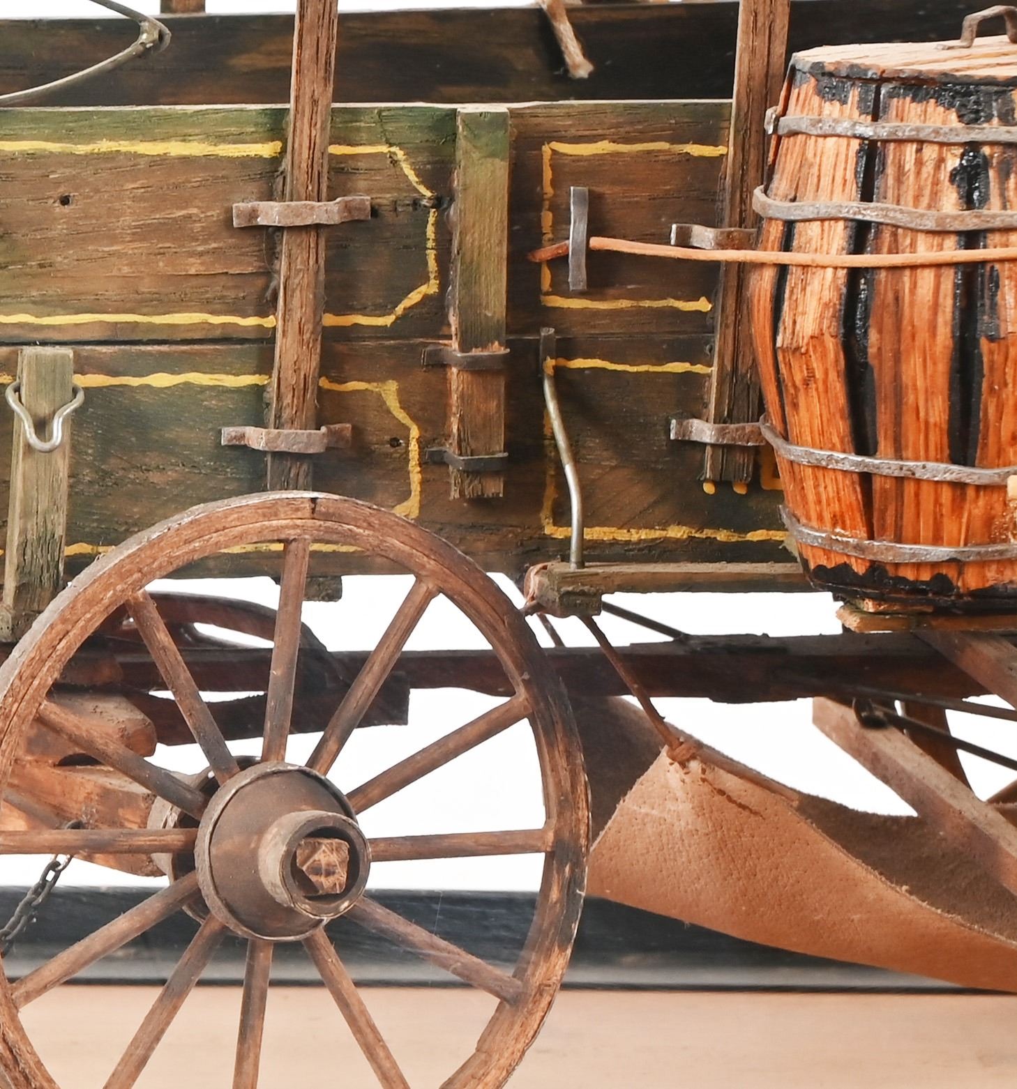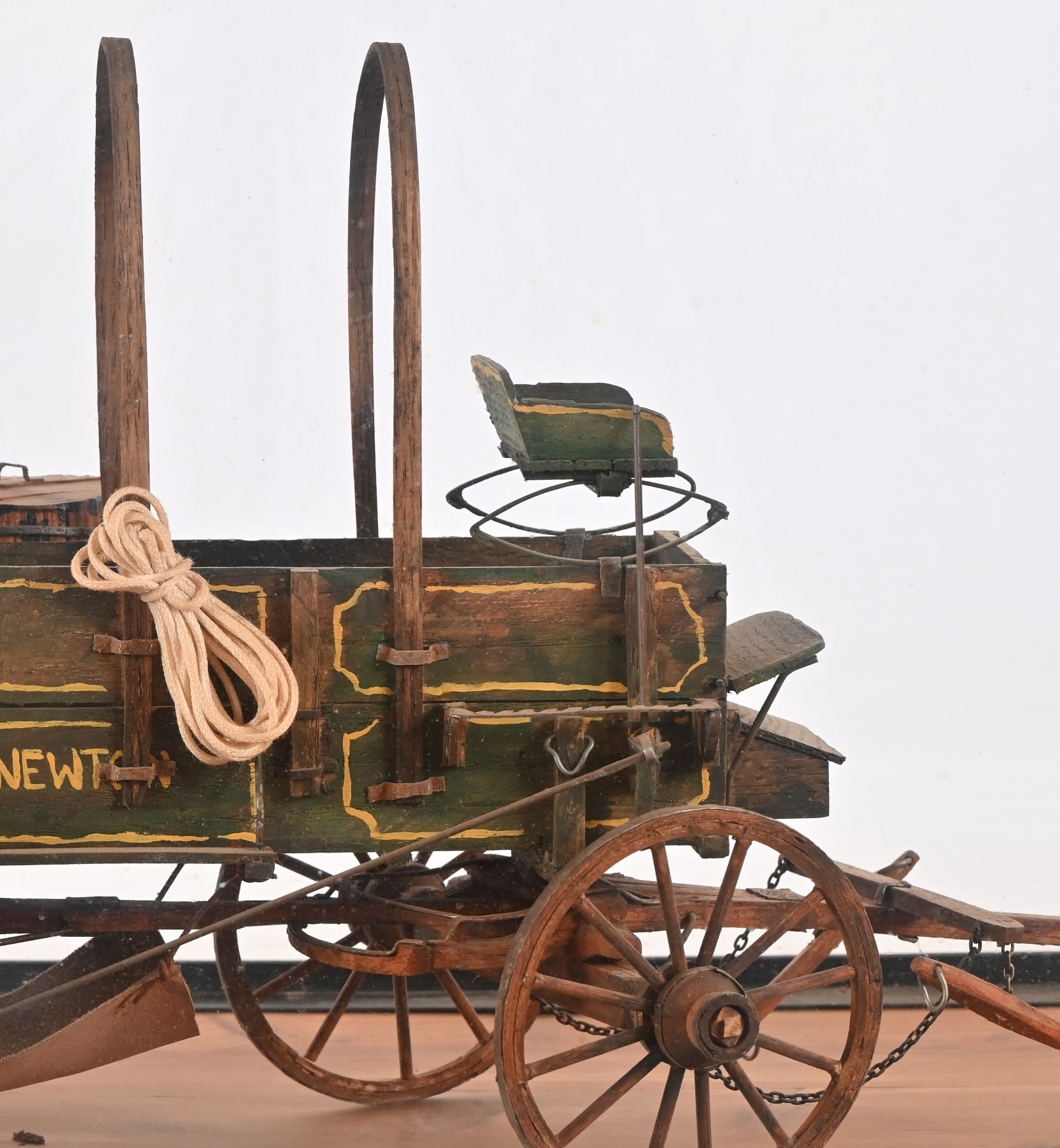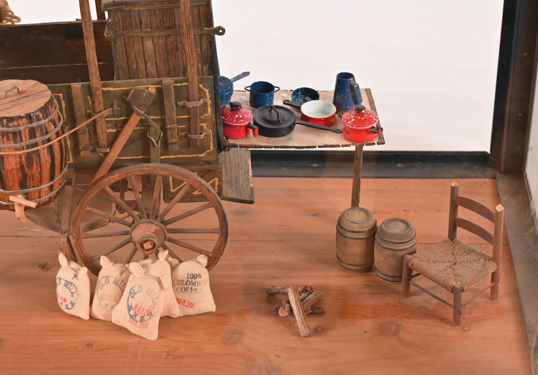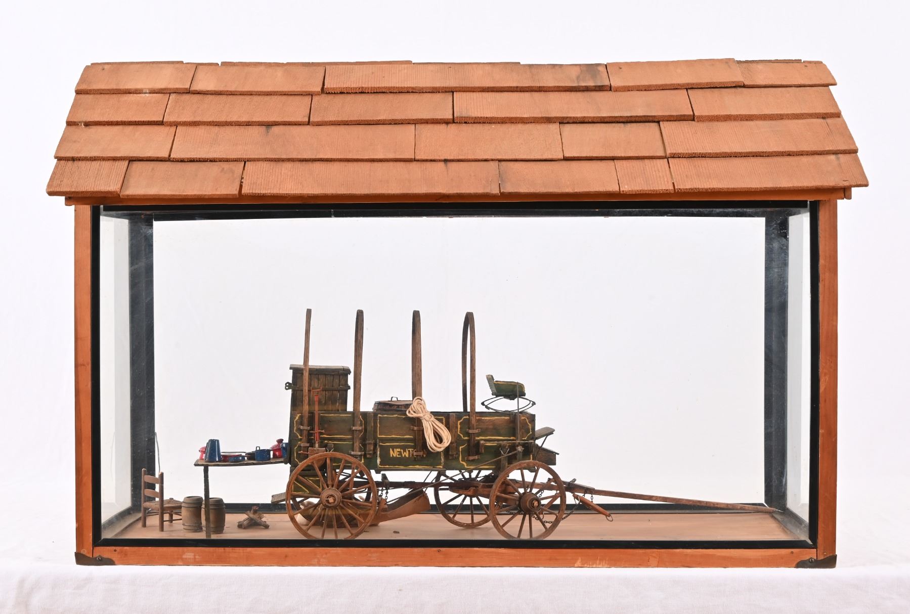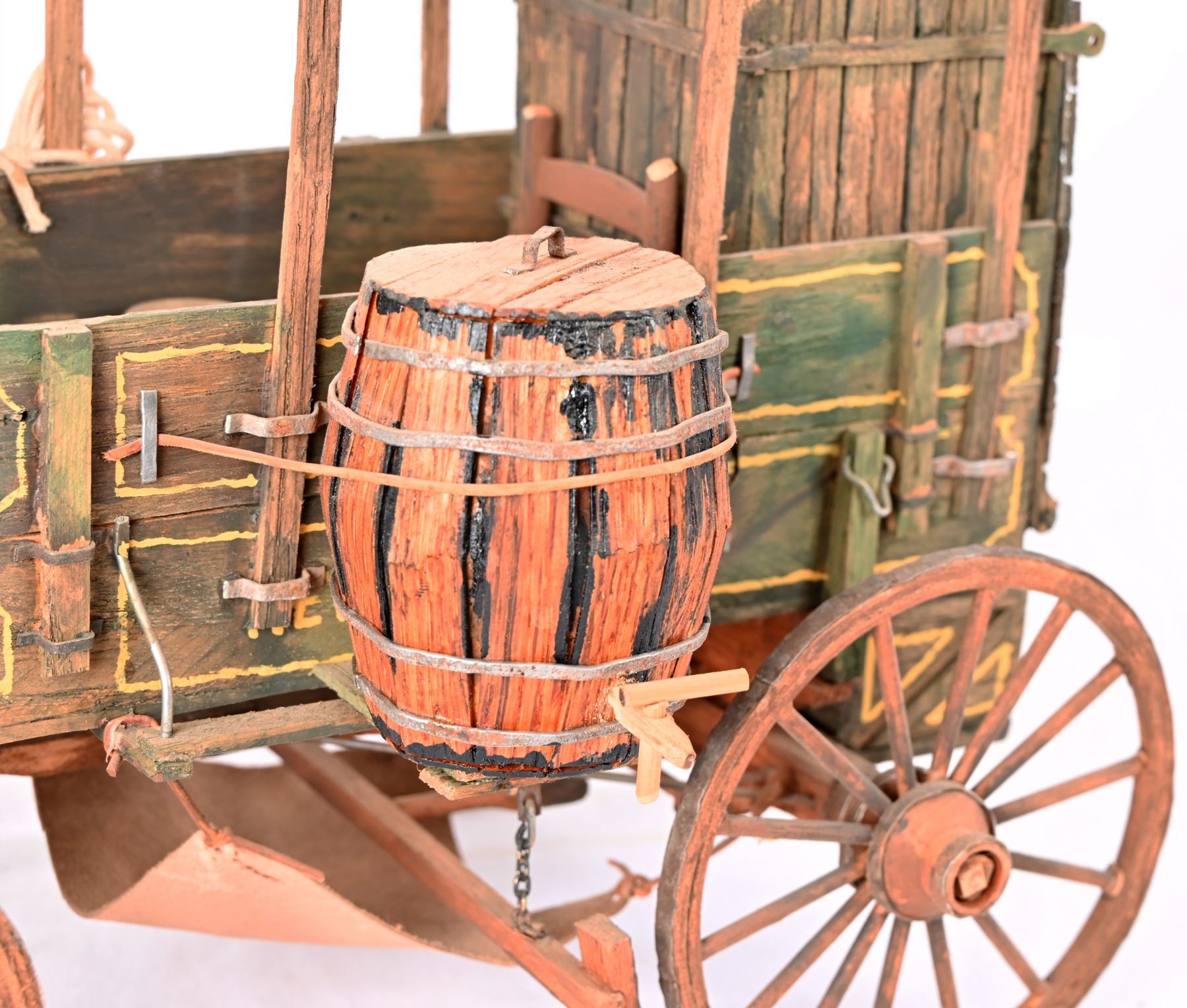 Very nicely done wooden model chuck wagon with accessories. Measures 8" wide x 10" tall x 25" in length, to the end of the tongue. Includes custom "Wagon House" display case