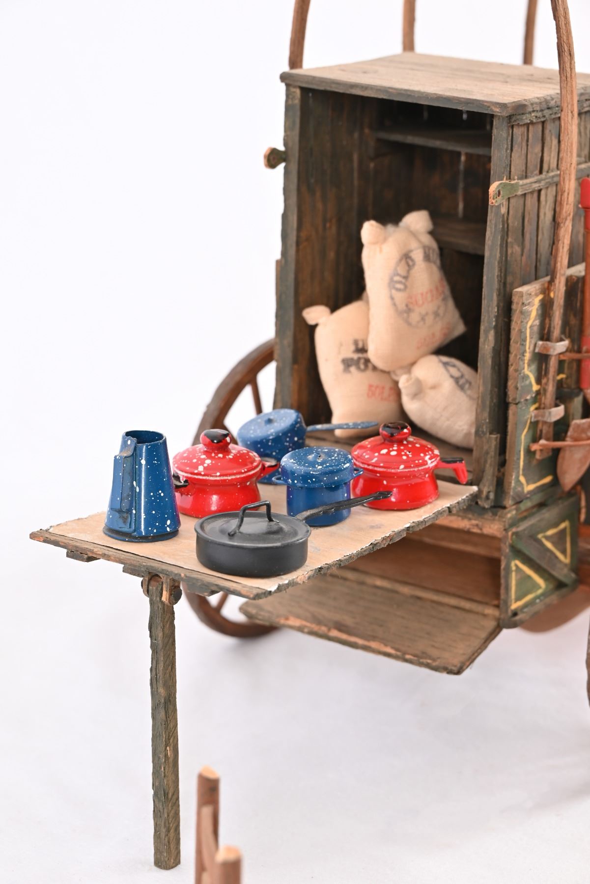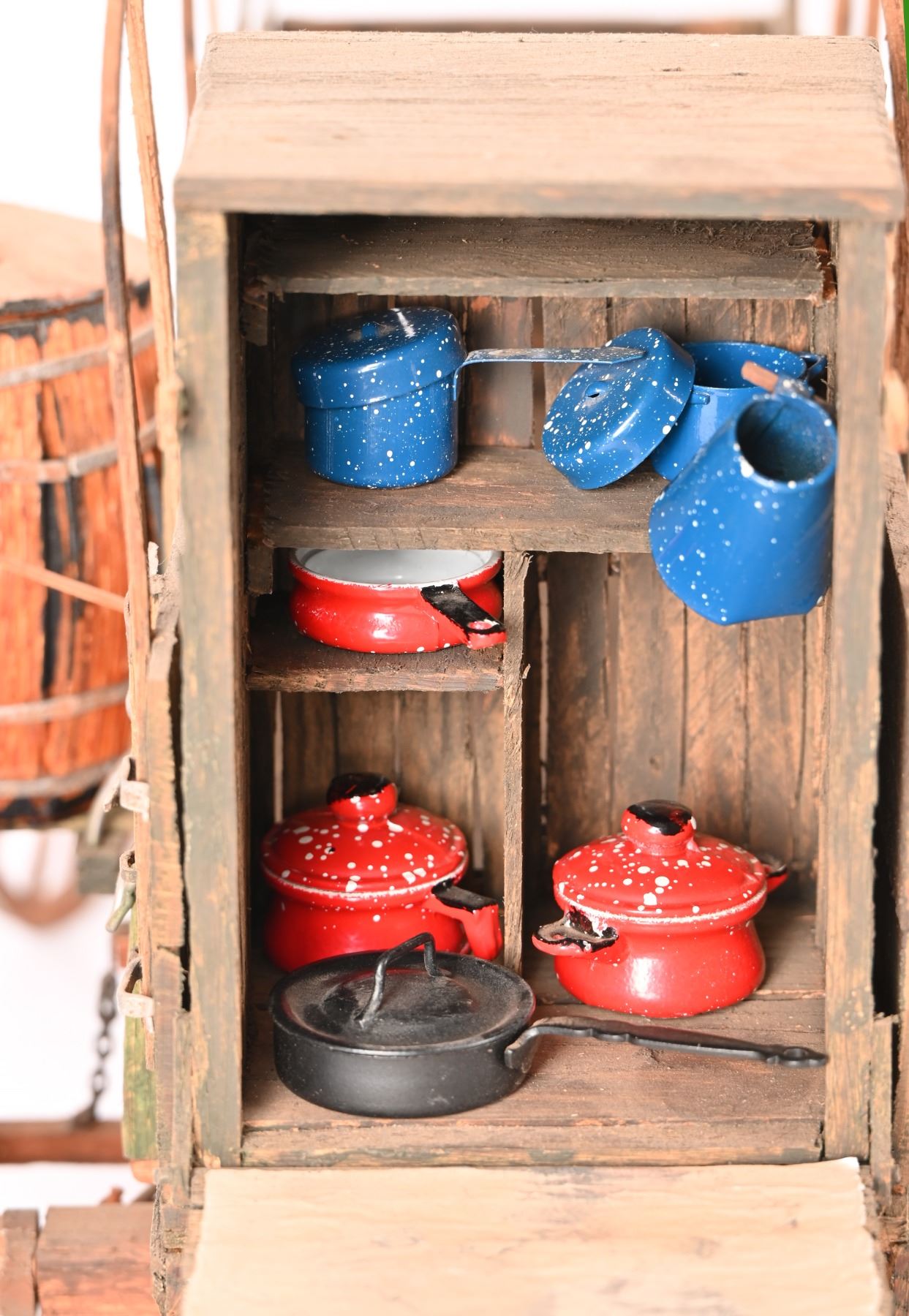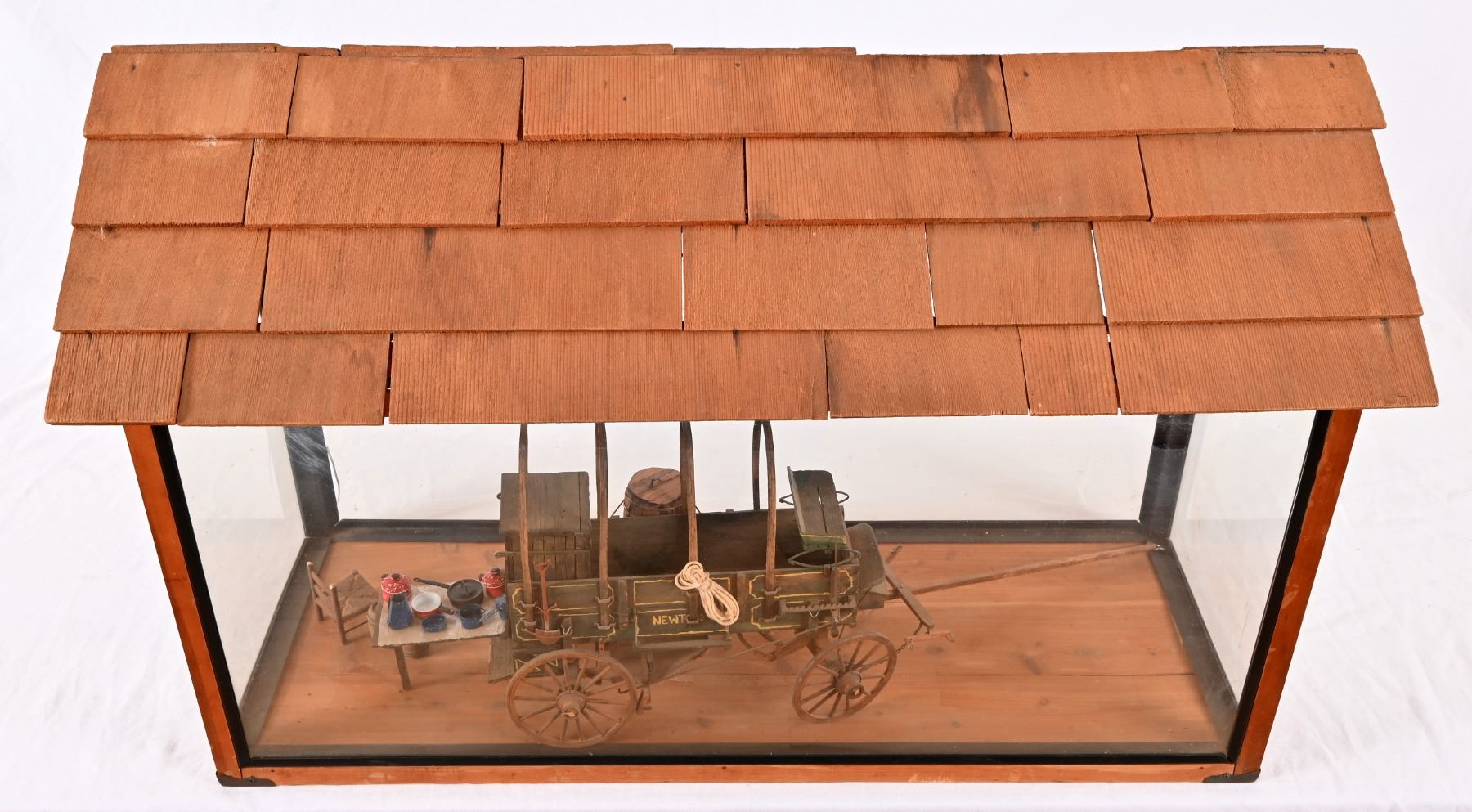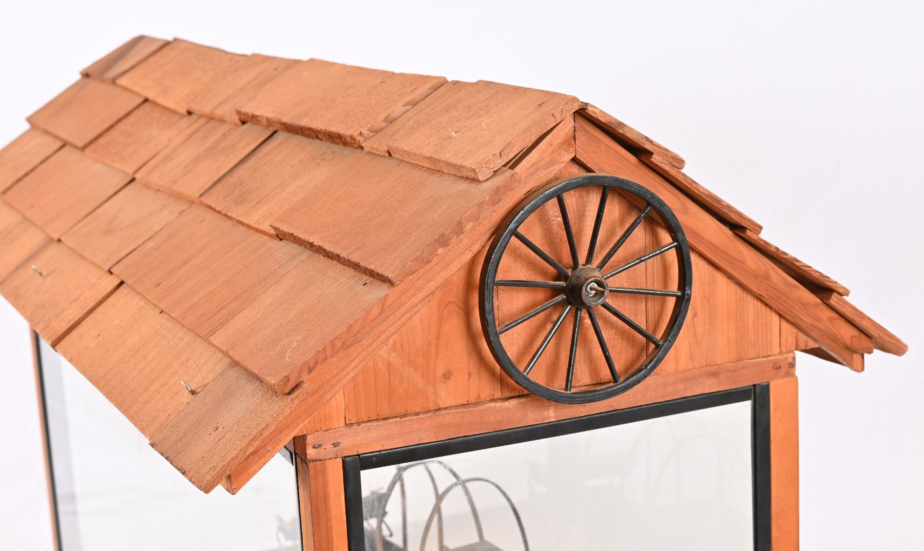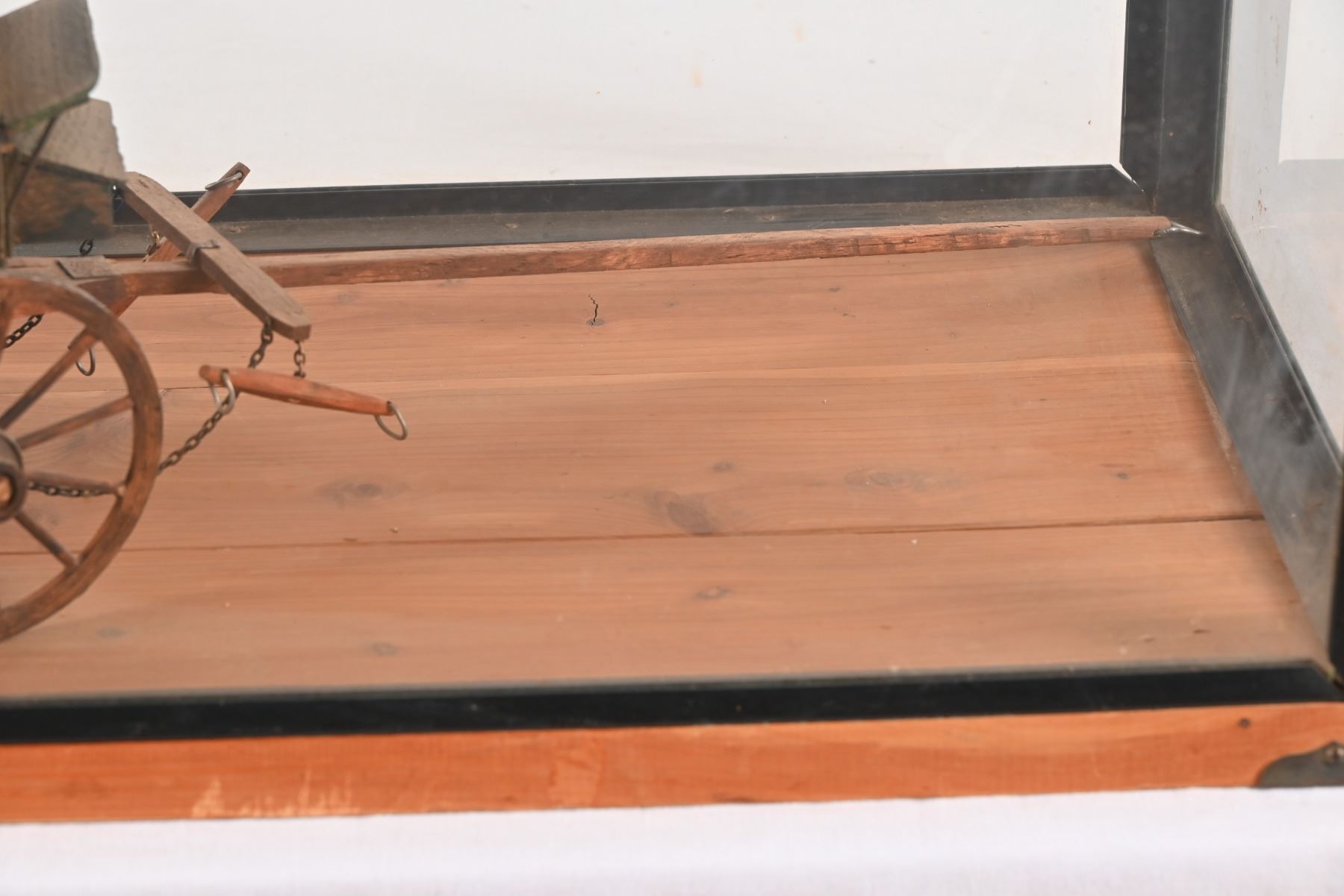 Very nicely done wooden model chuck wagon with accessories. Measures 8" wide x 10" tall x 25" in length, to the end of the tongue. Includes custom "Wagon House" display case