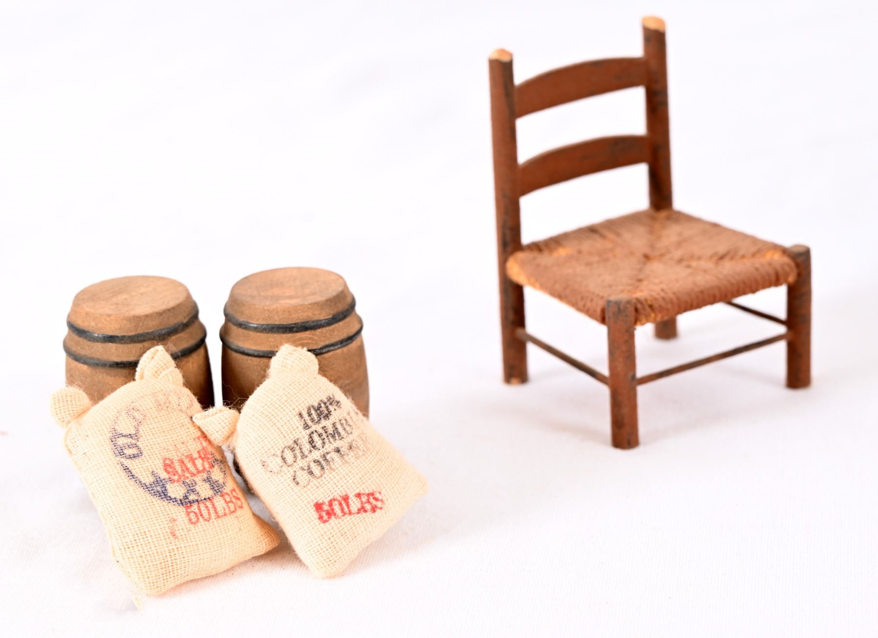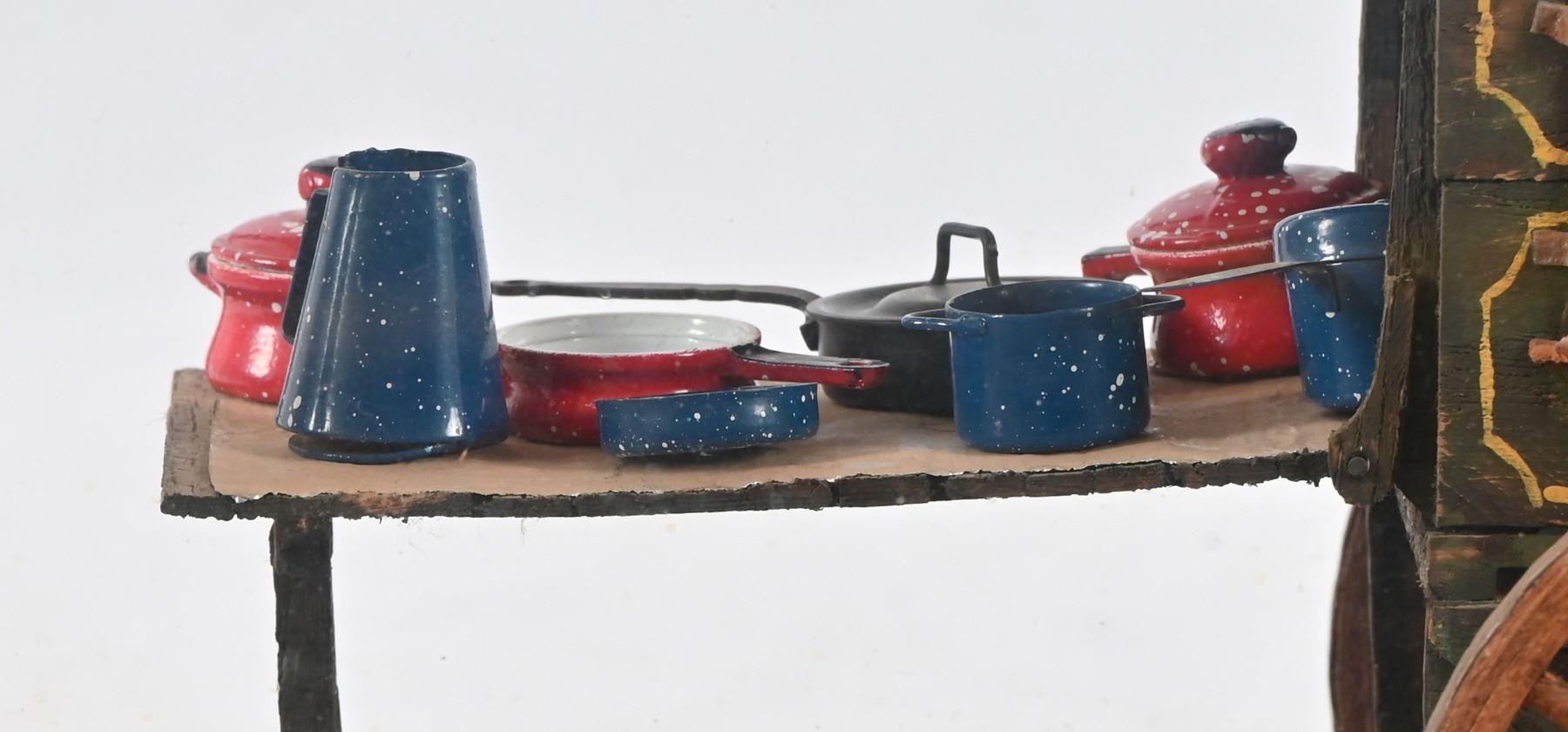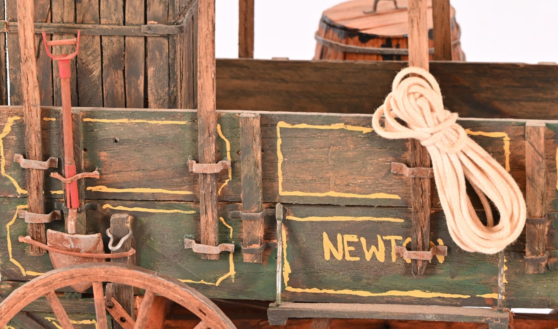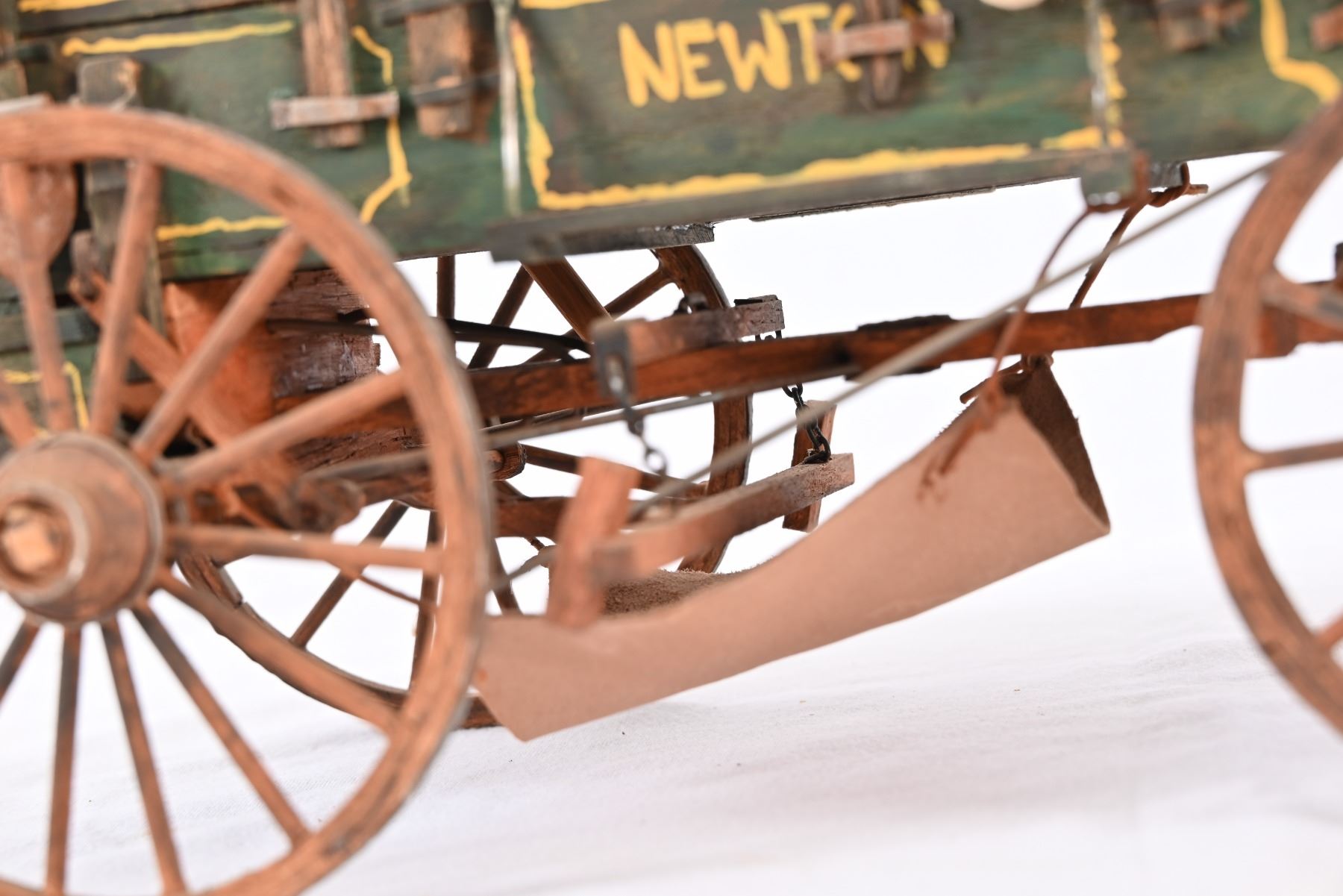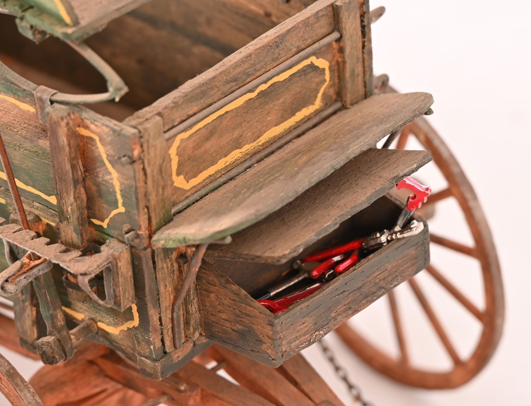 Very nicely done wooden model chuck wagon with accessories. Measures 8" wide x 10" tall x 25" in length, to the end of the tongue. Includes custom "Wagon House" display case