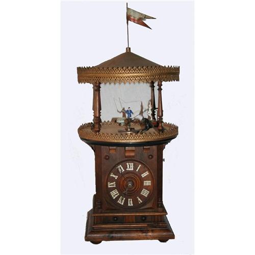 The Equestrienne - Wooden clock with a special toy attachment that causes the rider to be propelled into the air as he approaches the rail.  He moves in sync with the horse and then lands upon the horse’s back after clearing the rail.  Working condition.  Circa 1890.