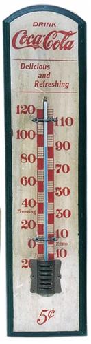 Circa 1915 5"x21" wooden Coke thermometer. Appears totally original. Light-med soiling with very strong red transfers remaining as well as strong green border paint. A few minor chips, nicks, scratches and marks. Cond. 7.5 but displays much better.