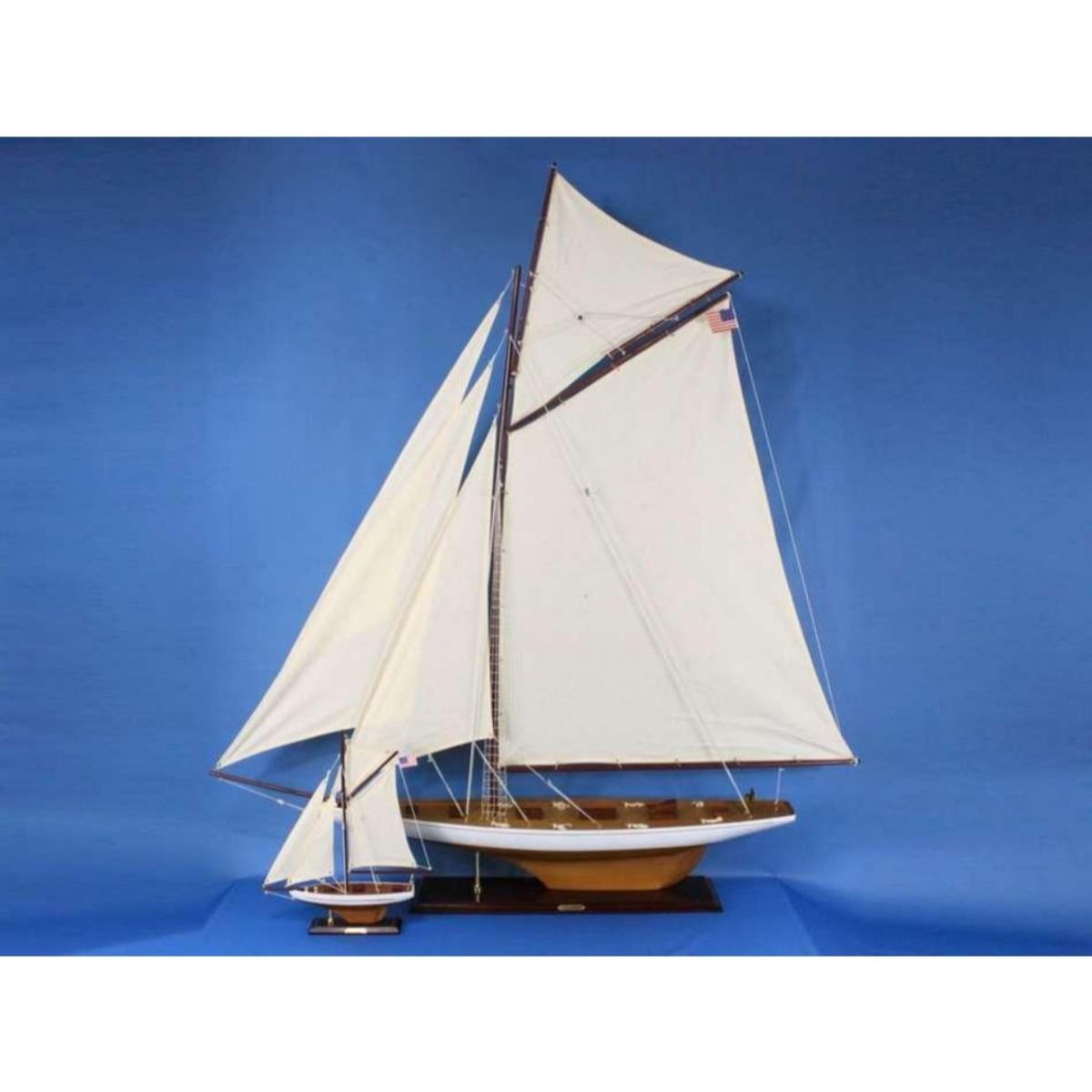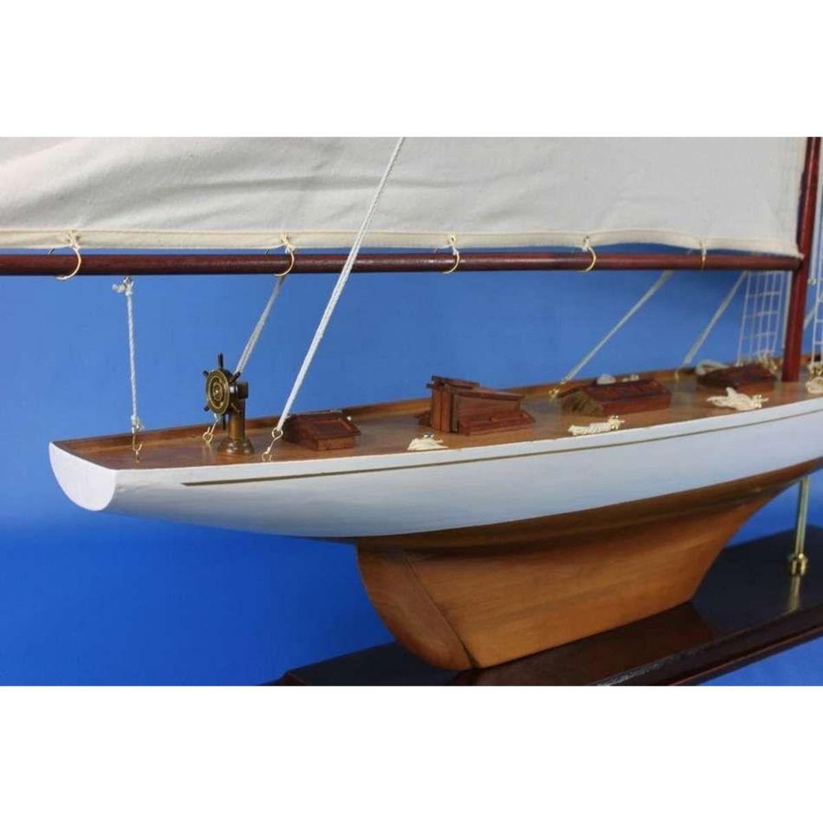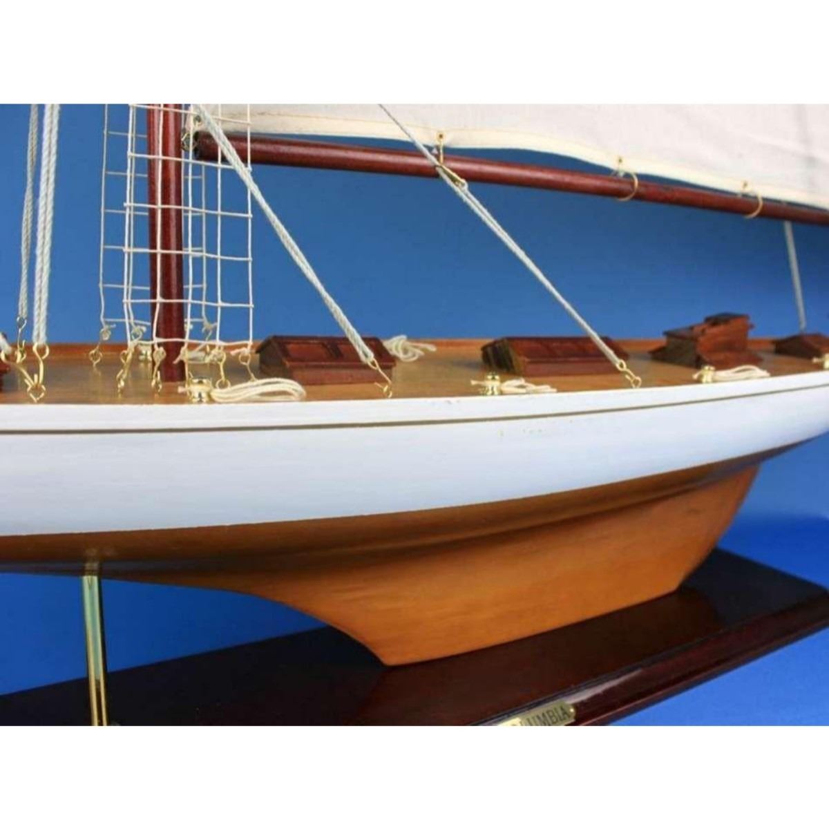 Wooden Columbia Model Sailboat Decoration 60" NOT A MODEL SHIP KIT Attach Sails and Columbia yacht model is Ready for Immediate Display Clean lines and simple, elegant detailing define this proud Columbia yacht model. Prominent enough to set a nautical tone yet subdued to match every decor, this fine sailboat is ready to grace any room with her presence. 54" L x 7" W x 60" H (1:23 scale) Handcrafted from solid wood by our master artisans Quality construction features: Entirely wooden parts with no plastic hull or deck details Individual wood planks visible in hull and deck Lightly starched, quality cloth sails do not sag or wrinkle Suits any room or decor with clean lines and simple colors Pre-assembled, simply attach the sails and display Separate pre-assembled hull and sails ensure safe shipping and lower cost Sails and rigging already complete Insert mast in designated hole and clip brass rigging hooks as shown in illustrations Ready to display in less than five minutes.