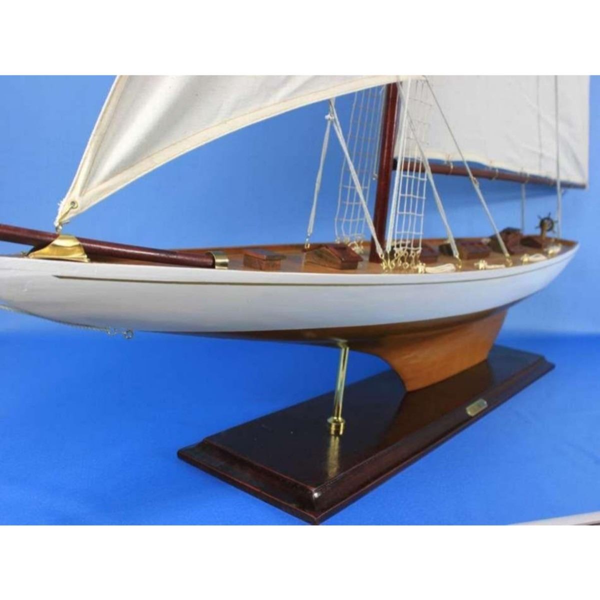 Wooden Columbia Model Sailboat Decoration 60" NOT A MODEL SHIP KIT Attach Sails and Columbia yacht model is Ready for Immediate Display  Clean lines and simple, elegant detailing define this proud Columbia yacht model. Prominent enough to set a nautical tone yet subdued to match every decor, this fine sailboat is ready to grace any room with her presence. 54" L x 7" W x 60" H (1:23 scale) Handcrafted from solid wood by our master artisans Quality construction features: Entirely wooden parts with no plastic hull or deck details Individual wood planks visible in hull and deck Lightly starched, quality cloth sails do not sag or wrinkle Suits any room or decor with clean lines and simple colors Pre-assembled, simply attach the sails and display Separate pre-assembled hull and sails ensure safe shipping and lower cost Sails and rigging already complete Insert mast in designated hole and clip brass rigging hooks as shown in illustrations Ready to display in less than five minutes