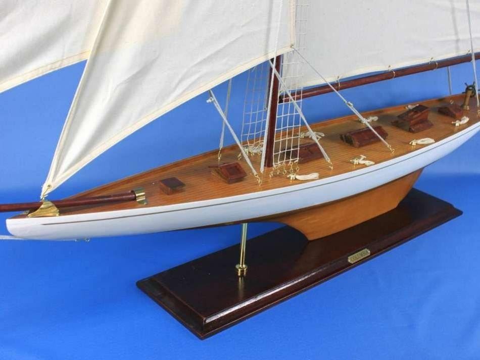 Wooden Columbia Model Sailboat Decoration 60" NOT A MODEL SHIP KIT Attach Sails and Columbia yacht model is Ready for Immediate Display  Clean lines and simple, elegant detailing define this proud Columbia yacht model. Prominent enough to set a nautical tone yet subdued to match every decor, this fine sailboat is ready to grace any room with her presence. 54" L x 7" W x 60" H (1:23 scale) Handcrafted from solid wood by our master artisans Quality construction features: Entirely wooden parts with no plastic hull or deck details Individual wood planks visible in hull and deck Lightly starched, quality cloth sails do not sag or wrinkle Suits any room or decor with clean lines and simple colors Pre-assembled, simply attach the sails and display Separate pre-assembled hull and sails ensure safe shipping and lower cost Sails and rigging already complete Insert mast in designated hole and clip brass rigging hooks as shown in illustrations Ready to display in less than five minutes