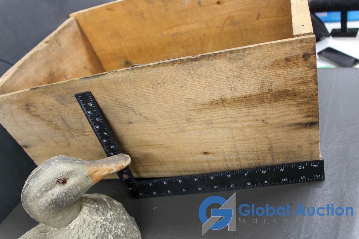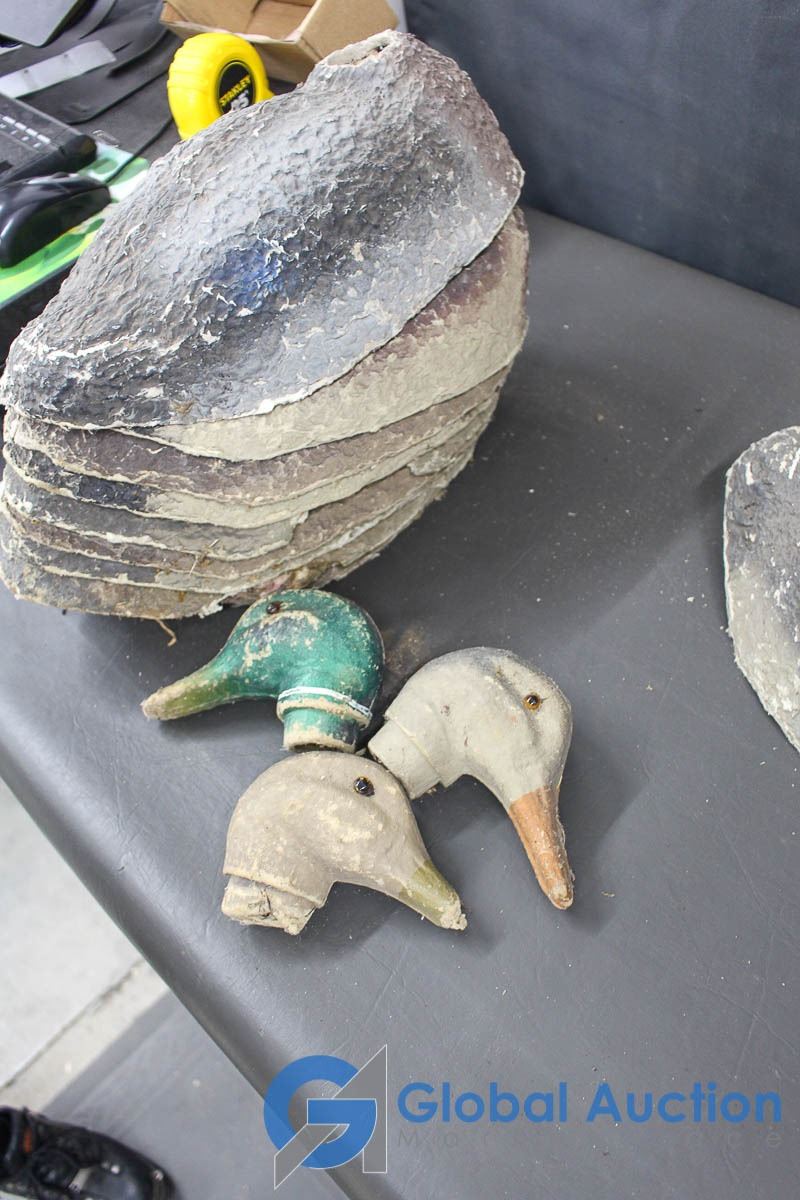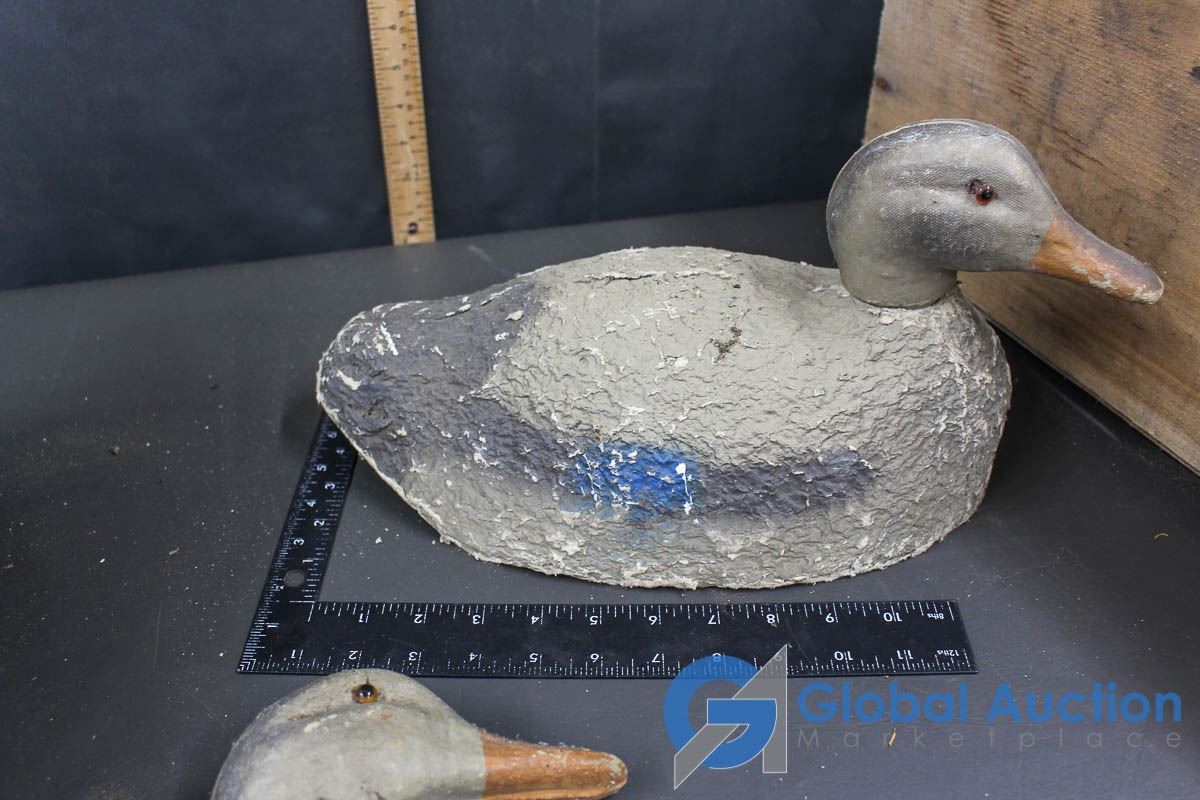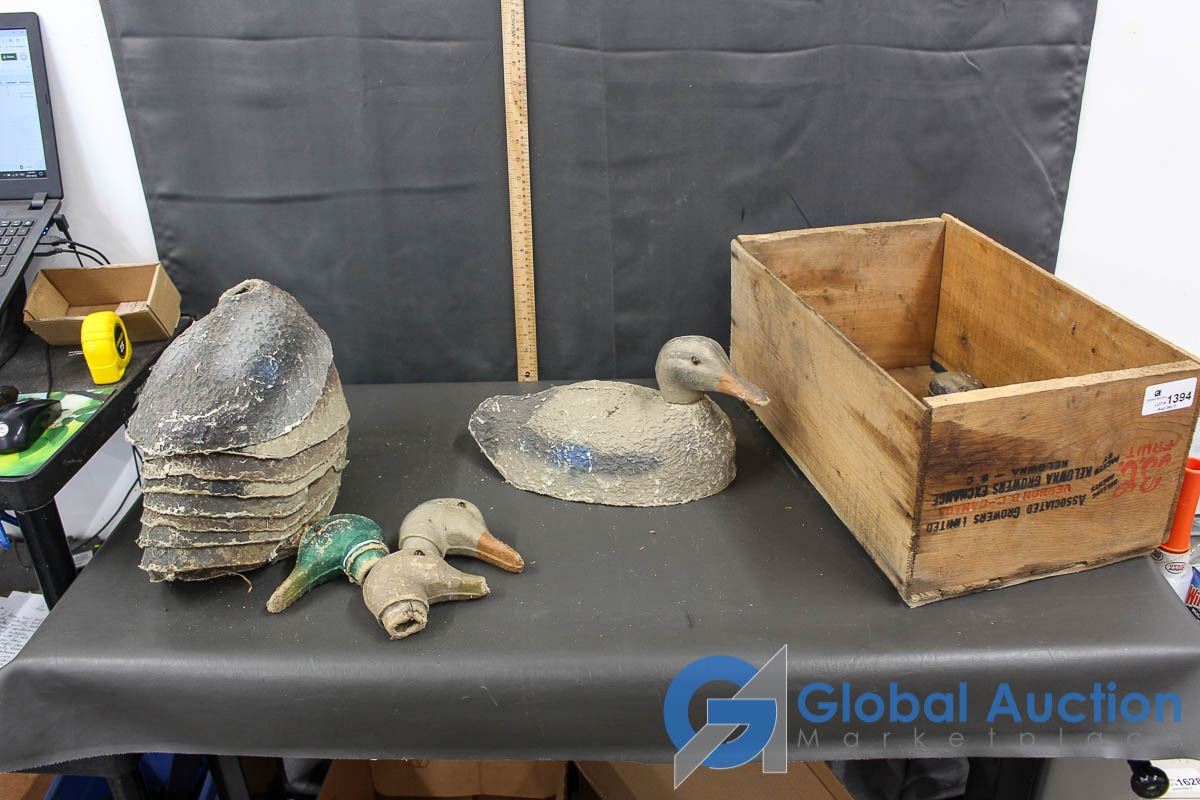 Wooden Crate of (10) Vintage Paper Duck Decoys with Replaceable Heads