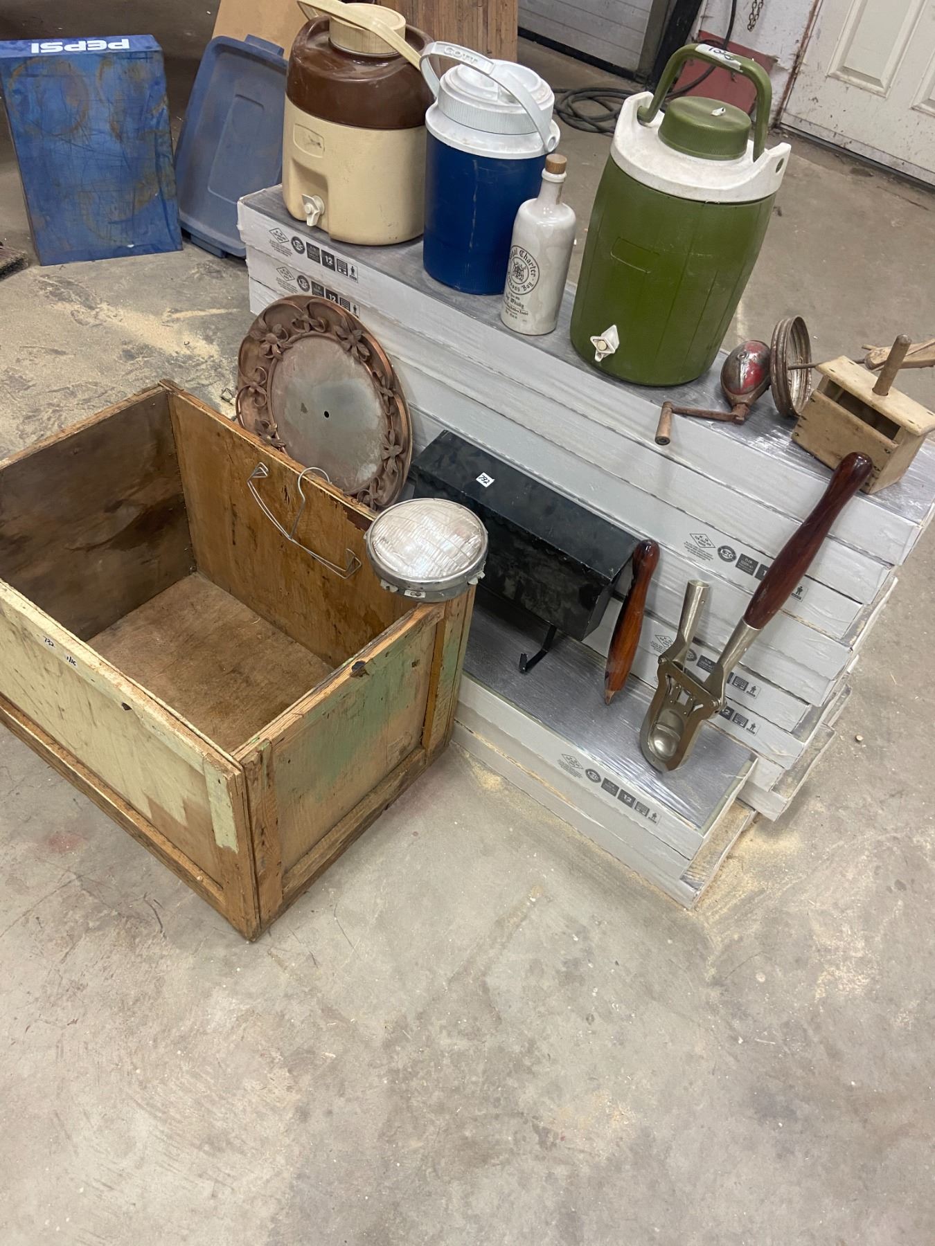 3 Water Cooler, Mailbox, Dehornor, Butter Churn Top & Press