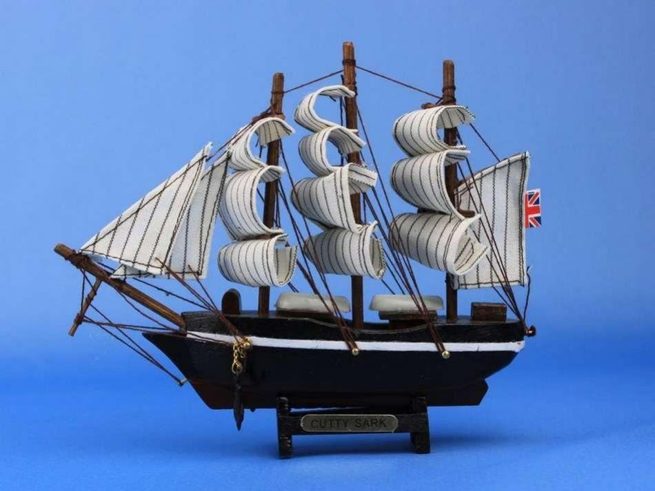 Wooden Cutty Sark Tall Model Clipper Ship 7" SOLD FULLY ASSEMBLED Ready for Immediate Display - Not a Model Ship kit Built to be one of the fastest ships on the sea, in order to command the tea trade between England and China, the legendary Cutty Sark is brought to life in stunning detail with this handsome toy model ship. Perfect for any child, or nautical enthusiast, this 7" model ship is both historically accurate and pleasantly aesthetic. Place one upon your desk, in your child's room, or in your office, and enjoy the warm nautical charm it brings. NOTE: This item is small, only 7". Please measure this size yourself to ensure it is appropriate for your intended purchase. Arrives fully assembled with all sails mounted Handcrafted wooden hull and masts 13 handsewn white cloth sails 2 anchors with metal chain attached Metal nameplate on wooden base identifies the ship as the Cutty Sark