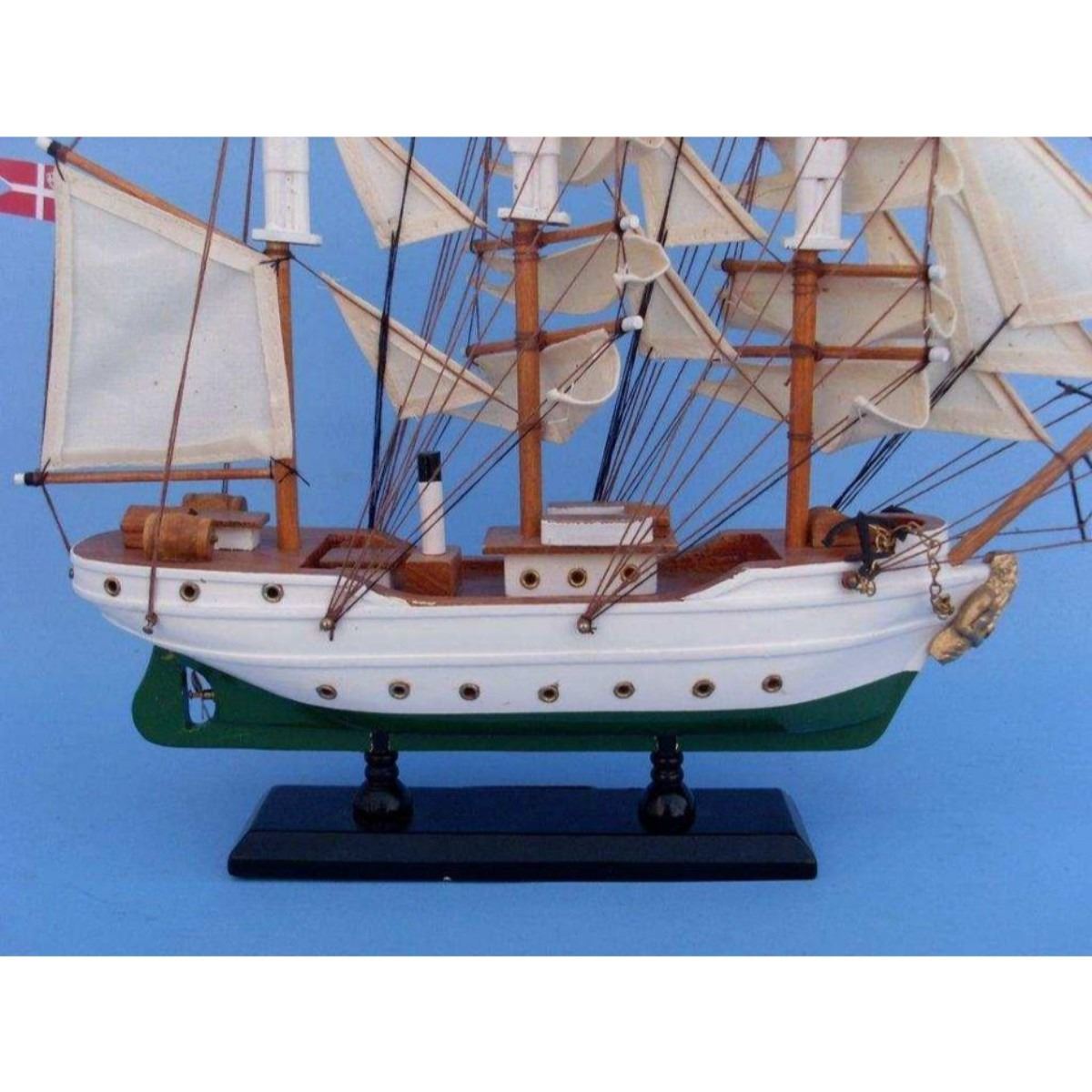 Wooden Danmark Tall Model Ship 14" SOLD FULLY ASSEMBLED Ready for Immediate Display - Not a Model Ship kit Inspired by the Danmark, a Danish naval training ship transferred into American custody during World War 2, this adorable tall ships model cutter rests easily upon any shelf or desk. Add a touch of nautical history and pride to the decor of any room with these beautiful tall ships models. 14" Long x 3" Wide x 13" High (1:253 scale) Arrives fully assembled with all sails mounted High quality woods include cherry, birch, maple and rosewood Handcrafted wooden hull and masts 20 handsewn white cloth sails Metal nameplate on wooden base identifies the ship as the Danmark