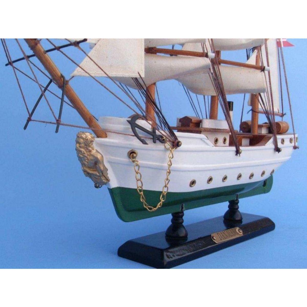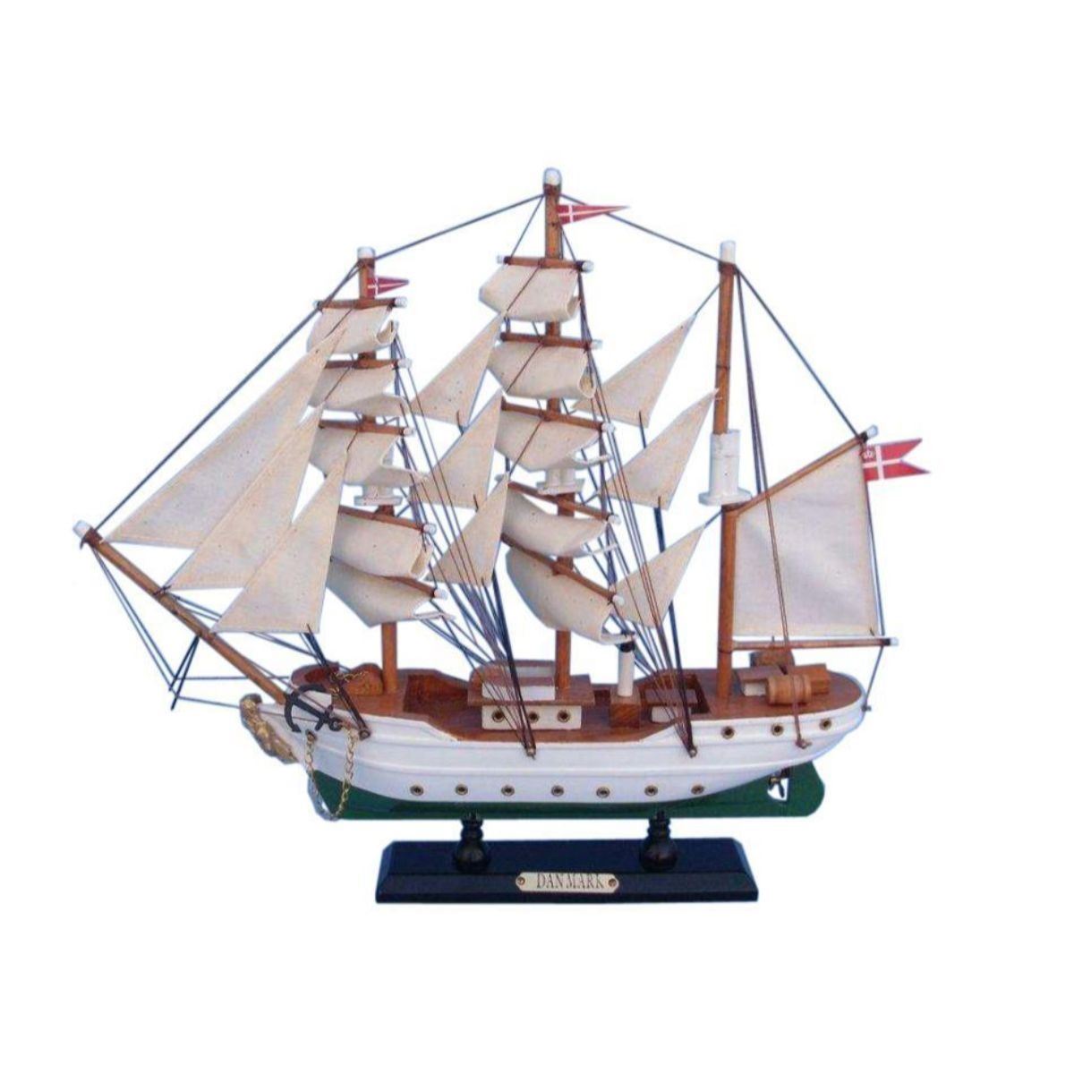 Wooden Danmark Tall Model Ship 14" SOLD FULLY ASSEMBLED Ready for Immediate Display - Not a Model Ship kit Inspired by the Danmark, a Danish naval training ship transferred into American custody during World War 2, this adorable tall ships model cutter rests easily upon any shelf or desk. Add a touch of nautical history and pride to the decor of any room with these beautiful tall ships models. 14" Long x 3" Wide x 13" High (1:253 scale) Arrives fully assembled with all sails mounted High quality woods include cherry, birch, maple and rosewood Handcrafted wooden hull and masts 20 handsewn white cloth sails Metal nameplate on wooden base identifies the ship as the Danmark