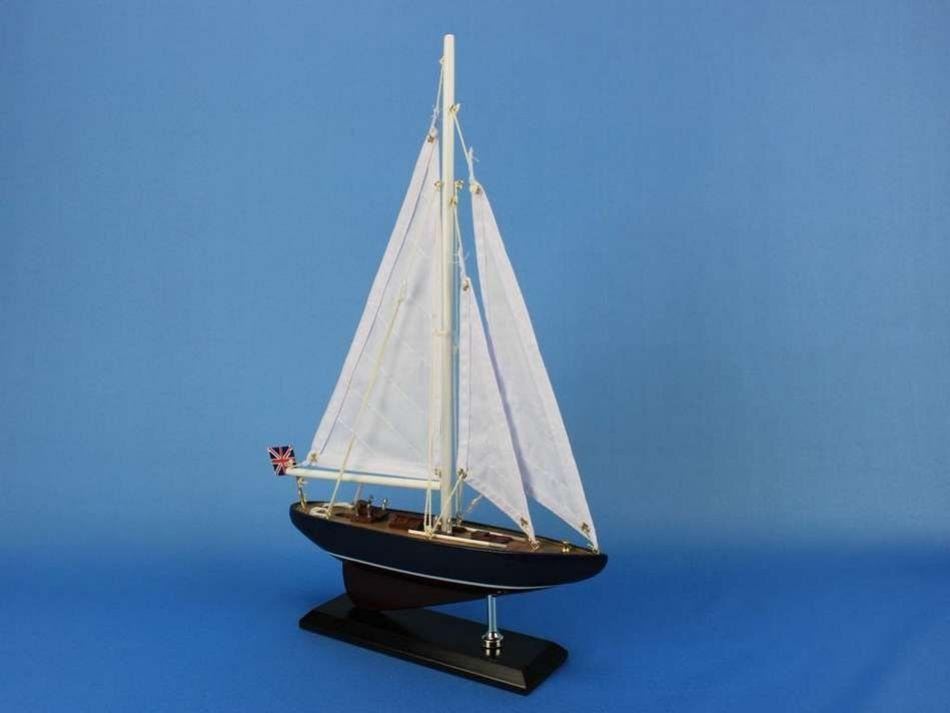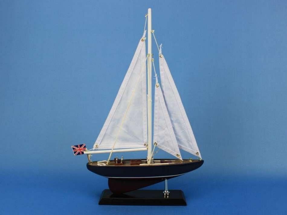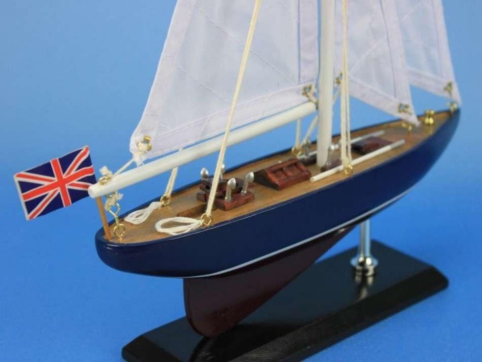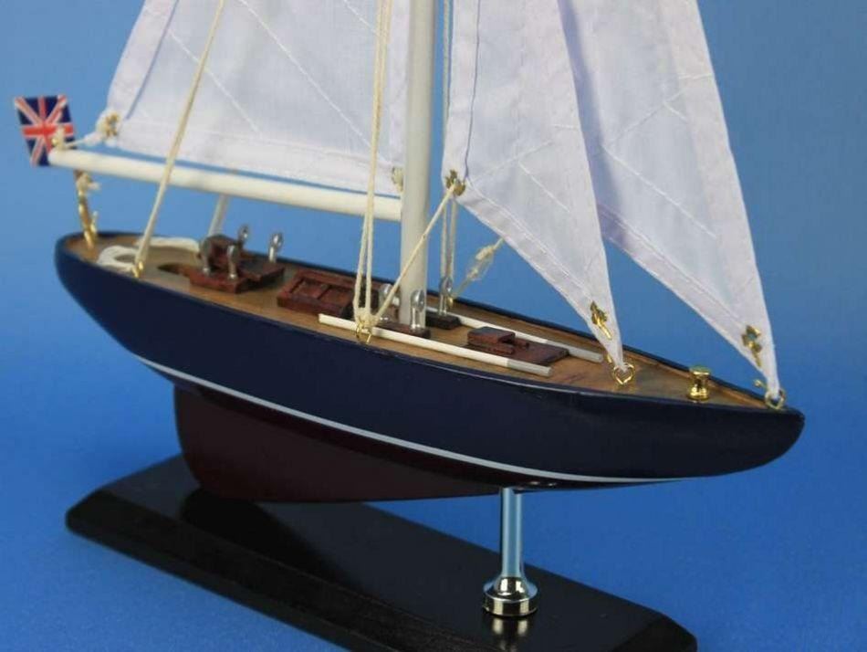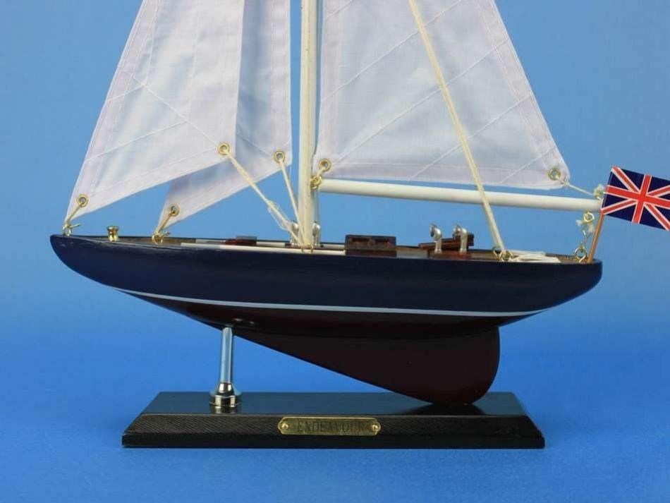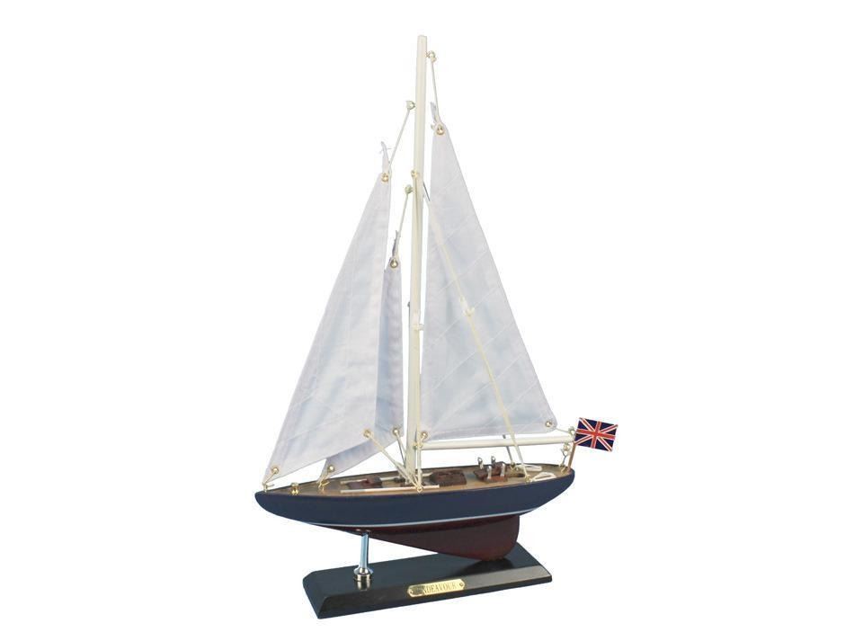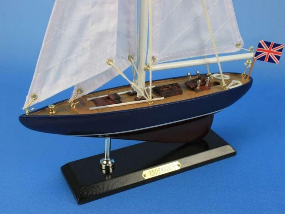 Wooden Endeavour Model Sailboat Decoration 16" NOT A MODEL SHIP KIT   Attach Sails and this Sailboat Centerpiece is Ready for Immediate Display  Brighten your day, or any room of your home, with this delightfully fun Endeavour model. Perfect nautical decor gifts for friends, children, or party guests, they also make excellent nautical decorations or sailboat centerpieces for a reception or group event. Liven your office, beach house, or sunroom with one of these colorful sailboat models today! Handcrafted solid wood hull, masts and stand with metal supports Largest sailboat selection available - We offer over 150 unique model sailboats Featured in Sept 2011 Brides magazine - Excellent wedding table centerpiece Perfect nautical gift for friends, children or party guests Ideal for banquets, receptions, meetings, or any other nautical party or eventÂ