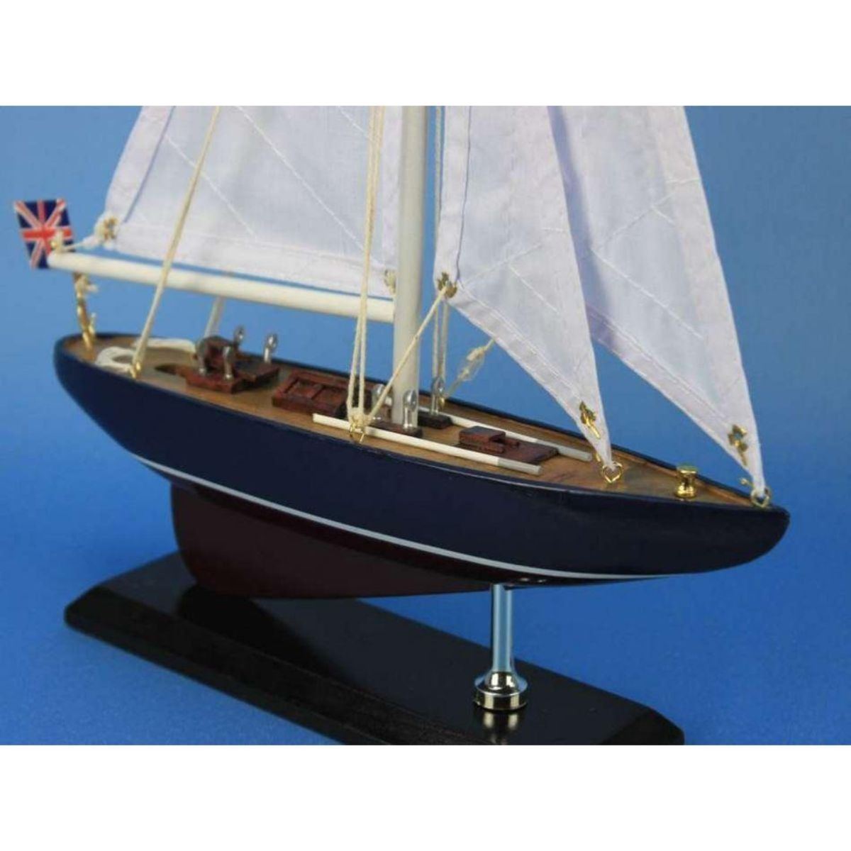 Wooden Endeavour Model Sailboat Decoration 16" NOT A MODEL SHIP KIT   Attach Sails and this Sailboat Centerpiece is Ready for Immediate Display  Brighten your day, or any room of your home, with this delightfully fun Endeavour model. Perfect nautical decor gifts for friends, children, or party guests, they also make excellent nautical decorations or sailboat centerpieces for a reception or group event. Liven your office, beach house, or sunroom with one of these colorful sailboat models today! Handcrafted solid wood hull, masts and stand with metal supports Largest sailboat selection available - We offer over 150 unique model sailboats Featured in Sept 2011 Brides magazine - Excellent wedding table centerpiece Perfect nautical gift for friends, children or party guests Ideal for banquets, receptions, meetings, or any other nautical party or eventÂ