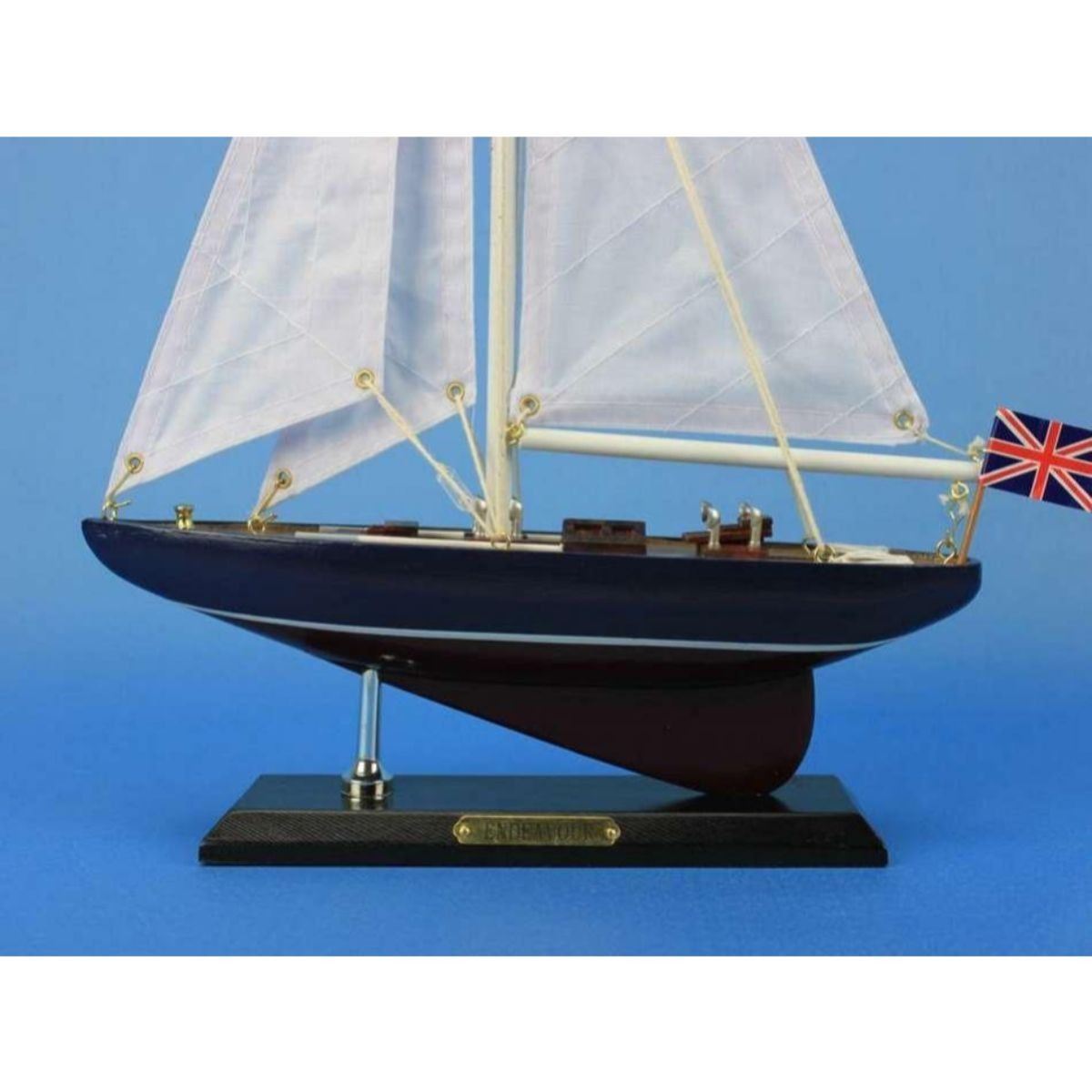 Wooden Endeavour Model Sailboat Decoration 16" NOT A MODEL SHIP KIT   Attach Sails and this Sailboat Centerpiece is Ready for Immediate Display  Brighten your day, or any room of your home, with this delightfully fun Endeavour model. Perfect nautical decor gifts for friends, children, or party guests, they also make excellent nautical decorations or sailboat centerpieces for a reception or group event. Liven your office, beach house, or sunroom with one of these colorful sailboat models today! Handcrafted solid wood hull, masts and stand with metal supports Largest sailboat selection available - We offer over 150 unique model sailboats Featured in Sept 2011 Brides magazine - Excellent wedding table centerpiece Perfect nautical gift for friends, children or party guests Ideal for banquets, receptions, meetings, or any other nautical party or eventÂ
