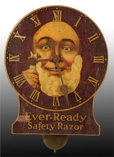 Description Circa 1915. Pendulum is not original. Marks, a few cracks and some stains with medium soiling and general wear. Advertising Clock Condition (6.5 - 7.0, Very Good). Size 18" x 22" x 4".