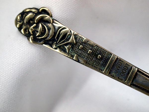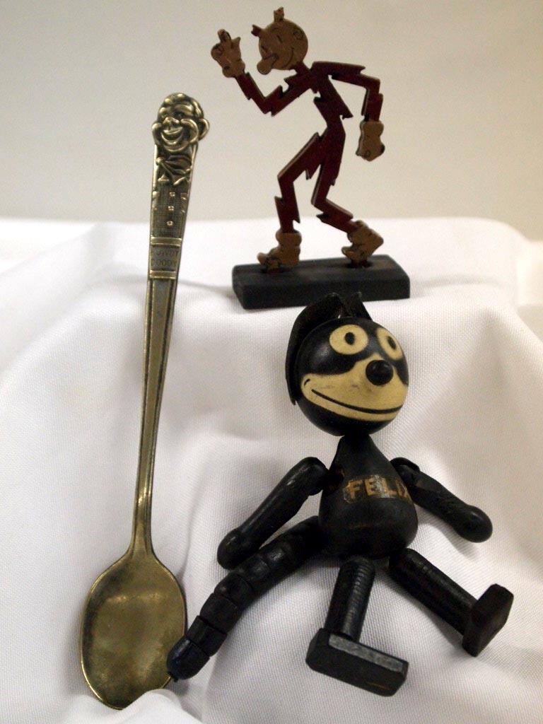 Wooden ''Felix''&''Dodaa'' Dolls,1 Howdy Doody Spoon. Felix measures 4''Hx3''Wx2''D and has elastic-tied joints (he moves). Spoon is Crown Silverplate and measures 6.5''Lx1''W. Buyers pay actual shipping and handling charges (see terms and conditions for more information.)