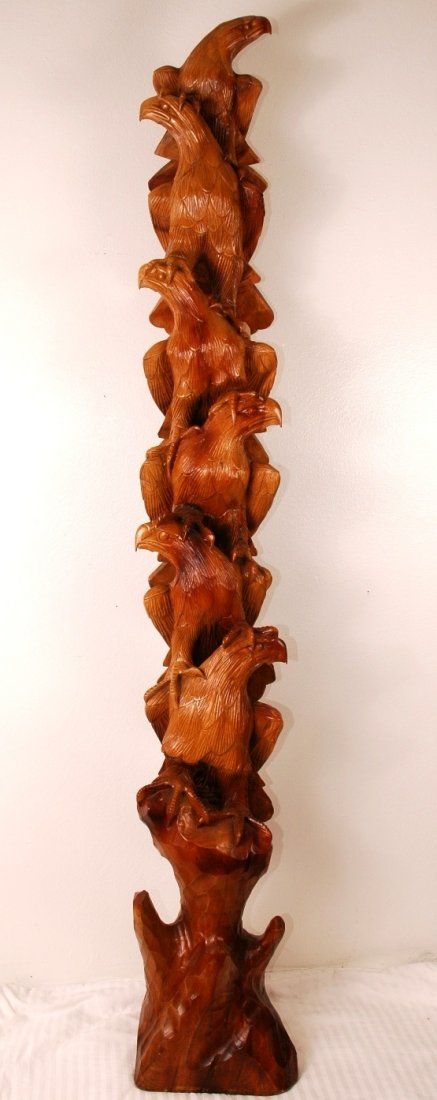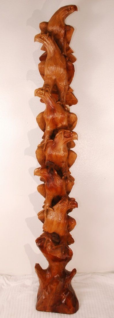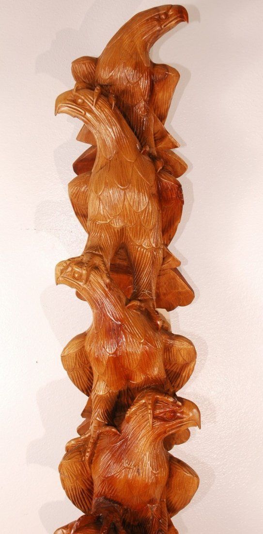 Hand carved 6 falcon totem pole. Falcons are peering to the right and left and sitting with talons on each others shoulders. One of a kind! 76"H x 10"W x 10"D