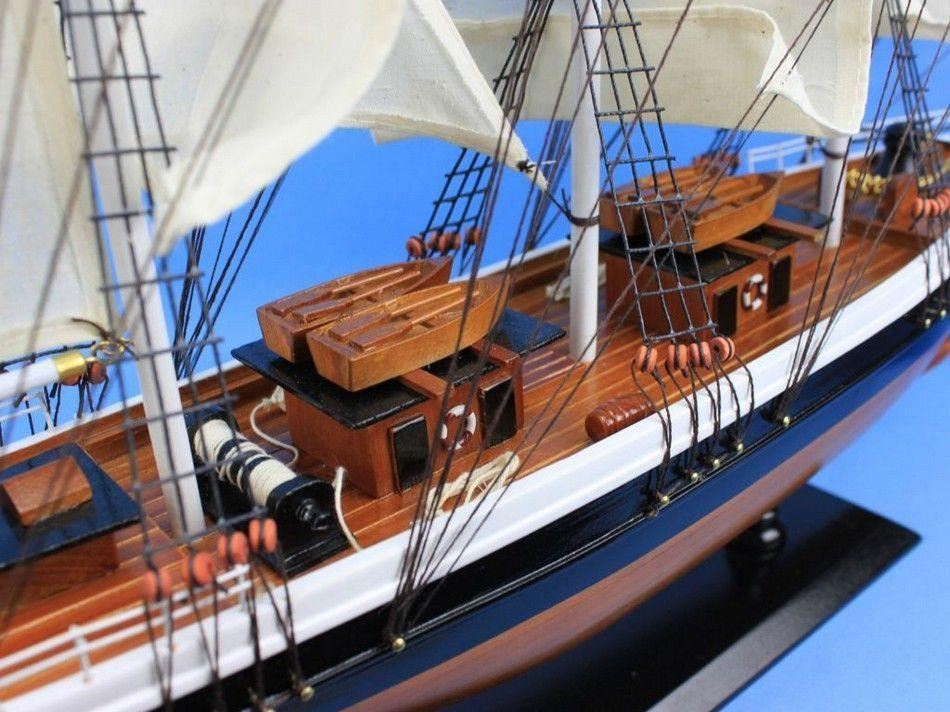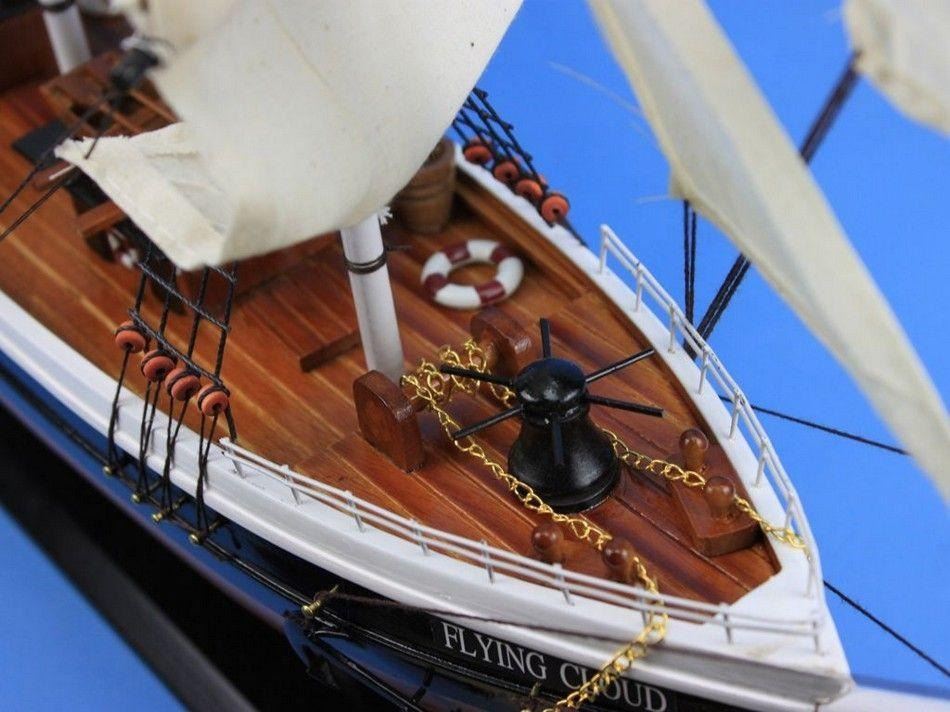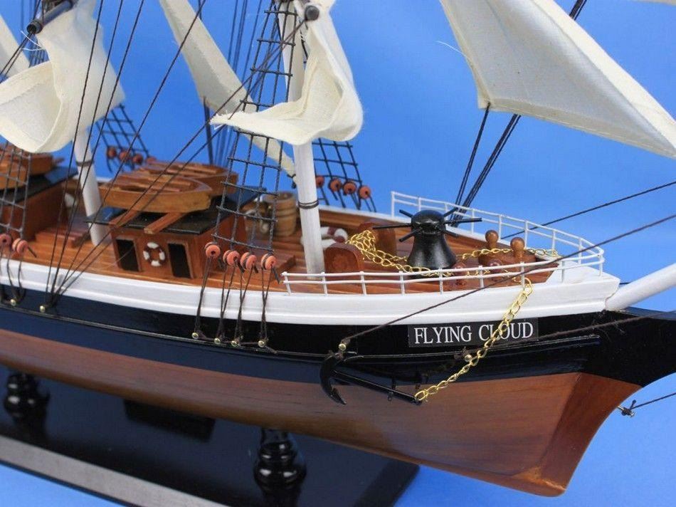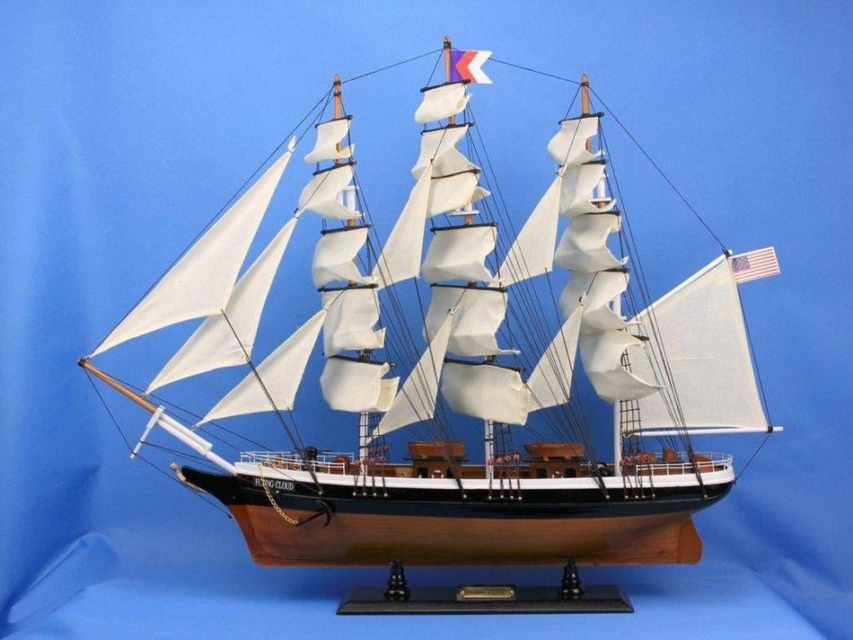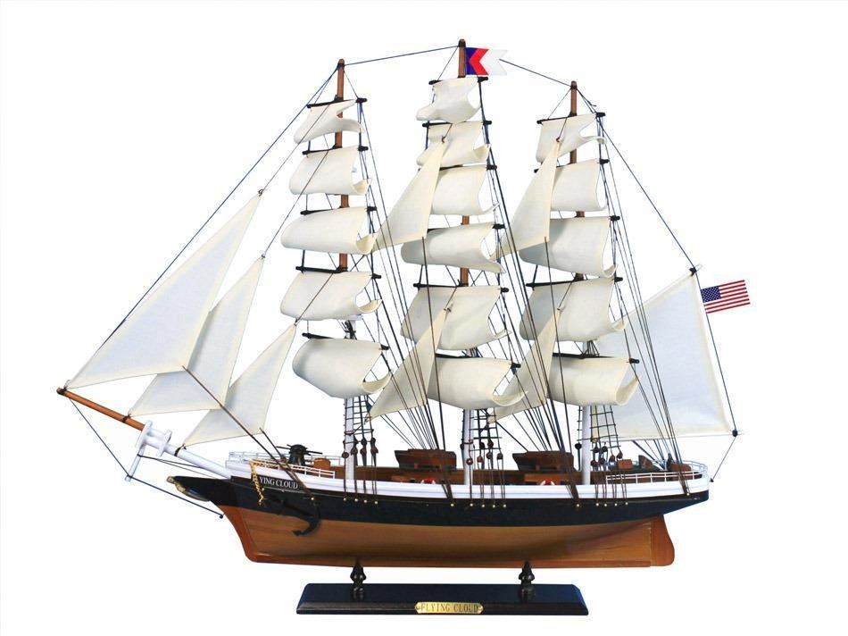 This fine tall ship model of the famous clipper ship Flying Cloud is perfectly sized for any shelf, desk, or mantle. Renowned for her speed and endurance sailing the open seas, these proud tall ship models of the Flying Cloud add a touch of historic spirit and flair of nautical décor to any bedroom, den, or office. Arrives fully assembled with all sails mounted Handcrafted wooden hull and masts Historically accurate sail configuration and extensive rigging 2 anchors with metal chain attached 21 handsewn white cloth sails Metal nameplate on wooden base identifies the ship as the Flying Cloud