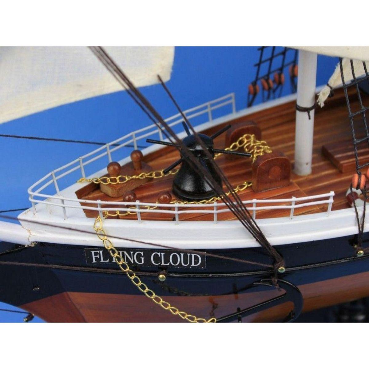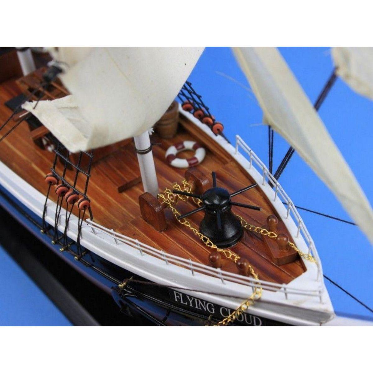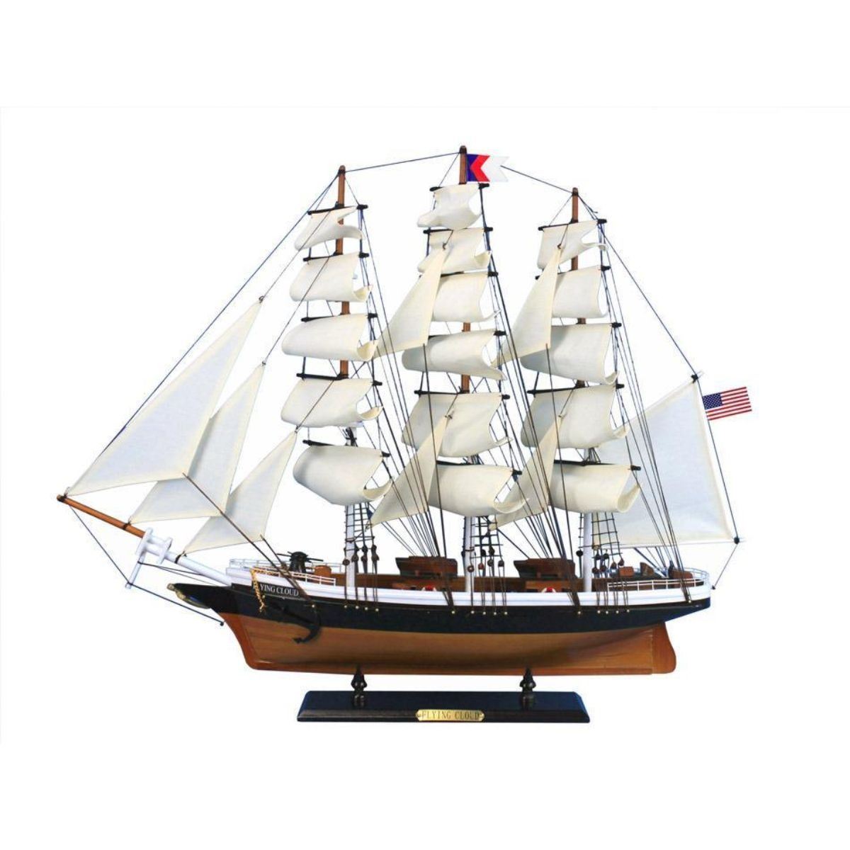 This fine tall ship model of the famous clipper ship Flying Cloud is perfectly sized for any shelf, desk, or mantle. Renowned for her speed and endurance sailing the open seas, these proud tall ship models of the Flying Cloud add a touch of historic spirit and flair of nautical decor to any bedroom, den, or office. Arrives fully assembled with all sails mounted Handcrafted wooden hull and masts Historically accurate sail configuration and extensive rigging 2 anchors with metal chain attached 21 handsewn white cloth sails Metal nameplate on wooden base identifies the ship as the Flying Cloud