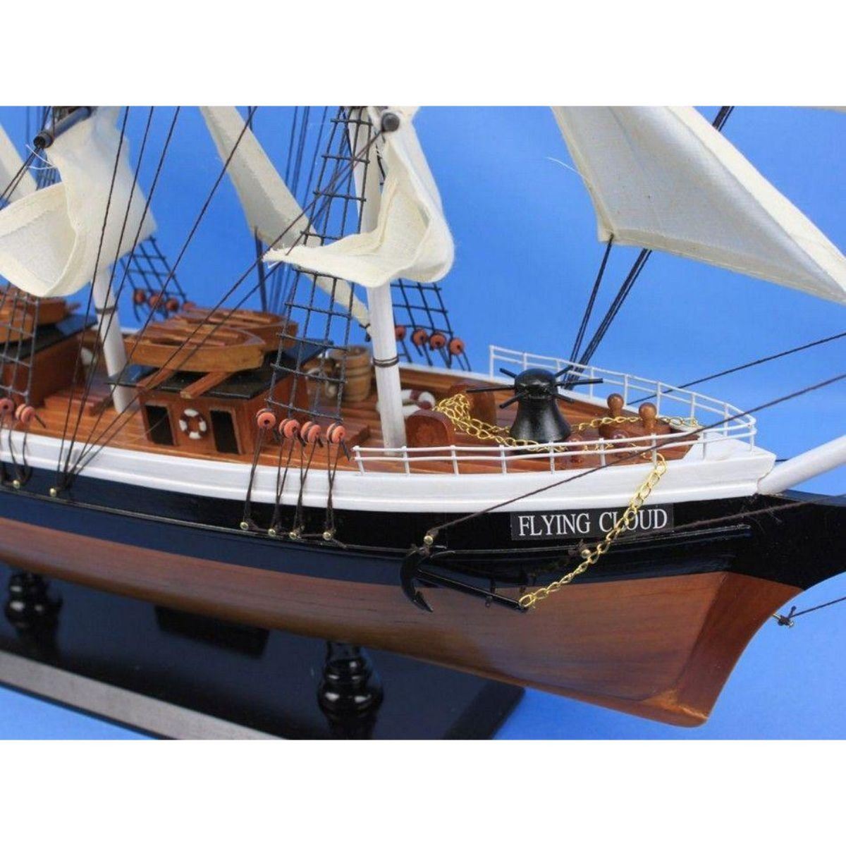 This fine tall ship model of the famous clipper ship Flying Cloud is perfectly sized for any shelf, desk, or mantle. Renowned for her speed and endurance sailing the open seas, these proud tall ship models of the Flying Cloud add a touch of historic spirit and flair of nautical decor to any bedroom, den, or office. Arrives fully assembled with all sails mounted Handcrafted wooden hull and masts Historically accurate sail configuration and extensive rigging 2 anchors with metal chain attached 21 handsewn white cloth sails Metal nameplate on wooden base identifies the ship as the Flying Cloud