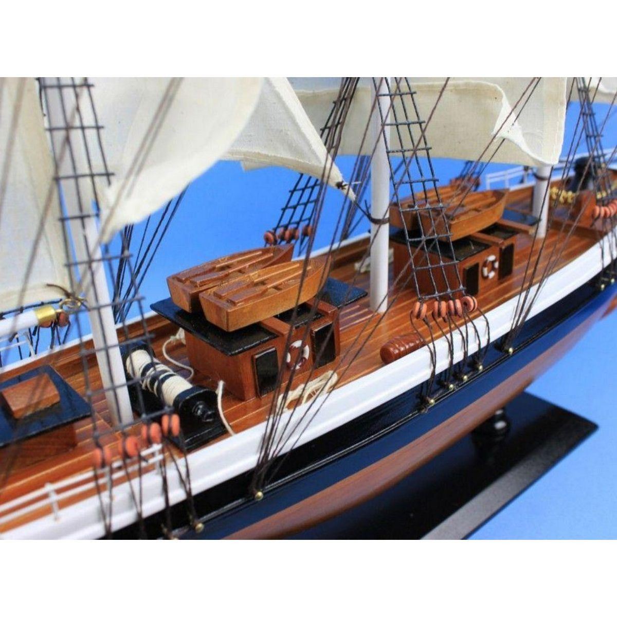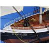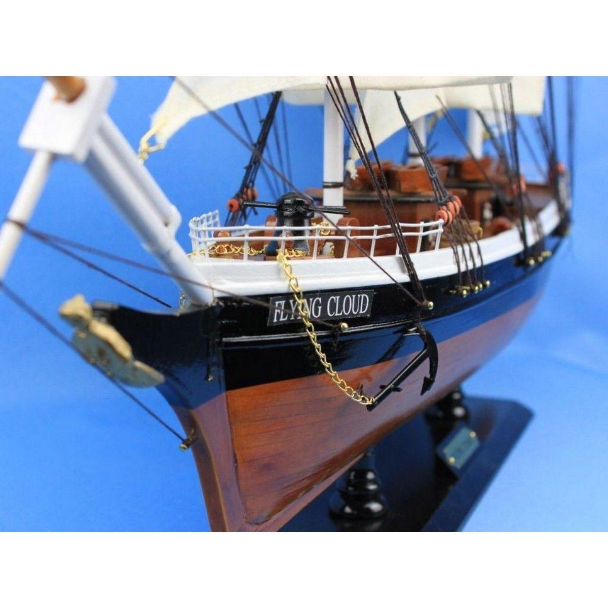 Tall ship model of the famous clipper Flying Cloud, sized for shelf, desk, or mantle. Arrives fully assembled with all sails mounted Handcrafted wooden hull and masts, with historically accurate sail configuration and extensive rigging, 2 anchors with metal chain attached, 21 hand sewn white cloth sails. Metal nameplate on wooden base to identify the ship as the Flying Cloud. 30" L x 6" W x 25" H.