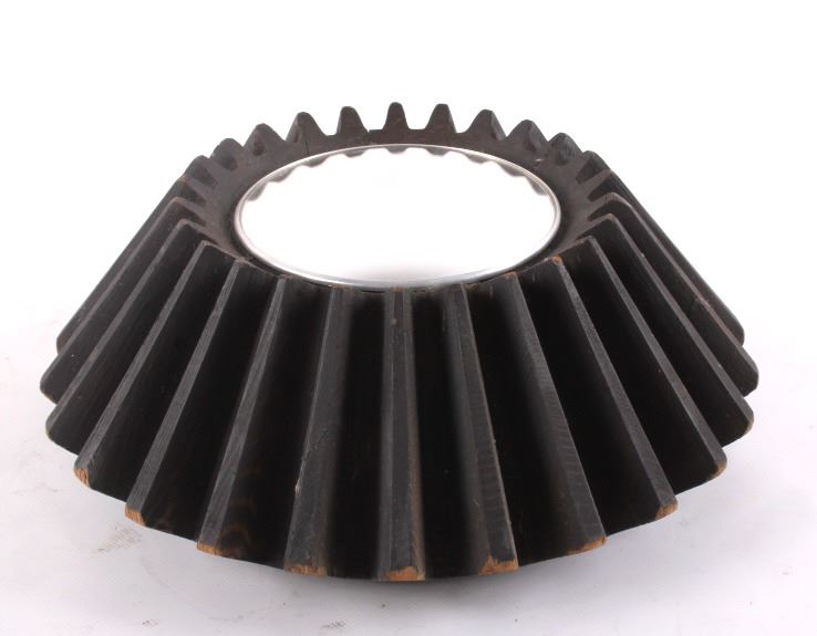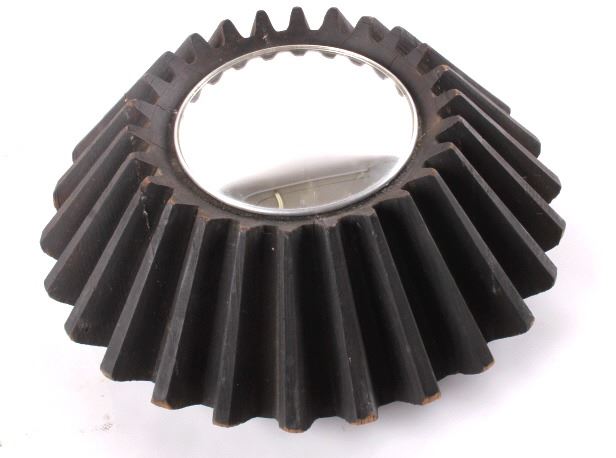 This is a decor piece of a wooden foundry type gear with a curved mirror in the center. This is a nice accent piece it would go with anything. The gear measures 9" Diameter x 4"H.
