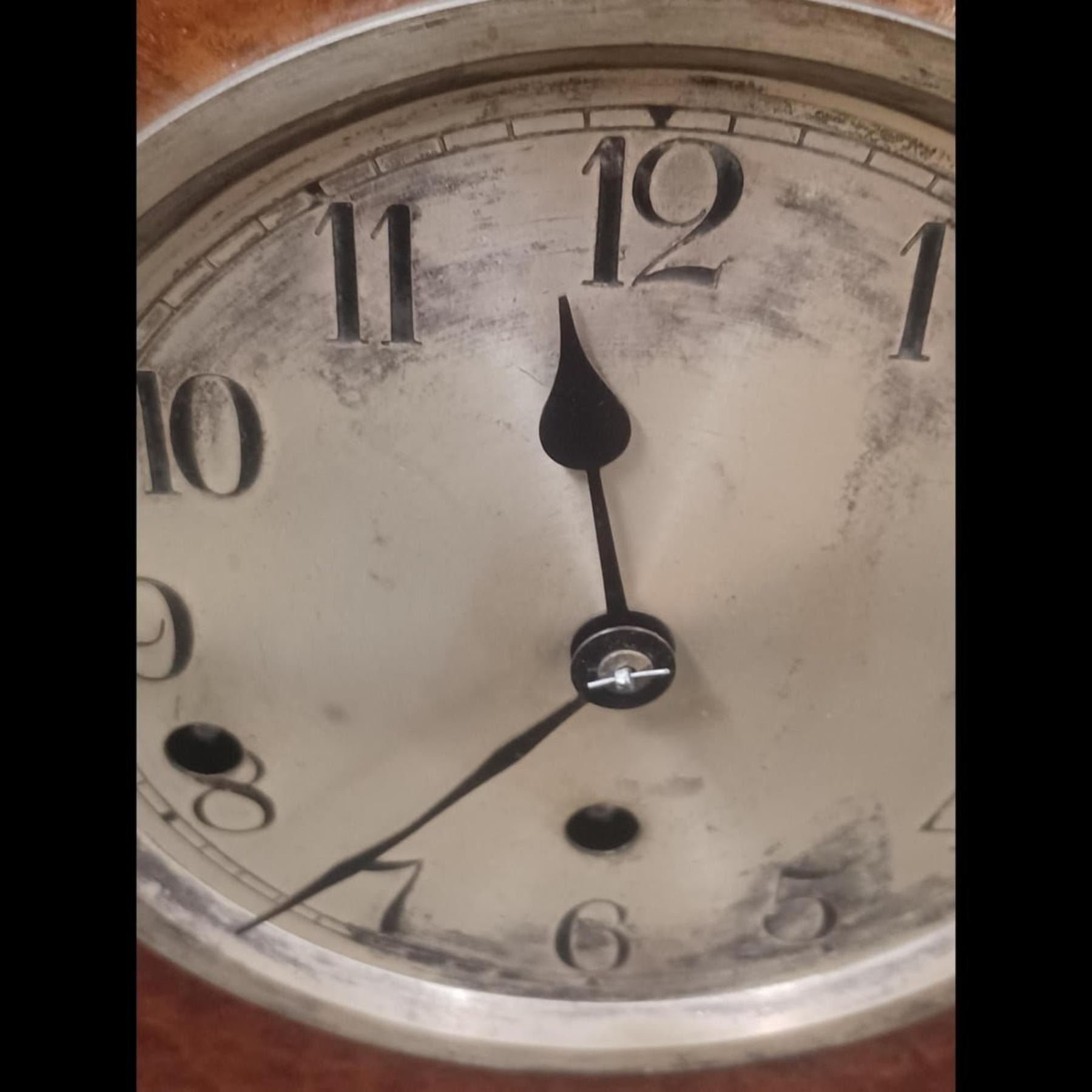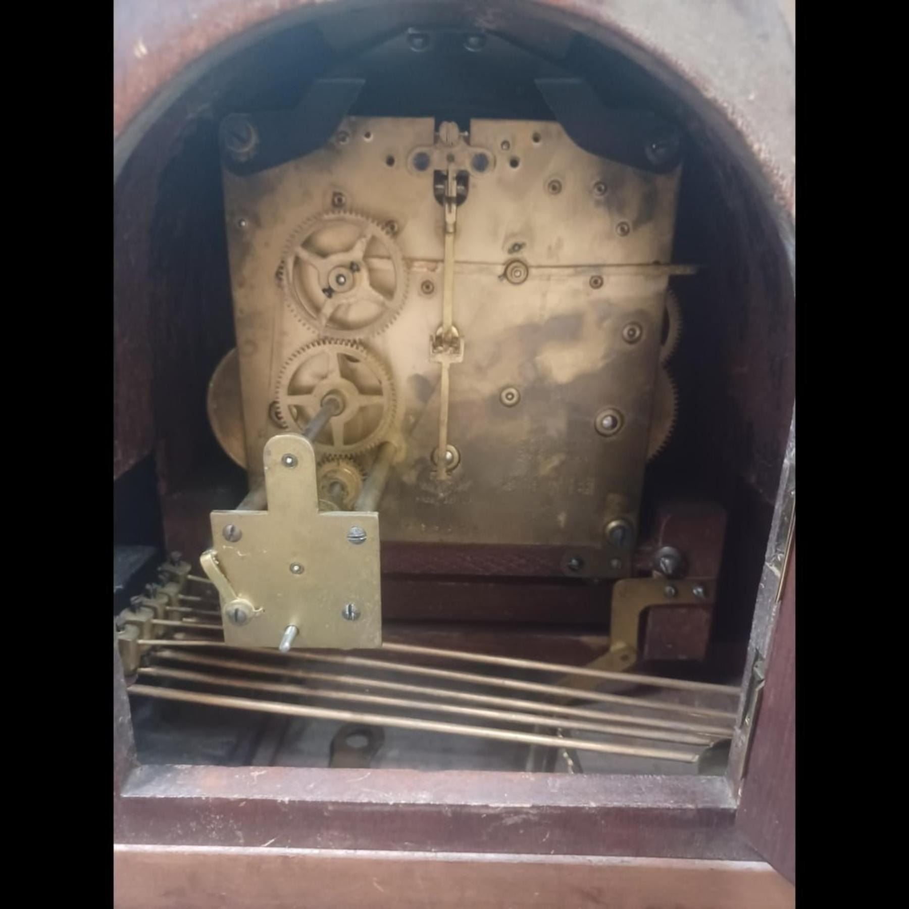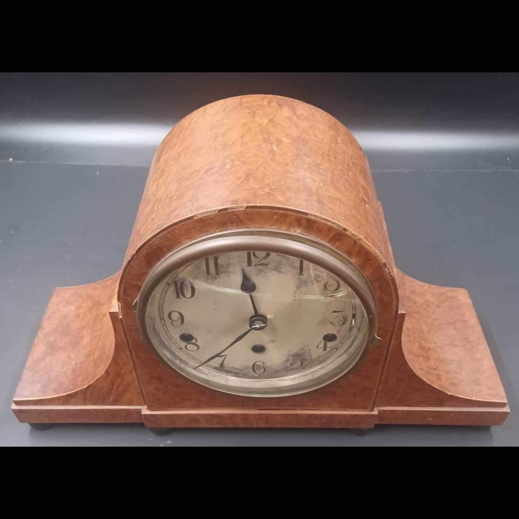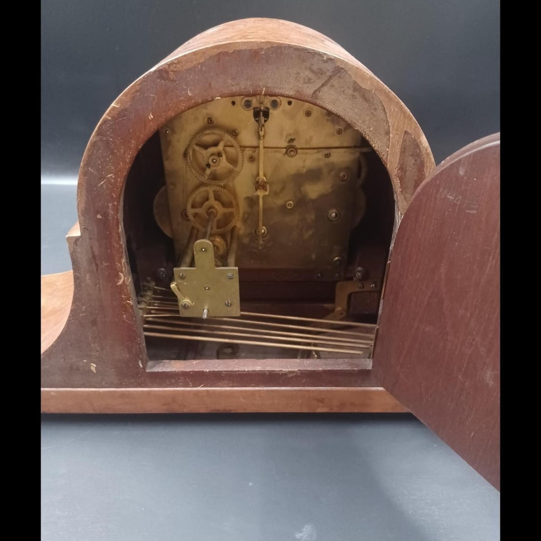 Wooden German Mantle Clock. Measures approximately 17-1/4" x 6" x 10".