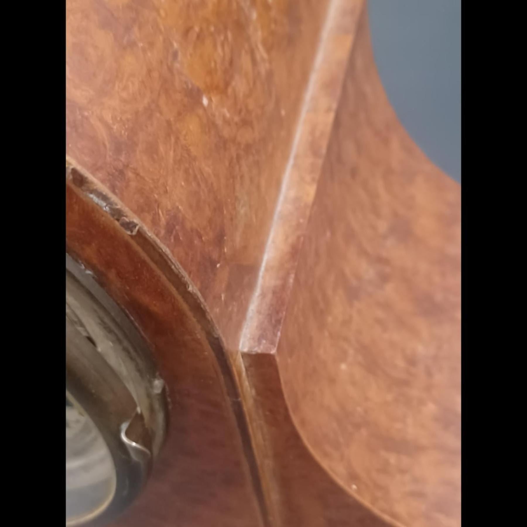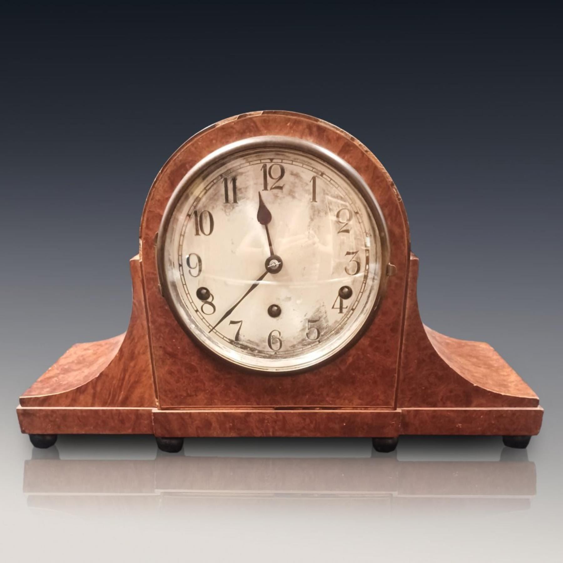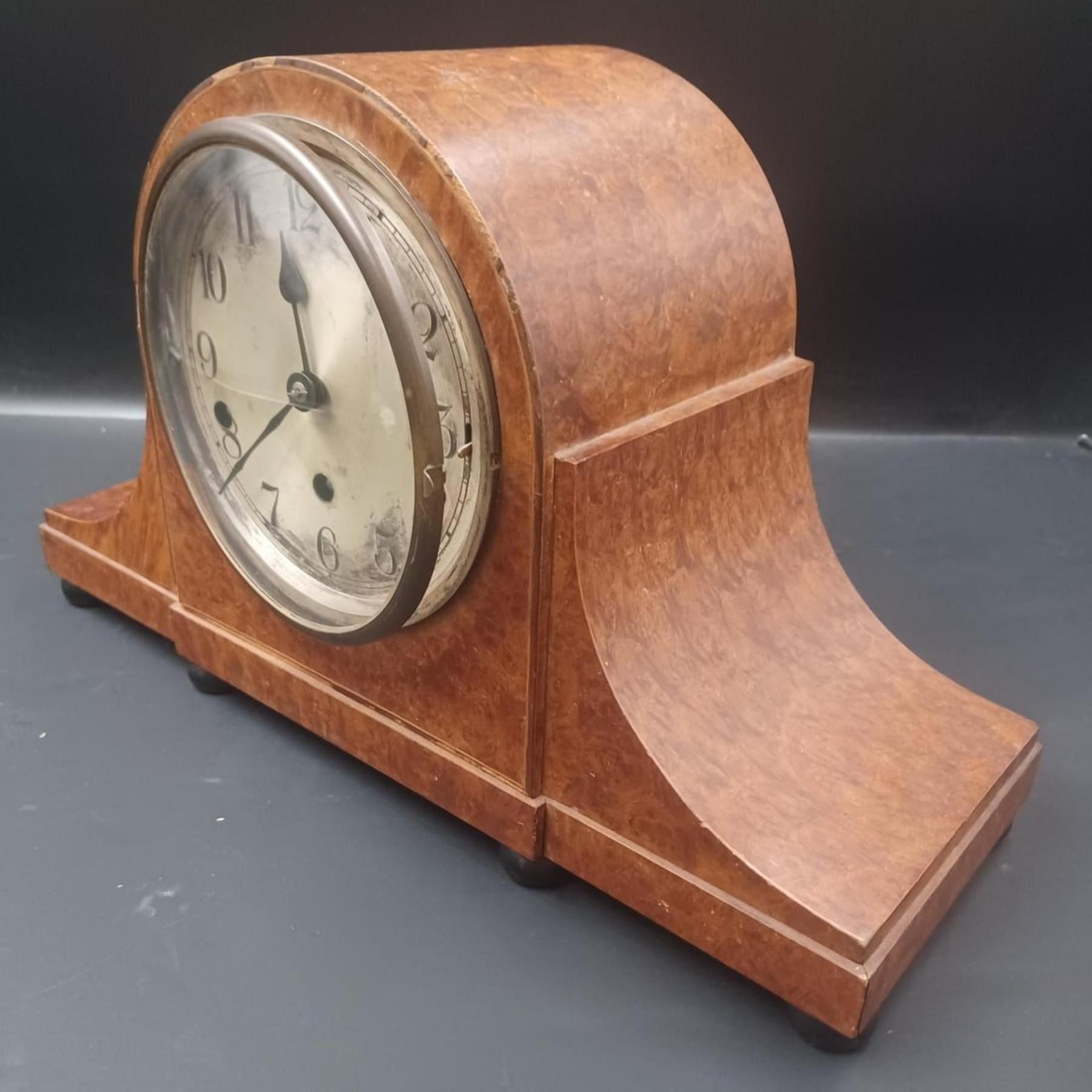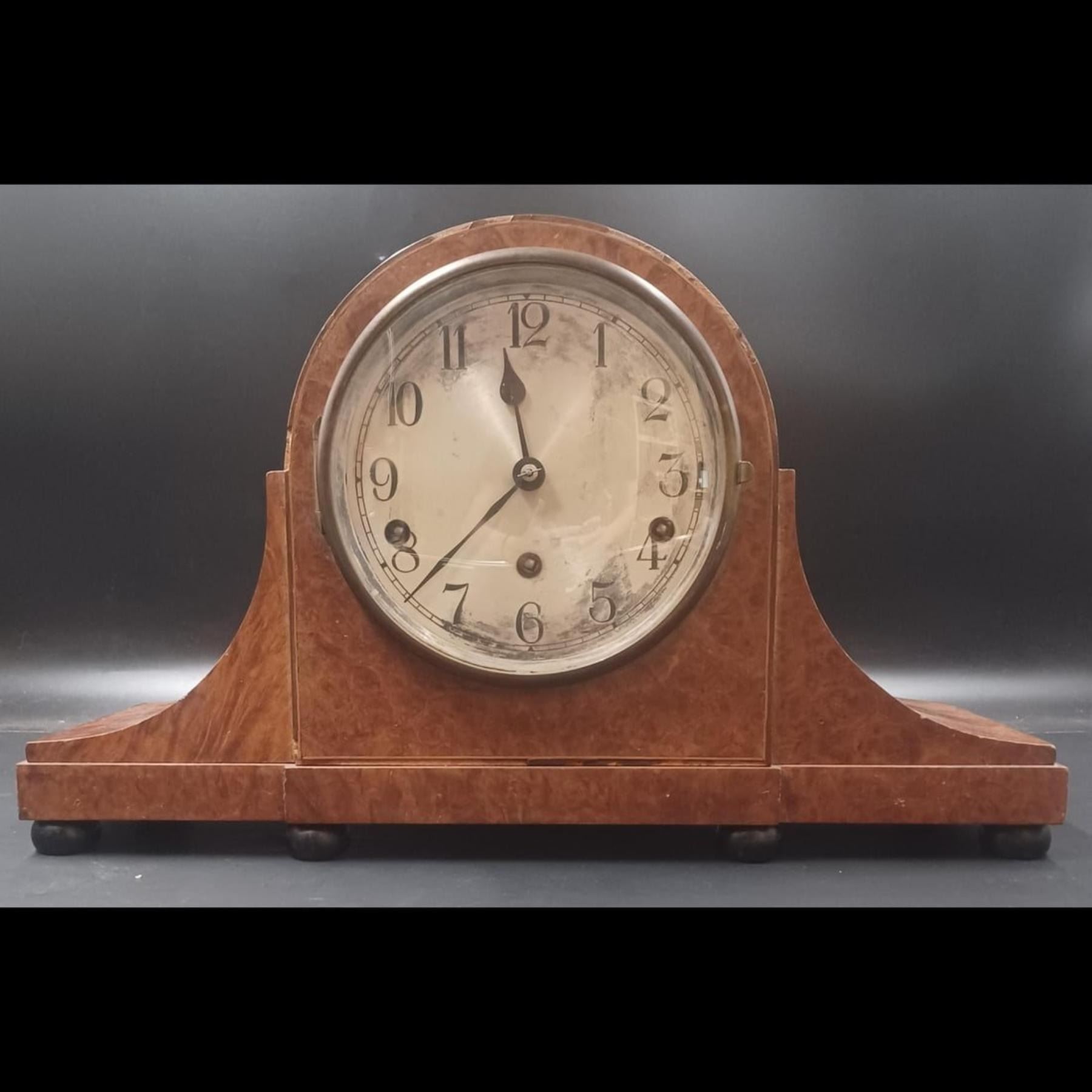 Wooden German Mantle Clock. Measures approximately 17-1/4" x 6" x 10".