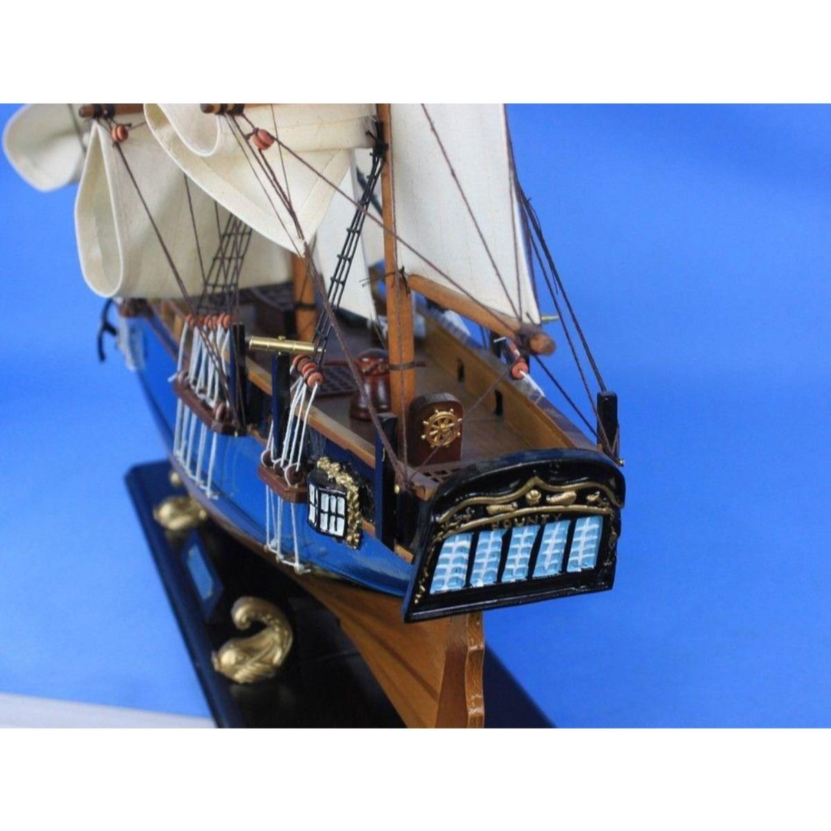 Wooden HMS Bounty Tall Model Ship 34" SOLD FULLY ASSEMBLED Ready for Immediate Display - Not a Model Ship kit Inspired by the HMS Bounty, famed exploration ship lost to mutiny, these adorable tall ships models rest easily upon any desk or shelf. Add a touch of nautical history to the decor of any room with this tall model ship. 34" Long x 8" Wide x 25" High Built from scratch by master artisans Woods used in construction include cherry, birch, maple and rosewood Detailed features include: 12 hand-sewn cloth sails Barrels and lifeboats affixed to deck Royal Navy flags Nameplate displaying the ship name "HMS Bounty" Arrives fully assembled with all sails mounted and rigging taut Sturdy wooden base with metal nameplate