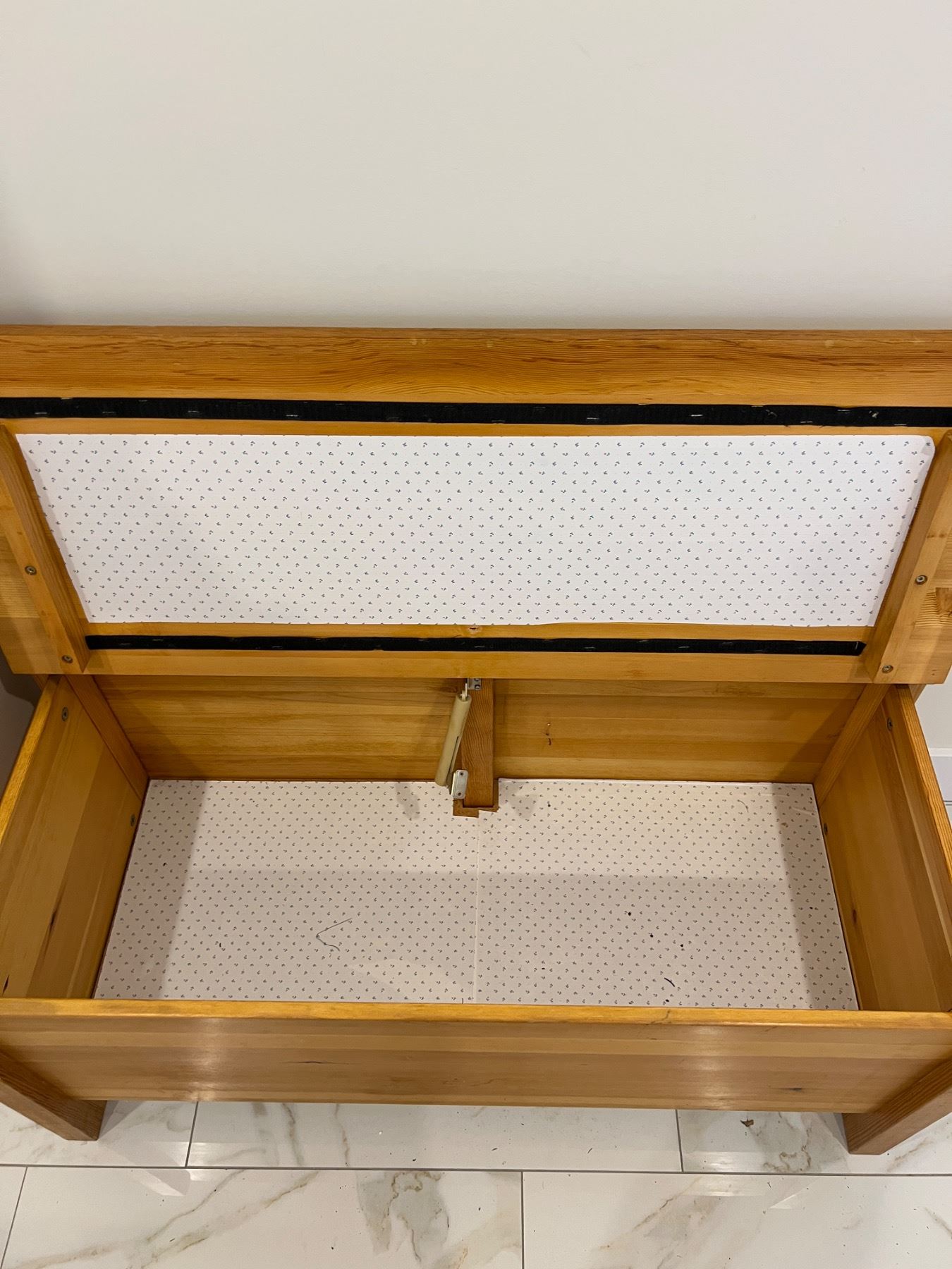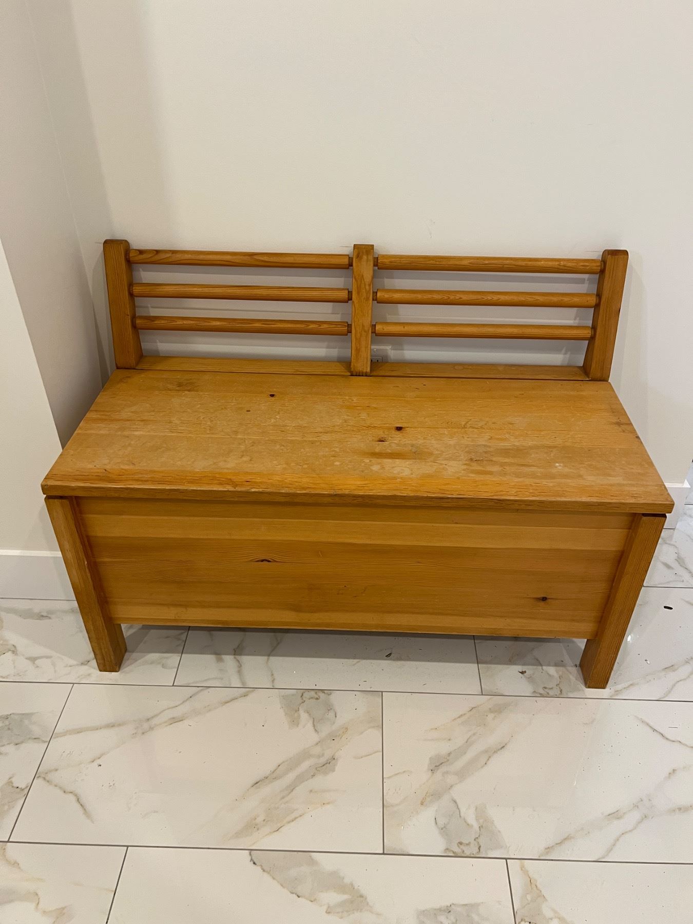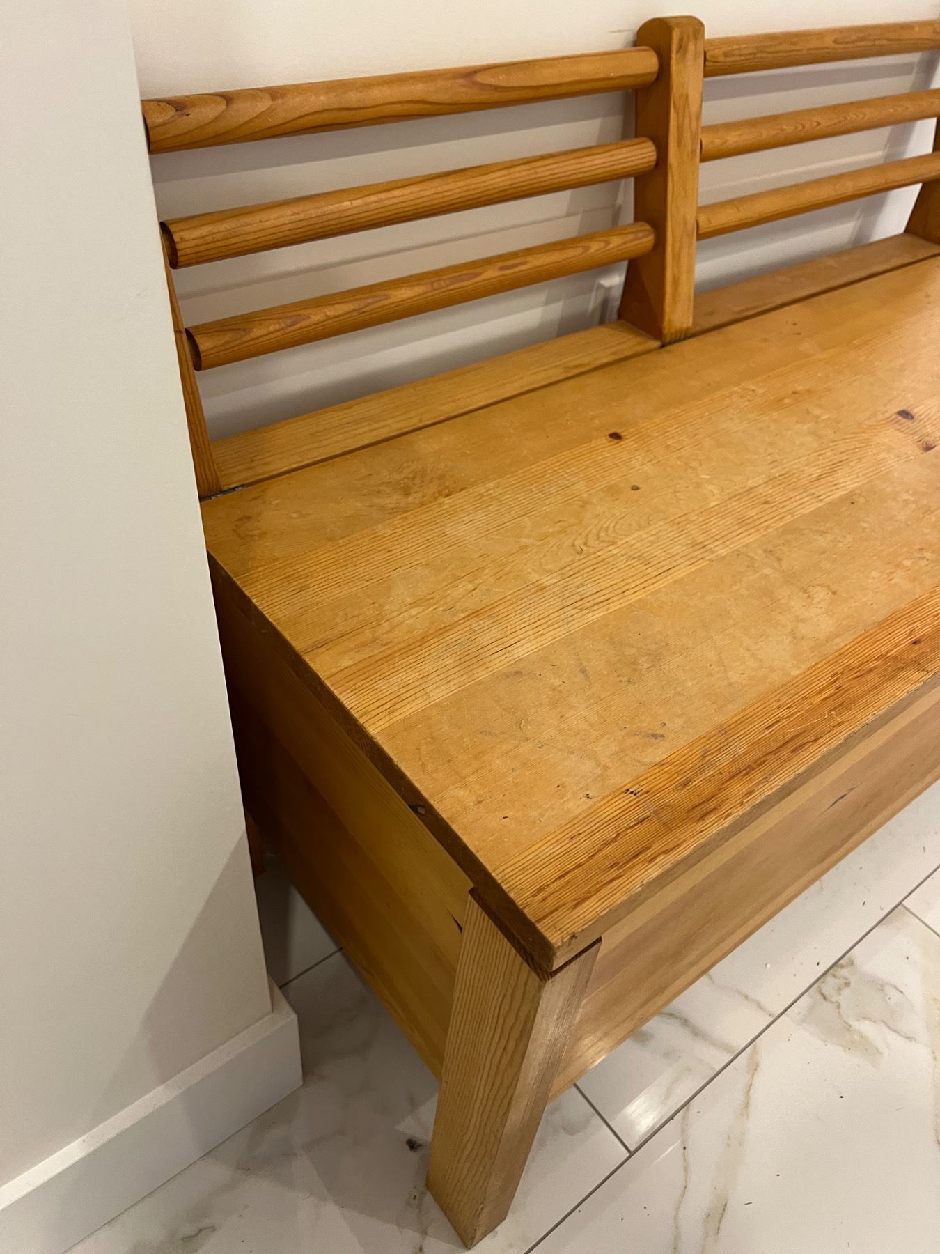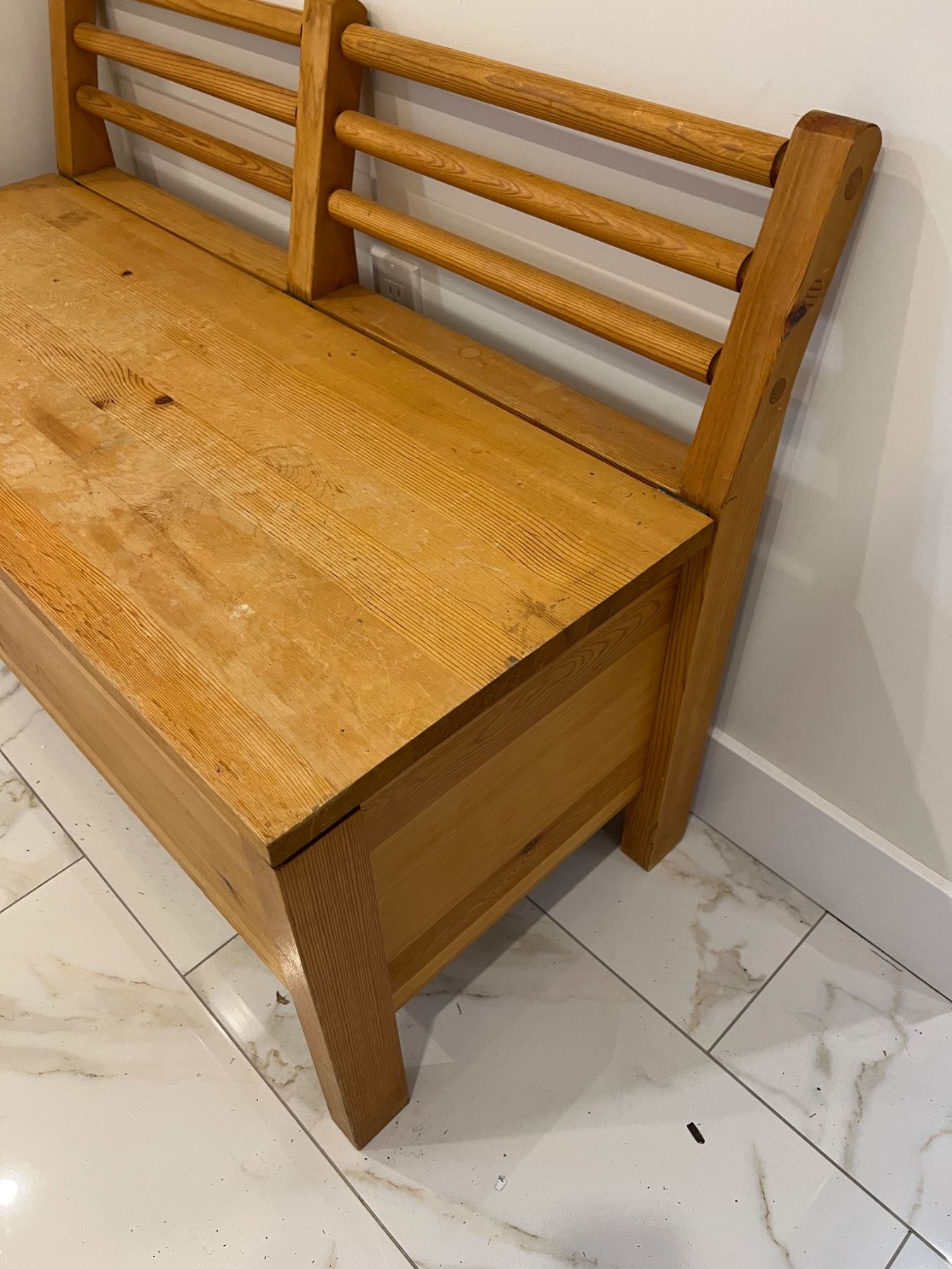 Has some scratches and wear, 39"L x 18"W x 28"H, hinge on the back is not fastened
