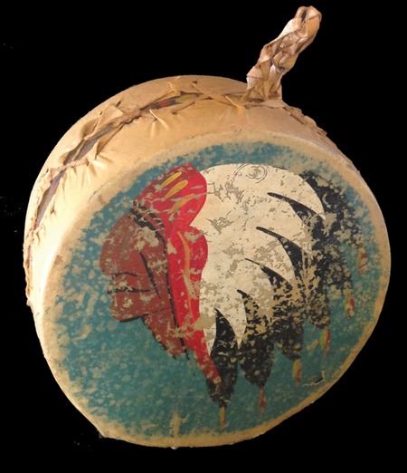 Ca. 1940s-1950, Vintage wood/stretched hide hand drum with painted Chief head figure. Fair condition, makes sound. 4" high x 8-1/2" diam.
