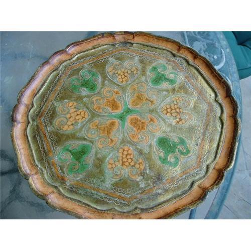 <table width="100%" border="0" cellspacing="0" cellpadding="4"><tr><td><em> </em></td></tr><tr> <td width="100%"> This gorgeous hand painted wooden tray circa 1920 has salmon and light green tones with gold leaf. Many people are making tables out of these trays to place beside a chair or in between chairs. They are also beautiful decorations or accesssories to your home. Shipping would amount to little as this item weighs only 14 ounces. Thank you for viewing. </td></tr><tr> <td> </td></tr><tr> <td>Reference #: LB_01</td></tr><tr><td>Condition:Very good</td></tr><tr><td>Year:1920</td></tr><tr><td>Country:America</td></tr><tr><td>Maker:Unknown</td></tr><tr><td>Height:.75</td></tr><tr><td>Depth:15.25</td></tr><tr><td>Width:15.25</td></tr><tr><td>Weight:14 Oz.</td></tr><tr><td>Title:Wooden Handpainted Tray</td></tr><tr><td>Style:Round w/gold leaf</td></tr><tr><td>Materials:Wood Gold Leaf Paint</td></tr><tr><td>Type:Round</td></tr><tr><td>Location:HOUSTON, TEXAS</td></tr></table>