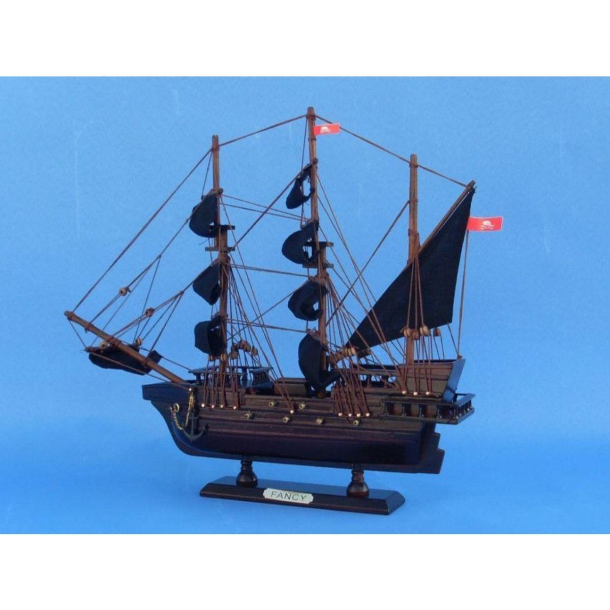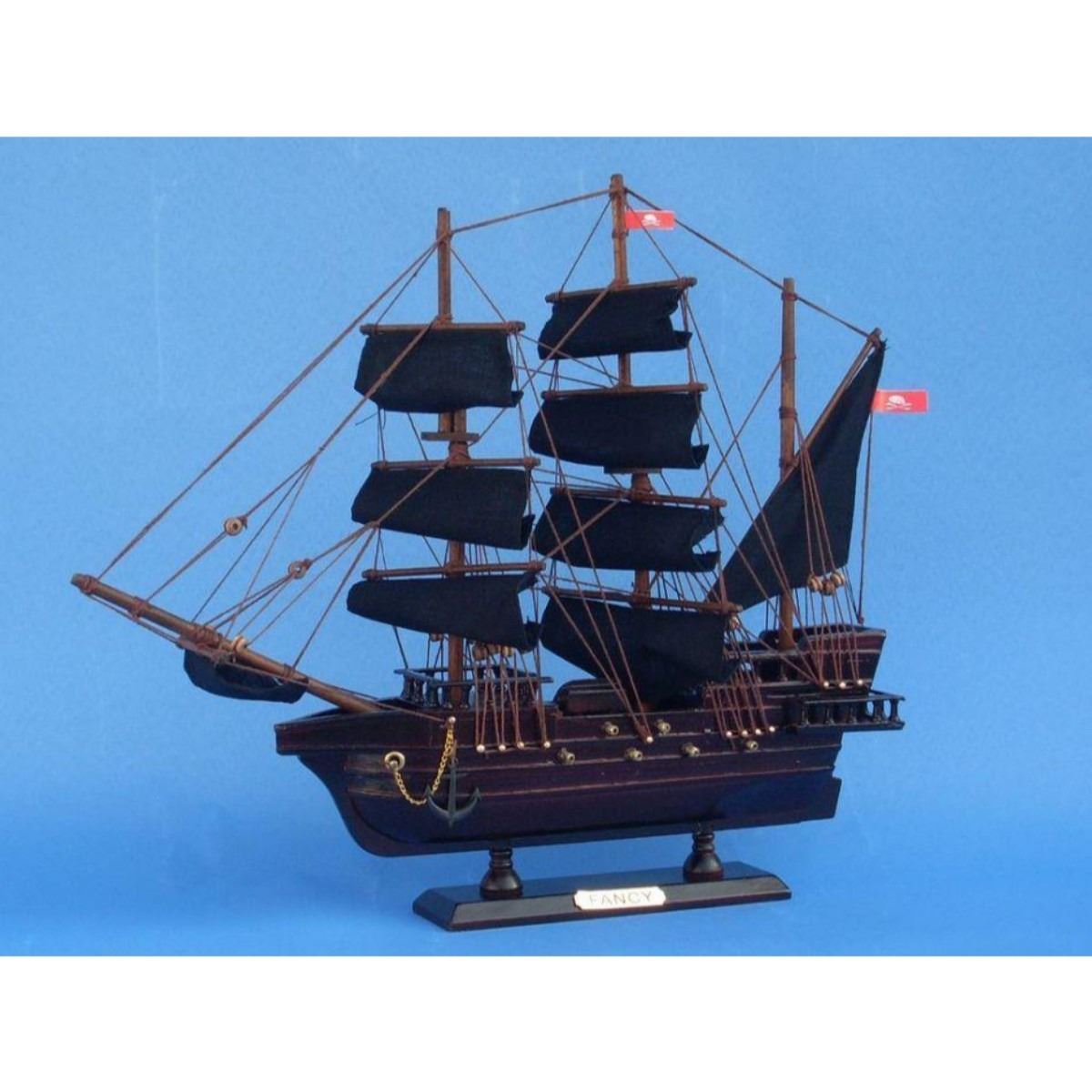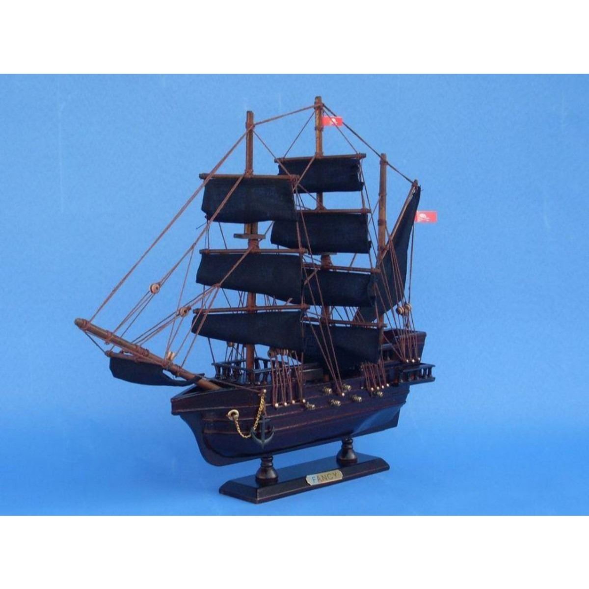 Wooden Henry Avery's The Fancy Model Pirate Ship 14" SOLD FULLY ASSEMBLED Ready for Immediate Display - Not a Model Ship kit Set sail for high seas adventure with this pirate ship model tall ship inspired by the Fancy, flagship of notorious pirate Henry Avery. These adorable tall ships models rest easily upon any shelf or desk and this tall model ship adds a touch of brave adventure to any room’s decor. 14" Long x 2" Wide x 12" High (1:195 scale) Arrives fully assembled with all sails mounted Handcrafted wooden hull and masts High quality woods include cherry, birch, maple and rosewood Metal nameplate on wooden base identifies the ship as the The Fancy