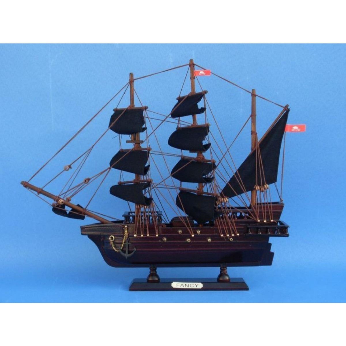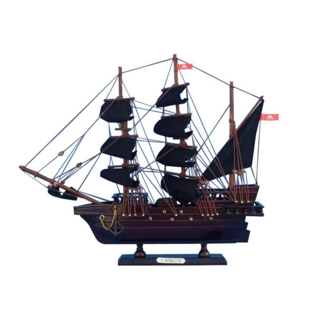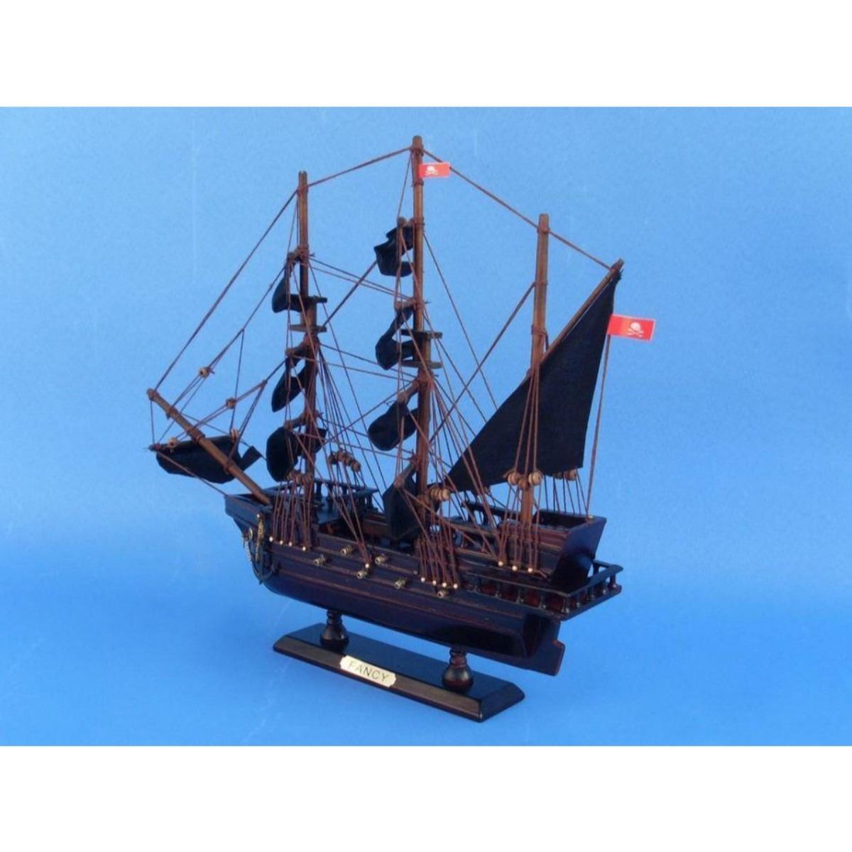 Wooden Henry Avery's The Fancy Model Pirate Ship 14" SOLD FULLY ASSEMBLED Ready for Immediate Display - Not a Model Ship kit Set sail for high seas adventure with this pirate ship model tall ship inspired by the Fancy, flagship of notorious pirate Henry Avery. These adorable tall ships models rest easily upon any shelf or desk and this tall model ship adds a touch of brave adventure to any room’s decor. 14" Long x 2" Wide x 12" High (1:195 scale) Arrives fully assembled with all sails mounted Handcrafted wooden hull and masts High quality woods include cherry, birch, maple and rosewood Metal nameplate on wooden base identifies the ship as the The Fancy