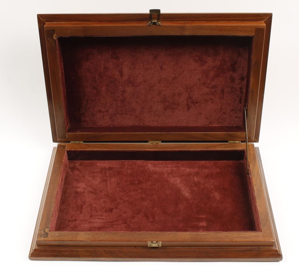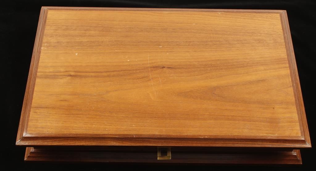 Approx 17"x11"x3" exterior dimensions with 145"x7.75"x2.25" internal dimensions. No lock. Hardwood. A few scratches and dings in the top surface finish.