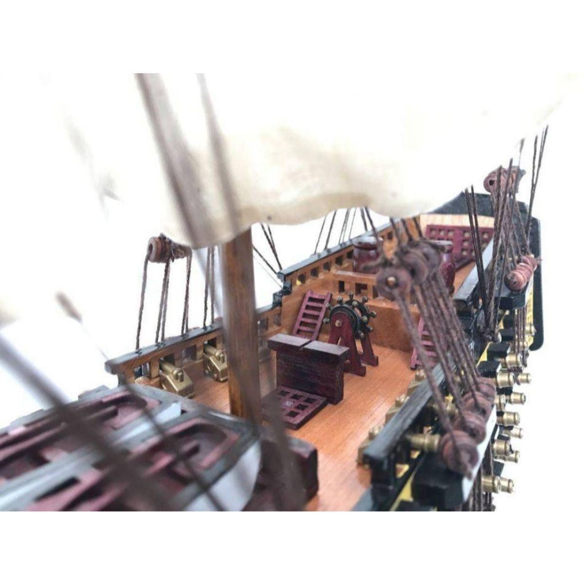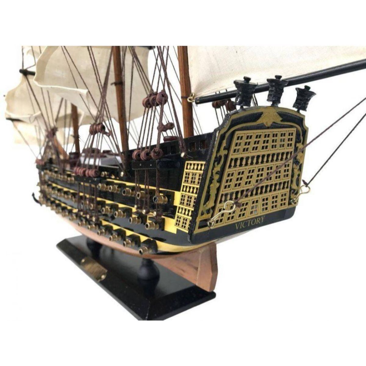 Fine craftsmanship and attention to detail highlight this scale tall model ship replica of the HMS Victory, the UK's most famous fighting tall ship. Whether seated upon a shelf, desk or table, this HMS Victory tall ship model proudly displays their exquisitely-crafted features and indomitable historic and patriotic spirit. 24" Long x 4" Wide x 17" High (1:115 scale) Built from scratch by master artisans High quality woods include cherry, birch, maple and rosewood Gun ports actually cut into the hull Amazing details with lifeboats, barrels, cannons, etc 19 masterfully stitched, heavy canvas sails hold shape and do not wrinkle Taut rigging with varied thread gauge and color Wooden display base prominently displays the nameplate: HMS Victory