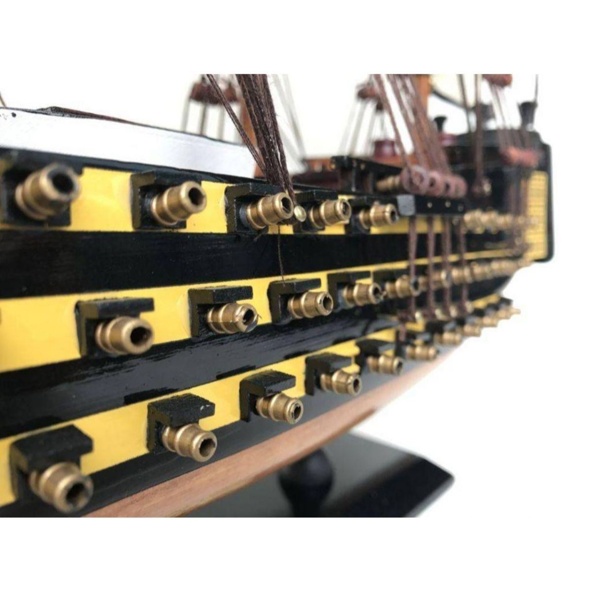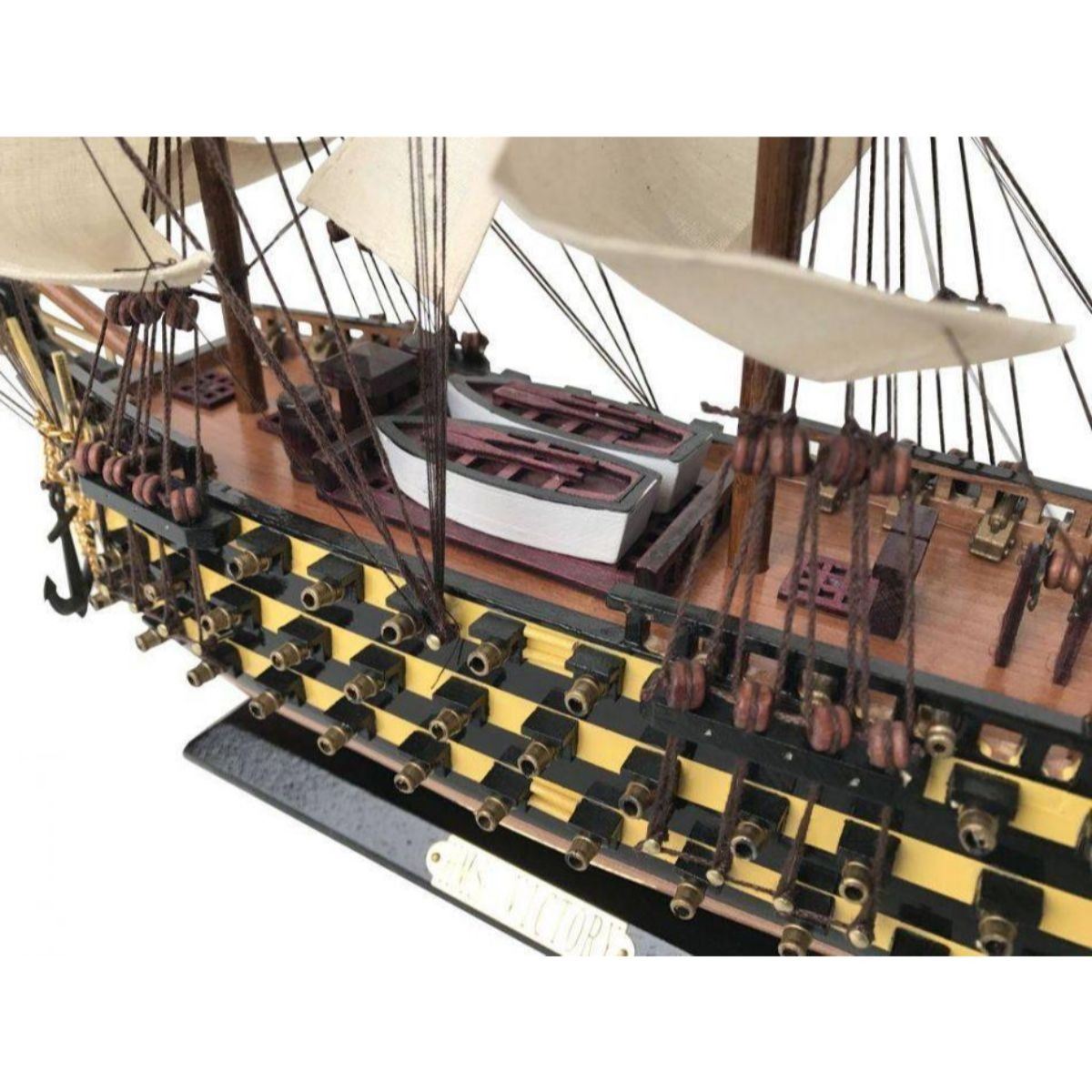 Fine craftsmanship and attention to detail highlight this scale tall model ship replica of the HMS Victory, the UK's most famous fighting tall ship. Whether seated upon a shelf, desk or table, this HMS Victory tall ship model proudly displays their exquisitely-crafted features and indomitable historic and patriotic spirit. 24" Long x 4" Wide x 17" High (1:115 scale) Built from scratch by master artisans High quality woods include cherry, birch, maple and rosewood Gun ports actually cut into the hull Amazing details with lifeboats, barrels, cannons, etc 19 masterfully stitched, heavy canvas sails hold shape and do not wrinkle Taut rigging with varied thread gauge and color Wooden display base prominently displays the nameplate: HMS Victory