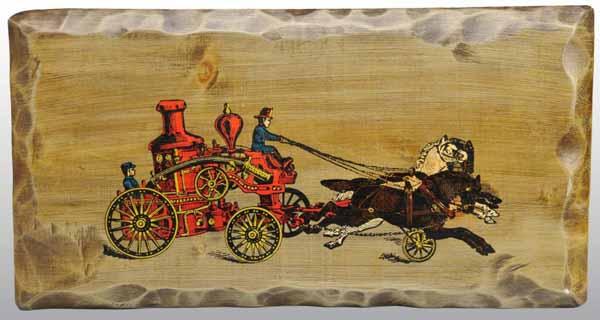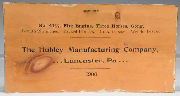 Description Shows Hubley fire pumper on front painted on wood and number 41 - 1/2 Fire Engine Three Horses Gong on back along with "Hubley Manufacturing Company Lancaster PA 1900". Very little wear. Condition (Very Good - Excellent). Size 21" x 11".