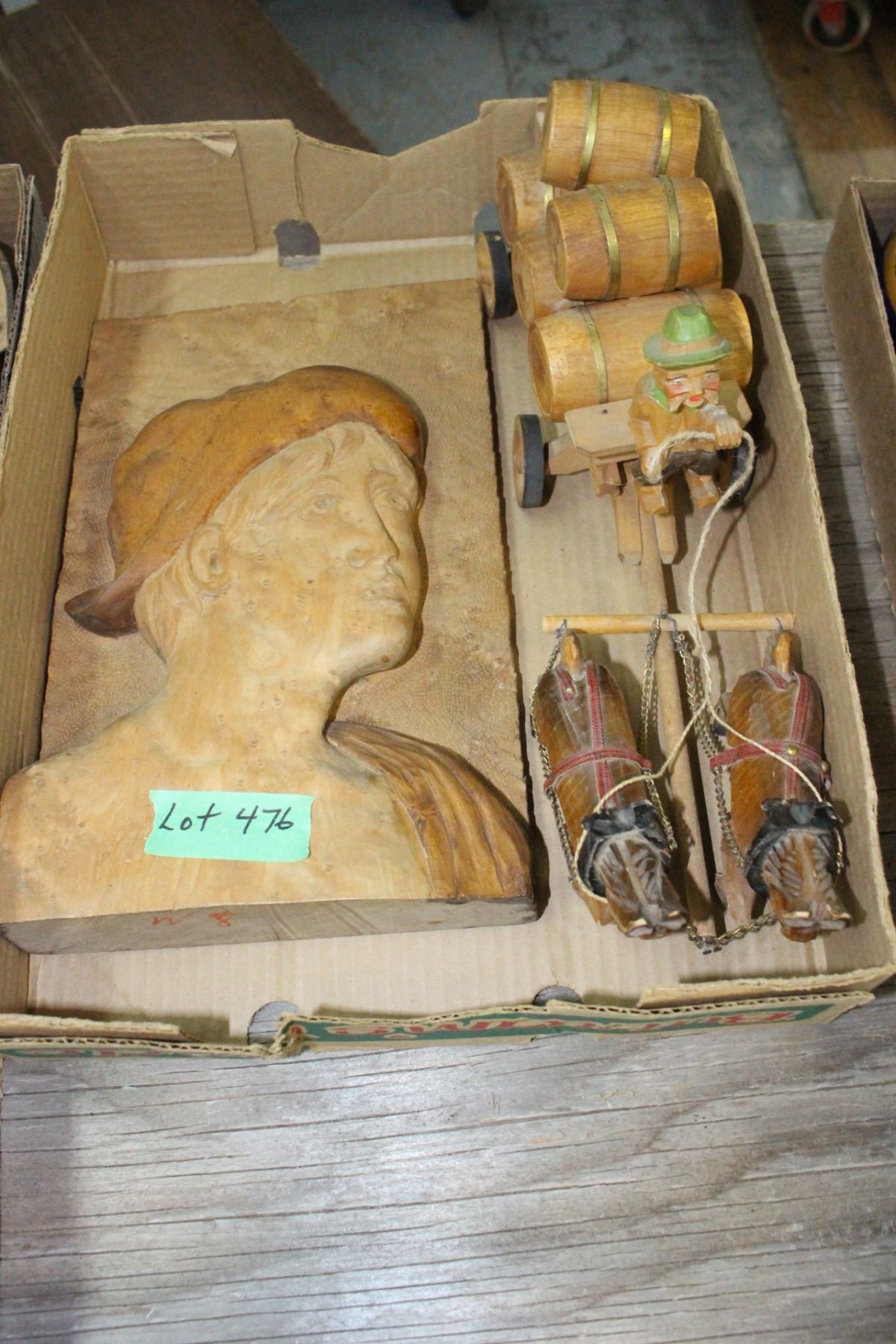 Wooden Items - 1 Carving. 1 Horse Drawn Wagon with Barrels and a Driver