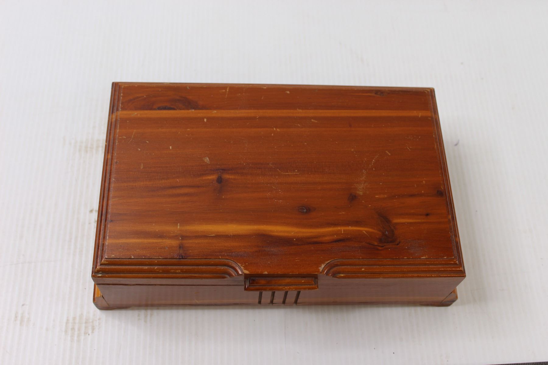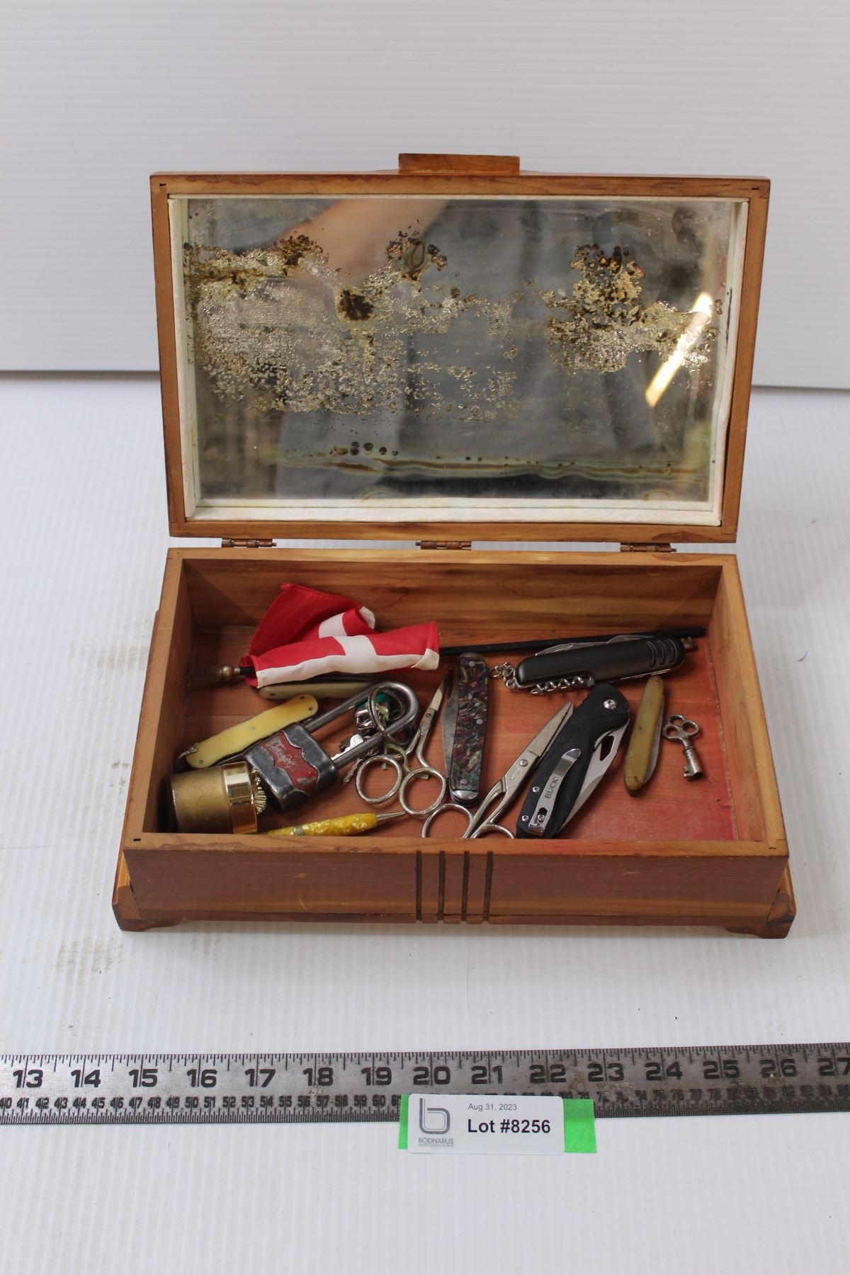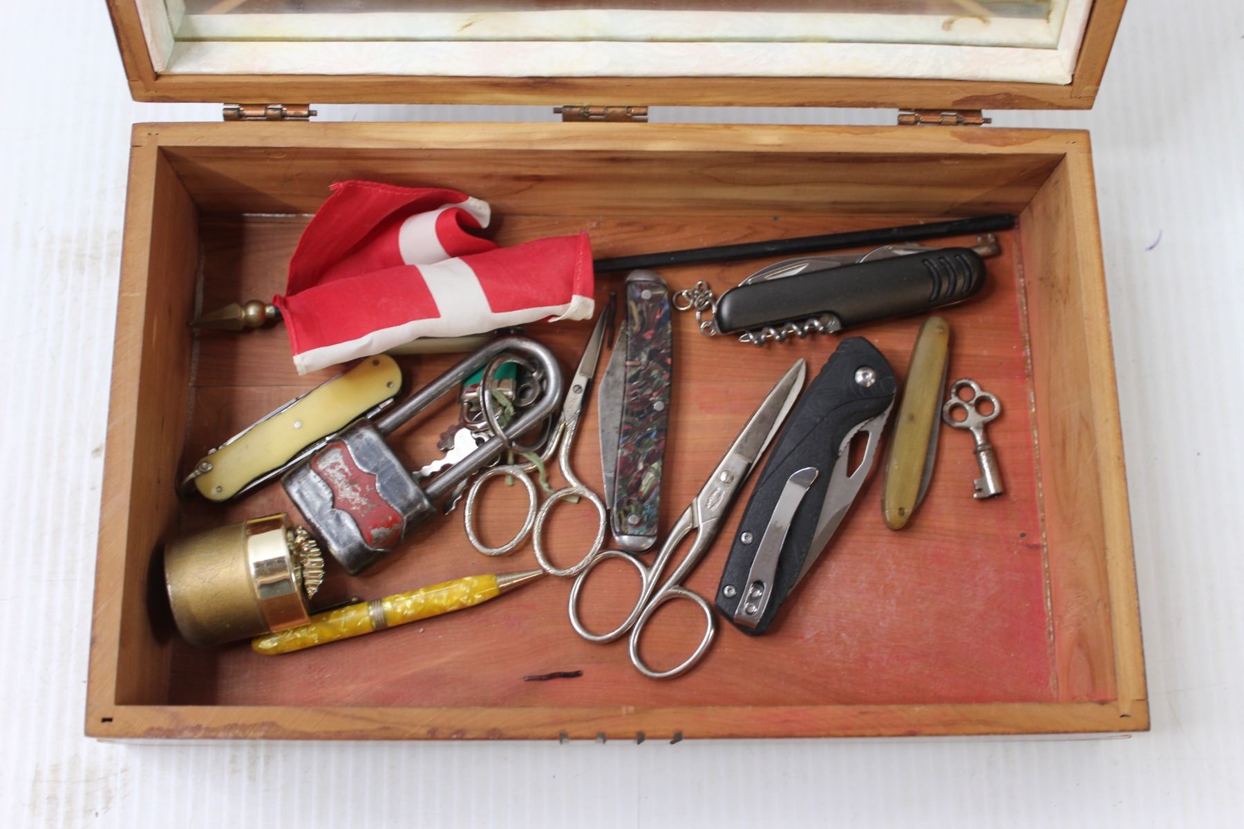 Wooden Jewellery Box w/ Assorted Pocket Knives and Misc.