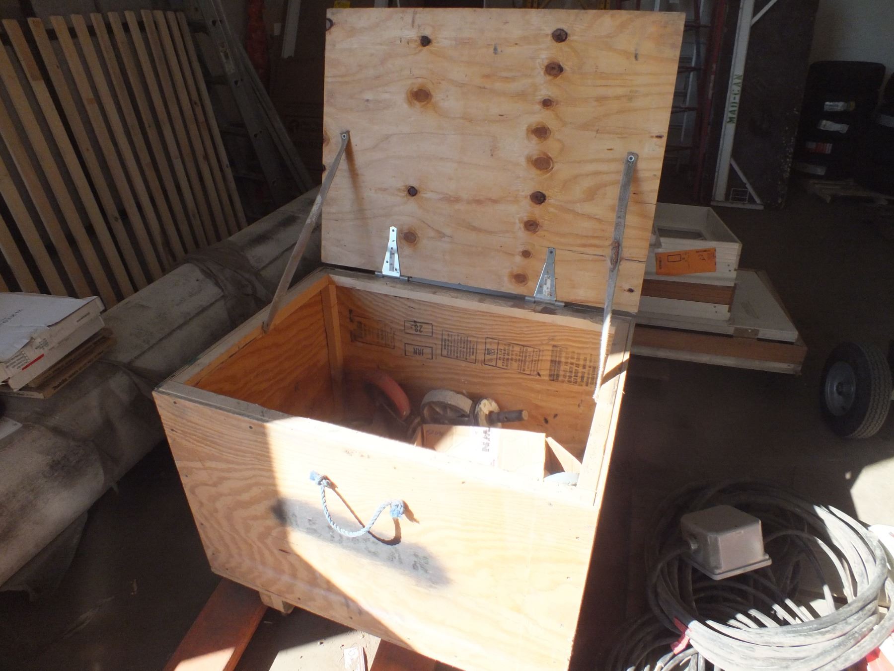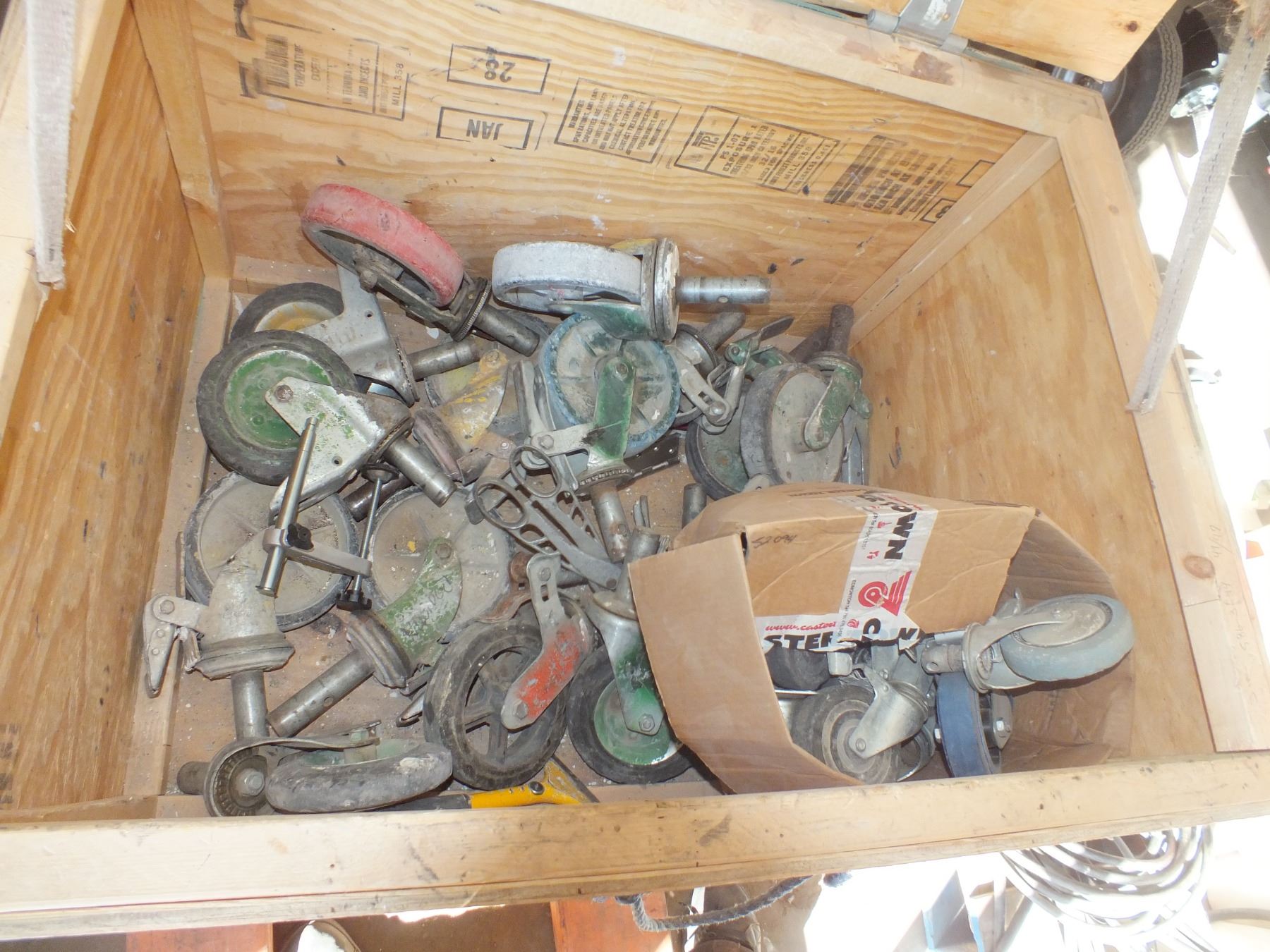 Wooden Job Box On wheels w/ Assorted Scaffolding Wheels, approx 30 wheels give or take...used
