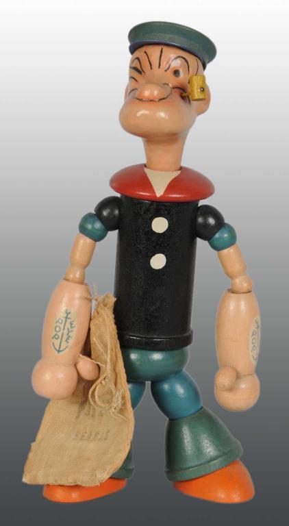 American. Appears to be all original including cap and pipe. Popeye has anchor decals on arms and one foot marked "King Features Syndicate 1932" and the other is marked "J. Chein & Co.". Also includes original Popeye sea bag with some staining. Slight crazing to face but exceptional condition for this type of item. Condition (Excellent). Size 8" T.