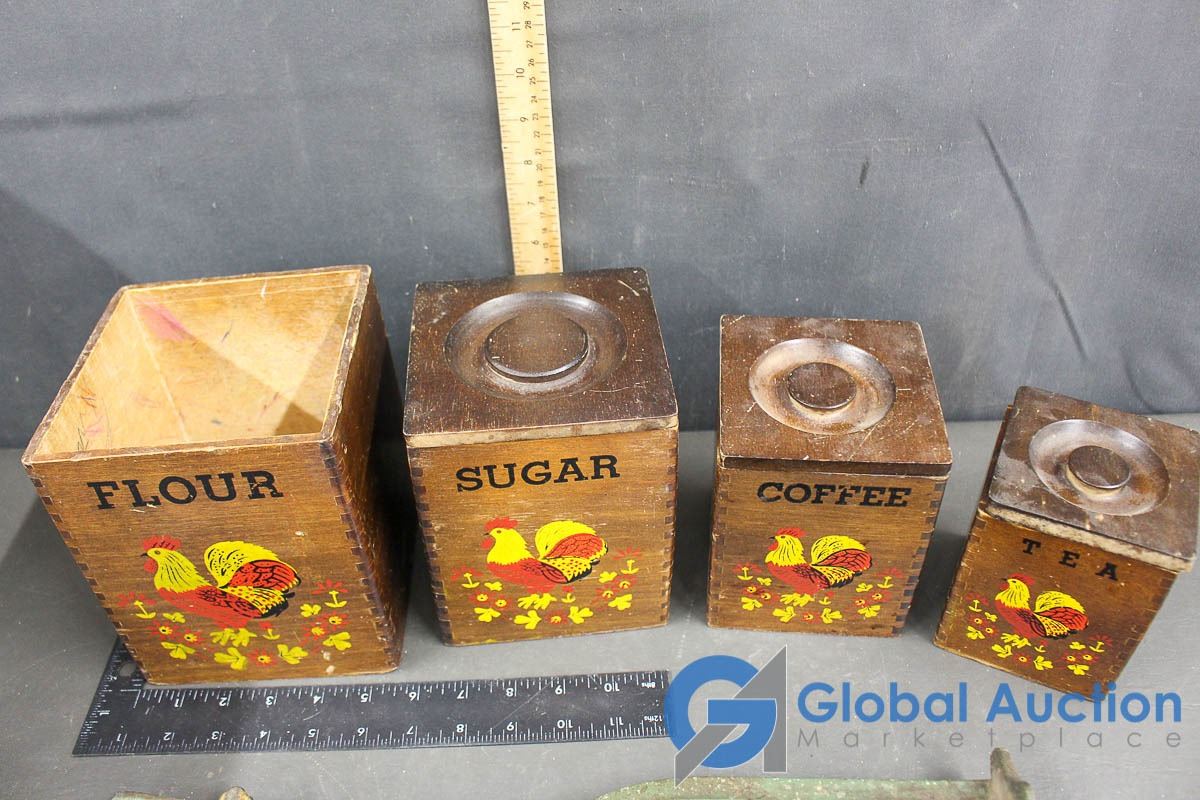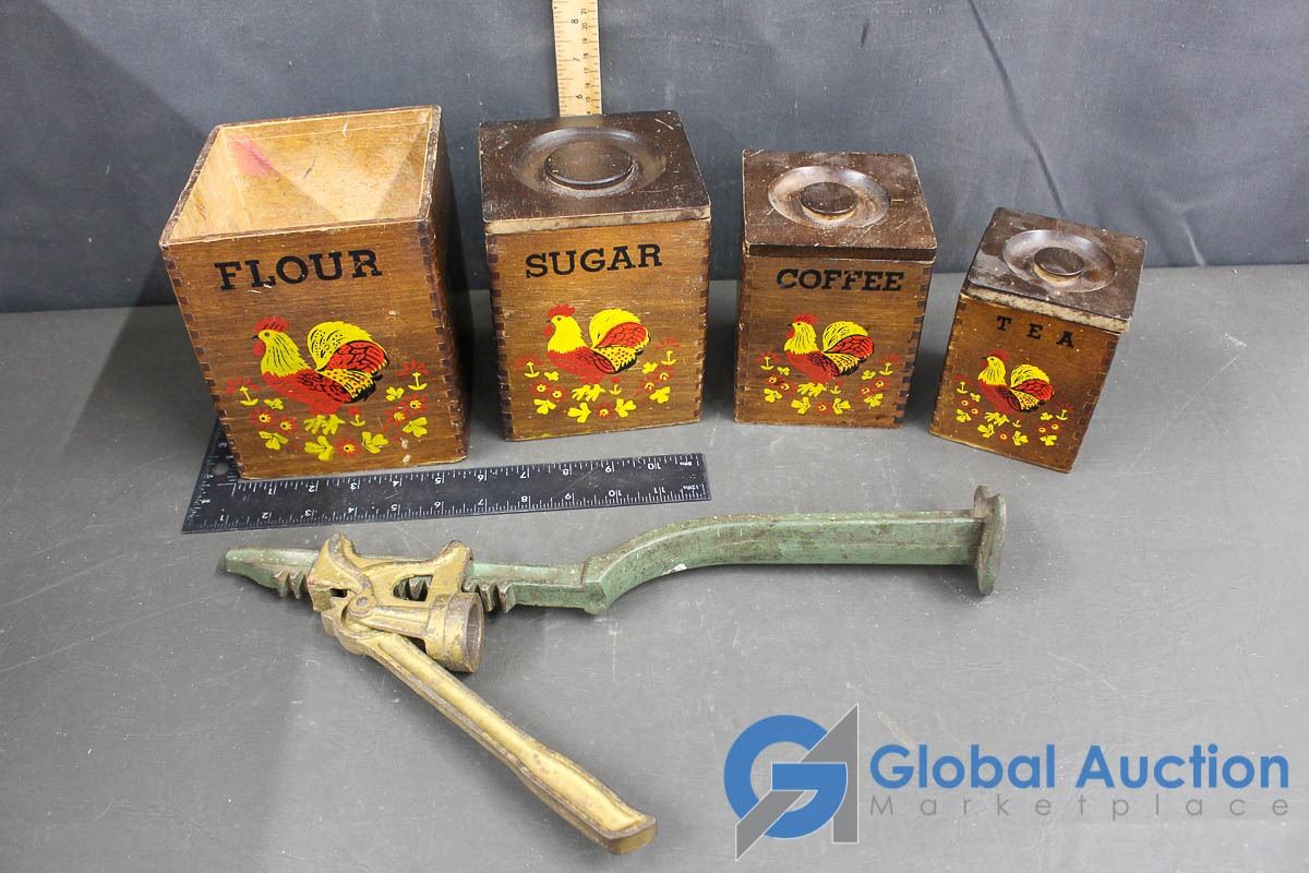 Wooden Kitchen Container (Missing One Lid) and Bottle Capper